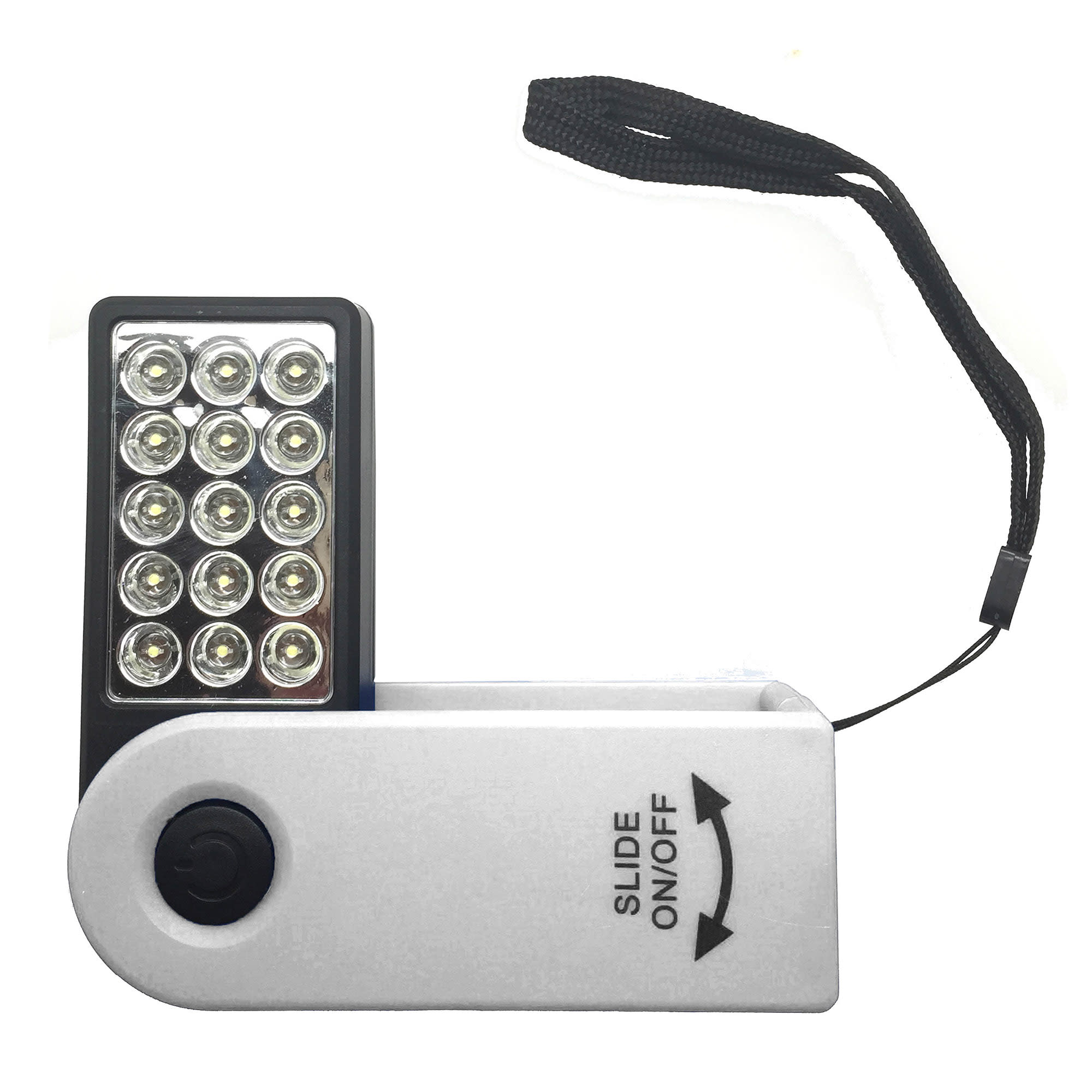 A handy man torch with 15 LED lights and 1 front light it requires 3 AAA batteries(not included) it has features of sliding on/off for 15 LED light and press button on/off for front light a magnetic end to attach to metal objects a wrist strap attached.