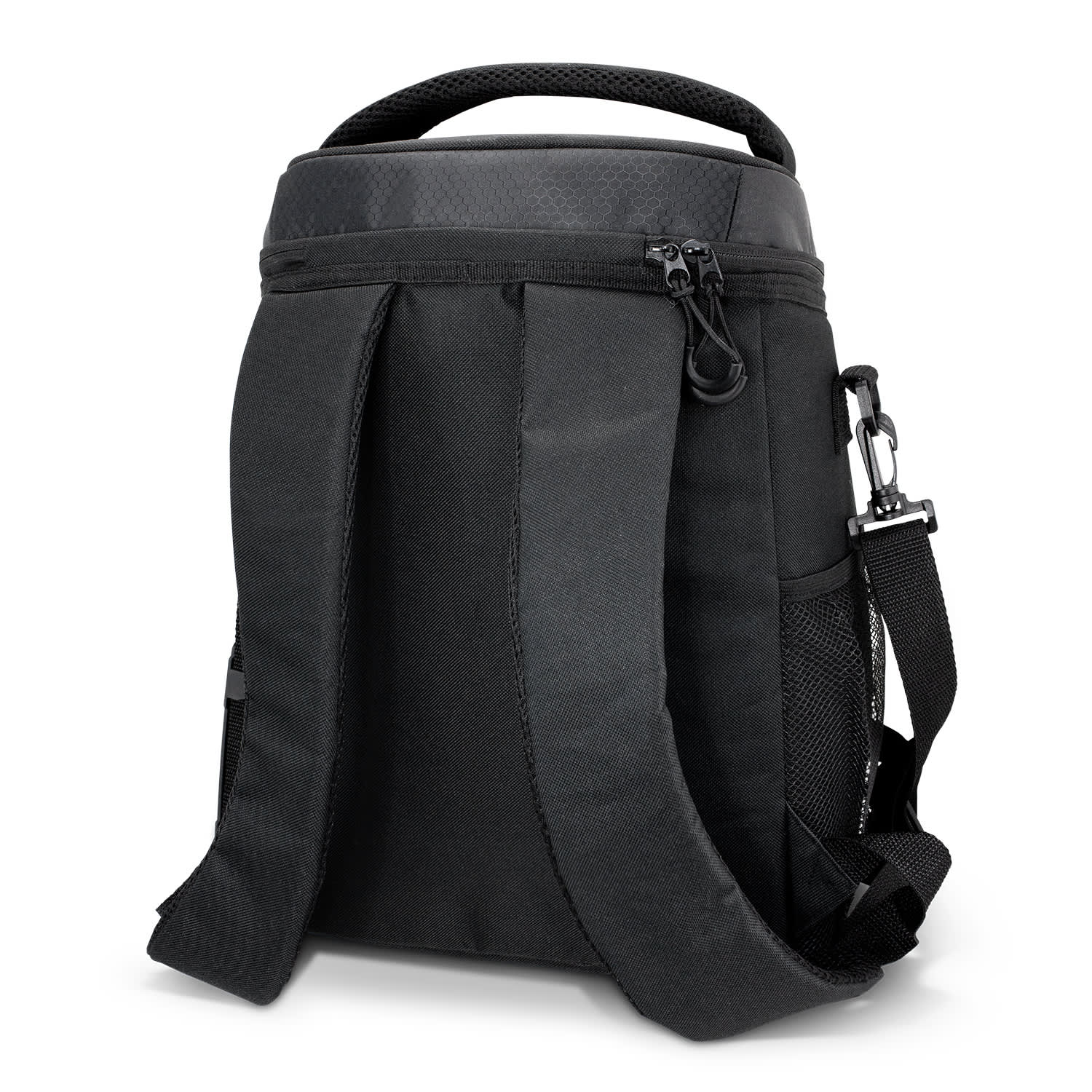 Premium 18L cooler backpack with robust design and excellent functionality. It is manufactured from a stunning combination of patterned 420D ripstop polyester and 600D polyester. The main compartment has thick PE foam insulation encased in a water-resistant PEVA inner liner. This sophisticated backpack has adjustable padded shoulder straps, a removable shoulder sling, a padded carry handle, two mesh side pockets and a large zippered front pocket.
