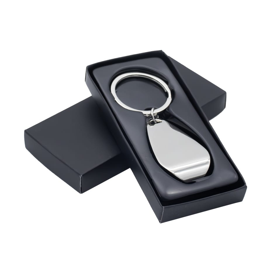 The Apri Keychain is a shiny silver metal keyring featuring a built-in bottle opener, offering both style and practicality. Itβs supplied in a sleek black box, making it a great gift or promotional item.