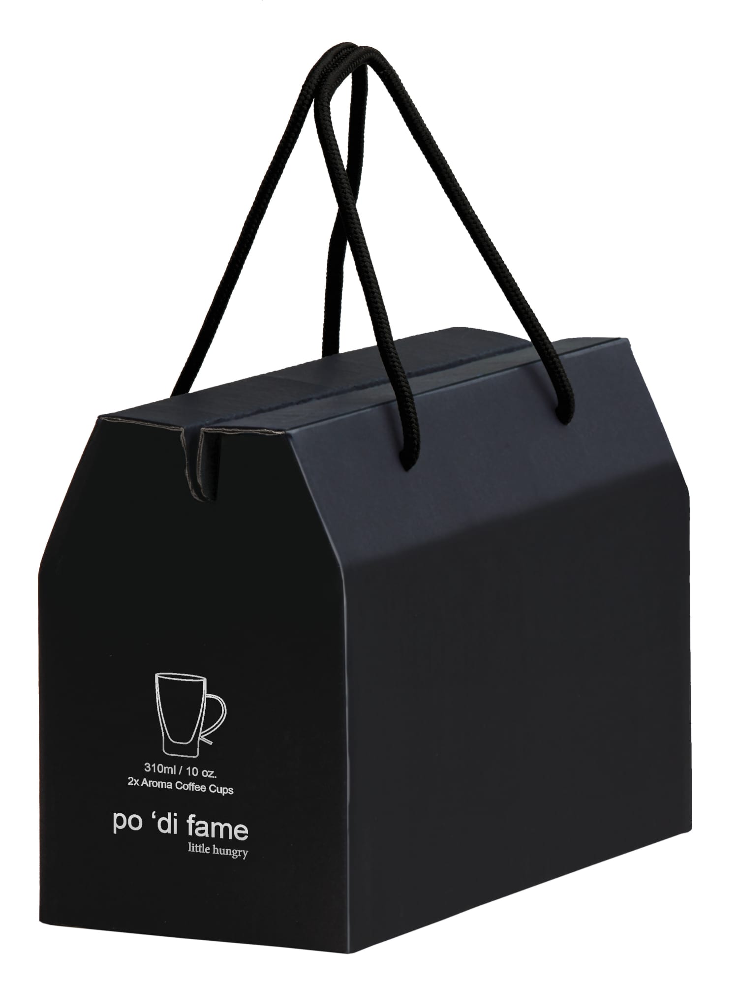 2 x 310ml Double walled glass coffee cups|Supplied: in a bespoke black po ‘di fame presentation box with carry handles (22cm W x 16.5cm H x 11cm D)|Capacity: 310ml