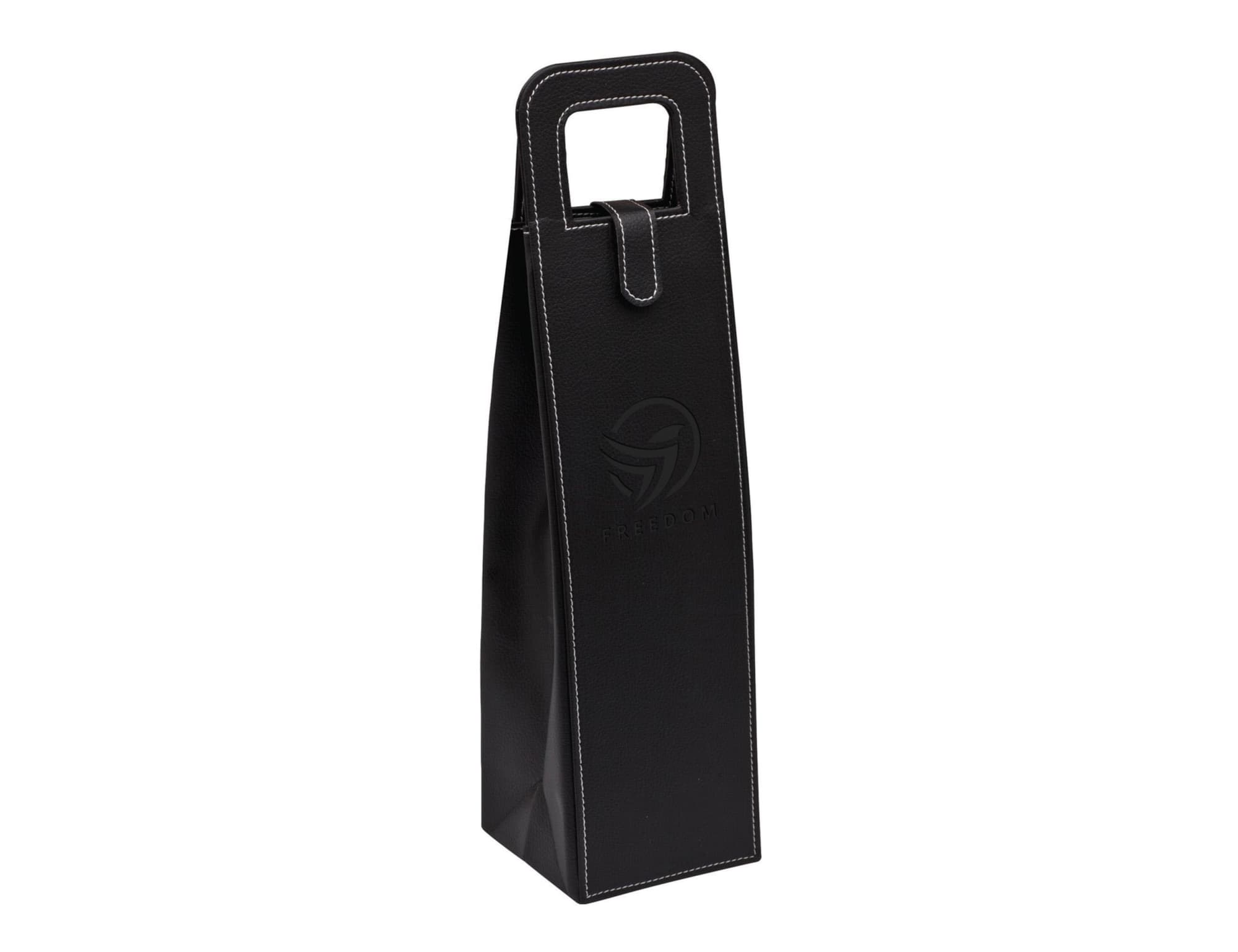 This quality BYO bag printed with your logo, makes the perfect corporate gift. Enhanced by the contrast stitching this leather-look wine bag folds flat for easy storage. Available in black.