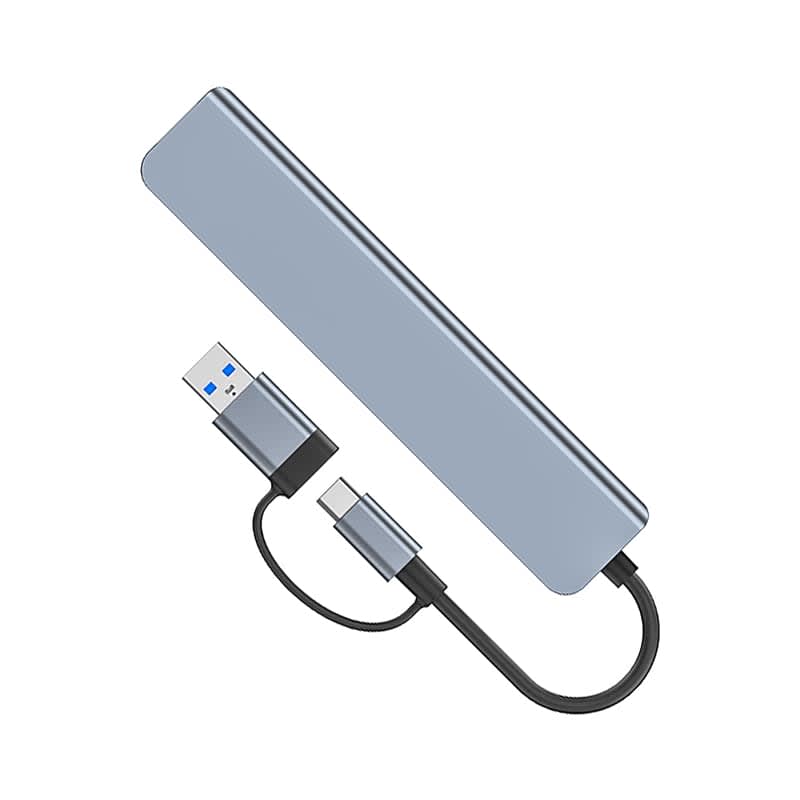 | Specifications | Dual Cable Input: Type-C (USB 3.1), tethered USB Type-A adaptor. Extension interface: 1 x USB Type-C, 2 x USB Type-A, USB3.0: transfer speed 5GB/s, 2 x USB Type-A, USB2.0, transfer speed: 480 GB/s, 1 x TF card reader, 1 x SD card reader and 1 x 3.5 mm audio jack. Backward Compatible: USB2.0 and USB1.1. Compatible with MacBook, Windows-based laptops and Android smartphones. |