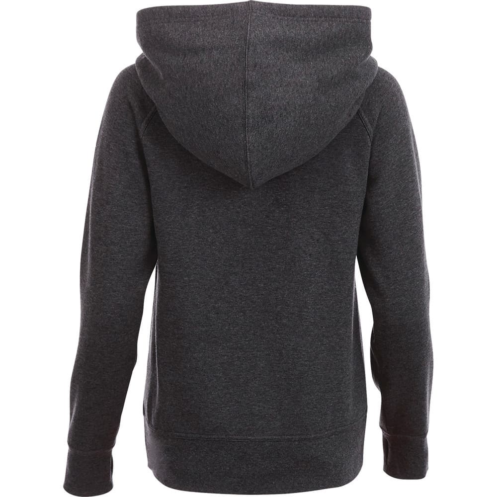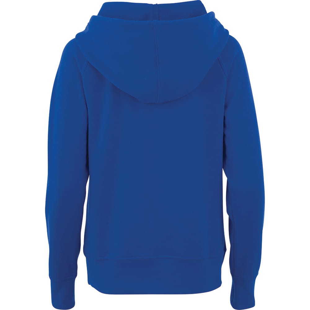 | Features | Front kangaroo pouch pocket, interior media pocket, hood with drawstring, rib knit cuffs, sleeve cuffs with thumb exit, rib knit hem, coverstitch detail, interior media exit port with cord guide, metal grommets, tearaway-cutaway main label for tagless comfort, shaped seams and tapered waist for flattering fit, contrast hanger loop at inside back neck, interior back yoke for custom branding. |