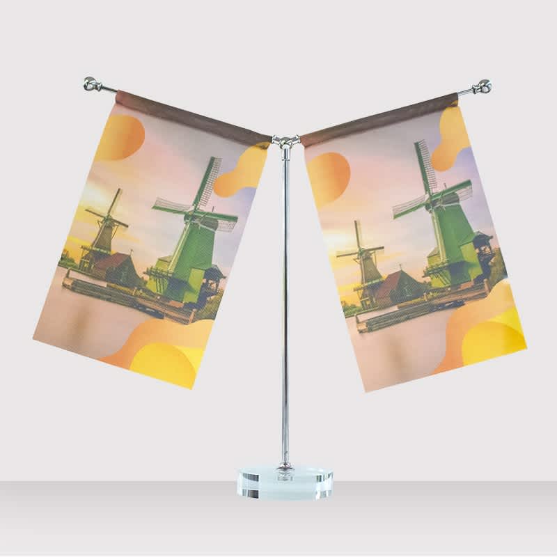 Create a custom display with our great desk flags! The flags are ideal for any event such as business meetings or conferences. Two kinds of fabrics available for these desk flags. Both of the 110g knitted polyester and satin are durable, and fade resistant. Single side and double side print options are available. Full colour sublimation printing provides an effective and eye-catching way to advertise your company or events. Each set comes with a sturdy non-slip crystal base and stainless poles, to better meet the needs of different occasions.