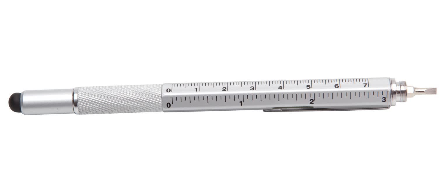 This 7-in-1 pocket tool incorporates a pen, stylus, ruler, spirit level, phillips and flat edge screwdriver all in a useful stylus pen. Available in silver.