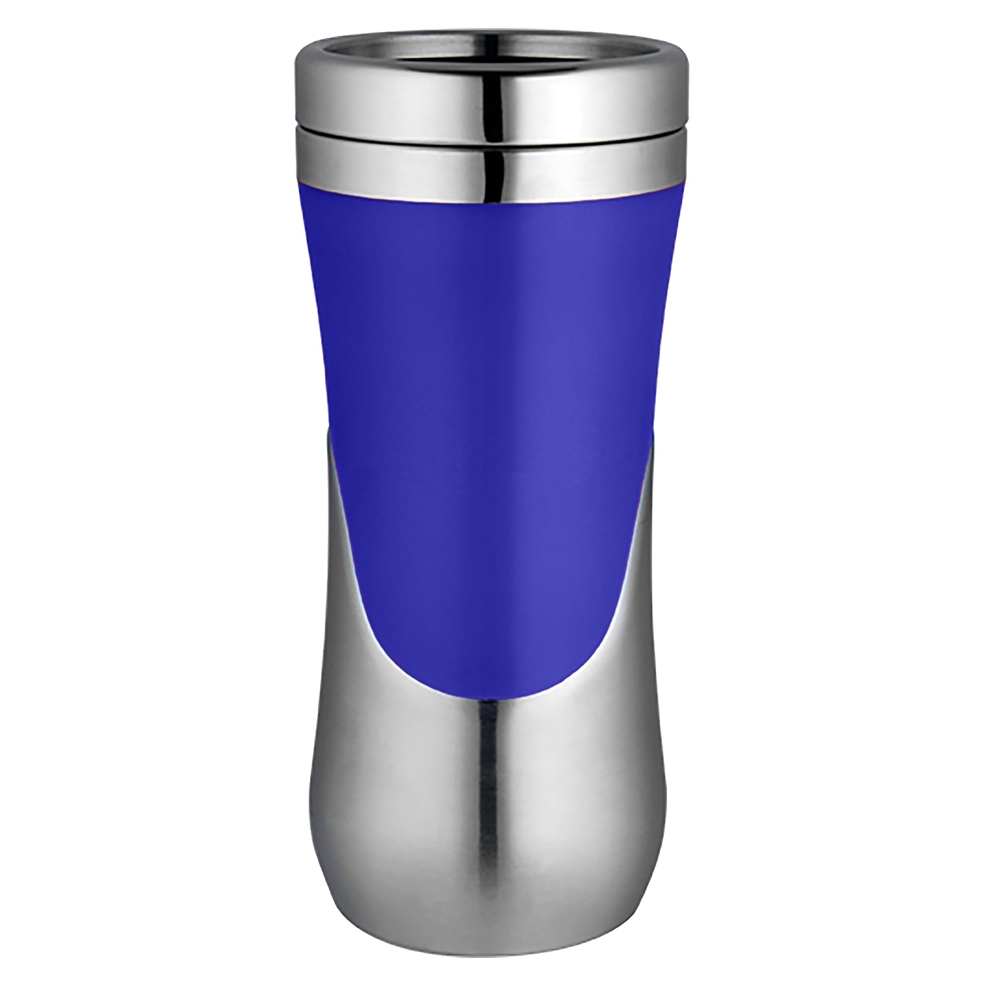 400ml double wall travel mug a special curved design with outer wall constructed by a combination of plastic and brushed stainless steel 304 grade stainless steel inner wall plastic lid with splashproof push-seal closure BPA free and handwashing is recommended.