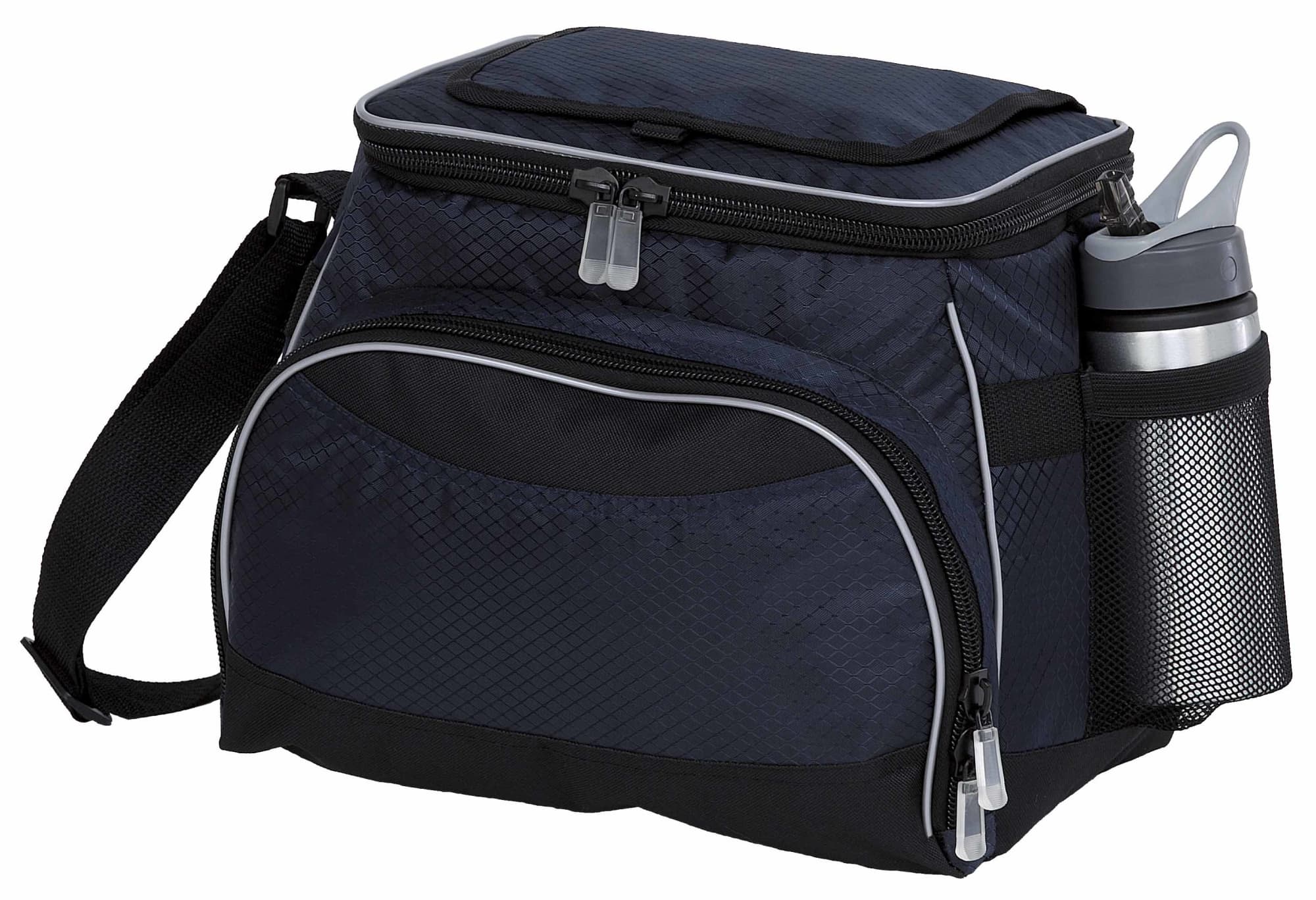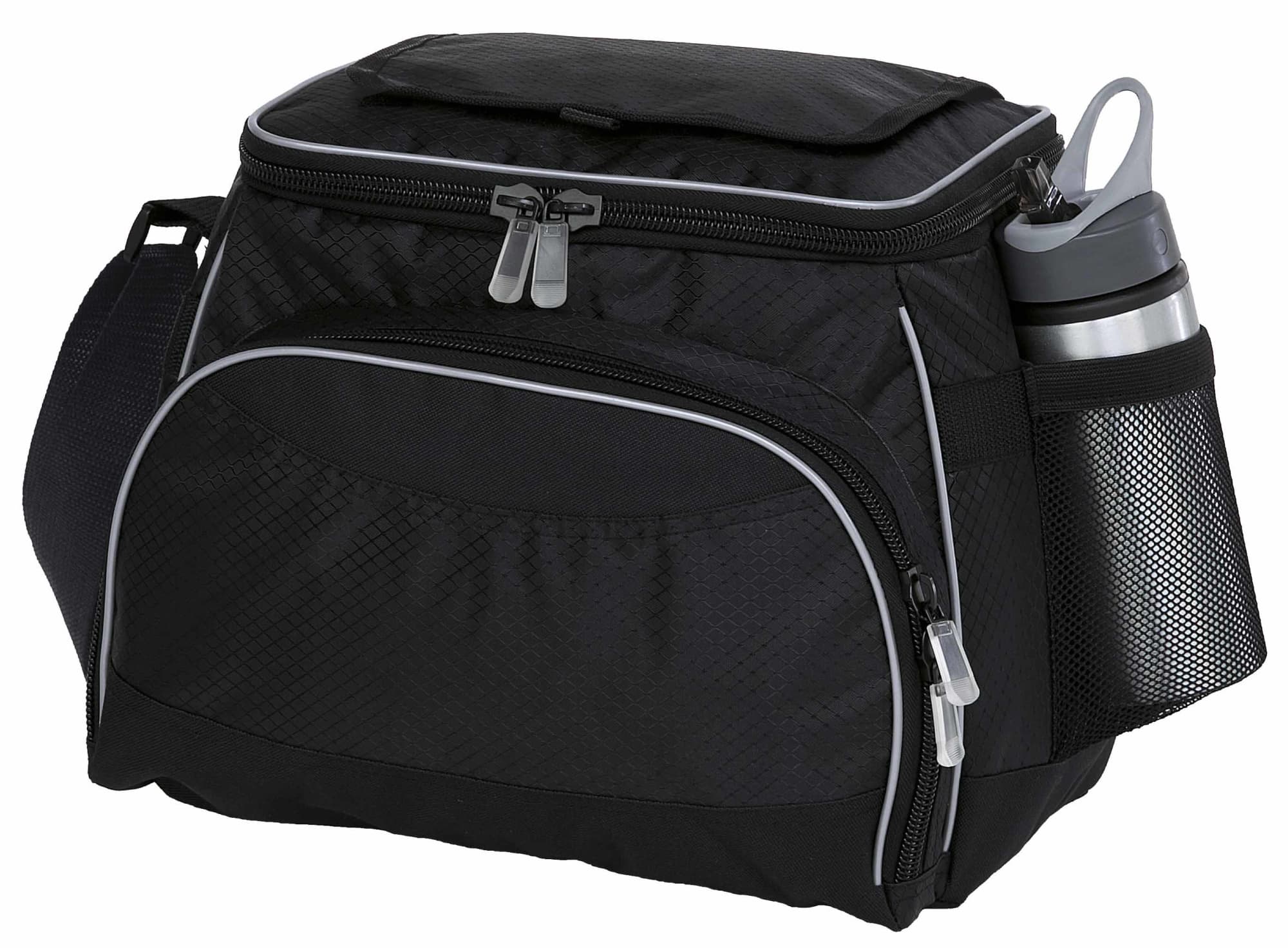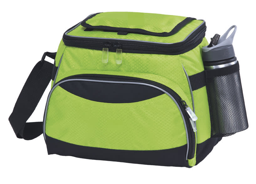 420D diamond weave ripstop polyester with PVC backing and 600D polyester with latex rubber backing|Insulated zippered main cooler compartment with protective baseboard|Pull tab and Velcro lid opening allows quick access to main compartment|Side external mesh drink bottle pocket (bottles shown not included)|Front zippered accessory pocket|Heavy duty zippers and accessories|Adjustable shoulder strap|Rubber feet for added protection|Capacity: 16 Litres