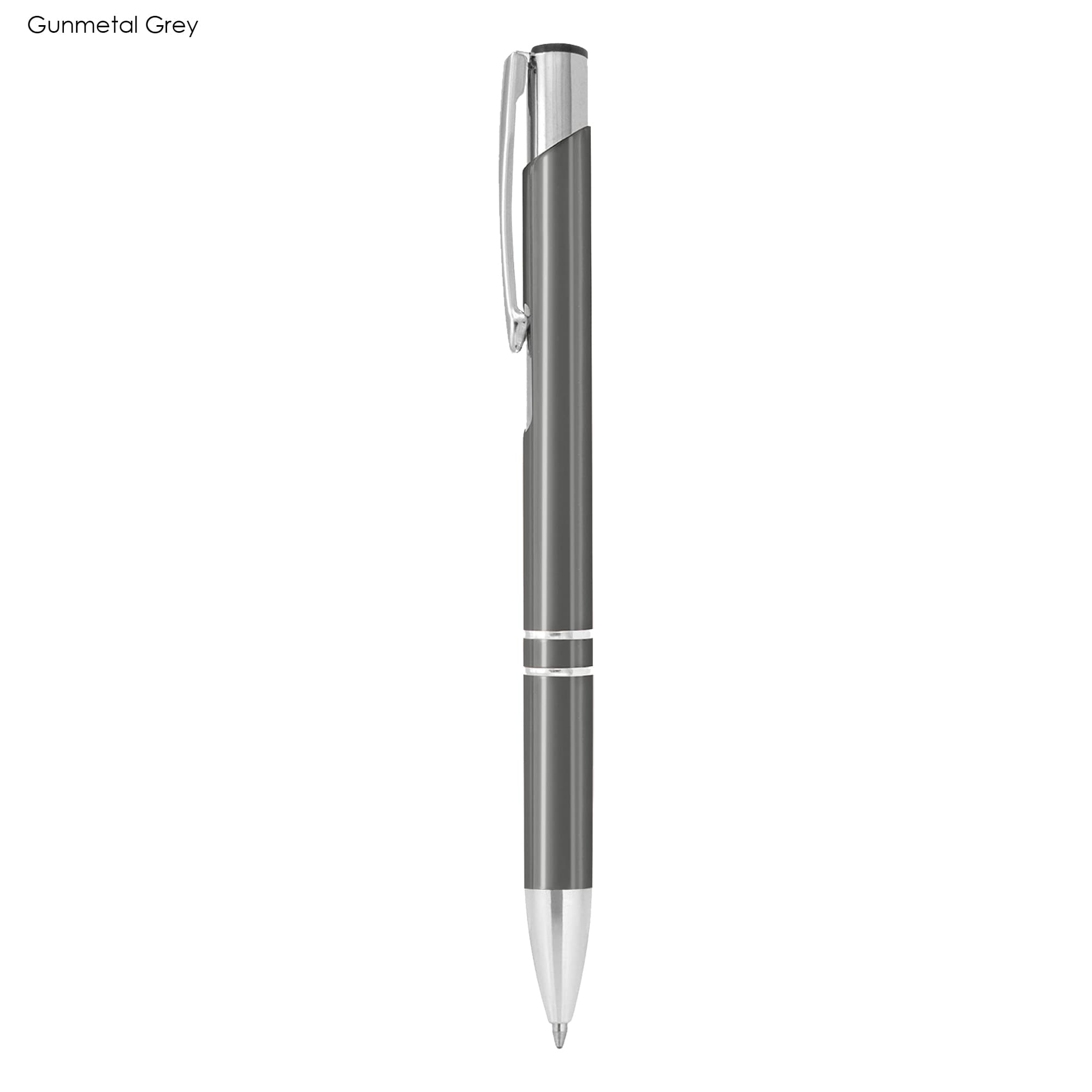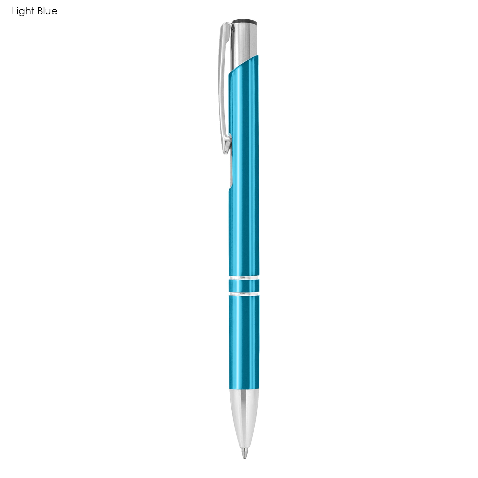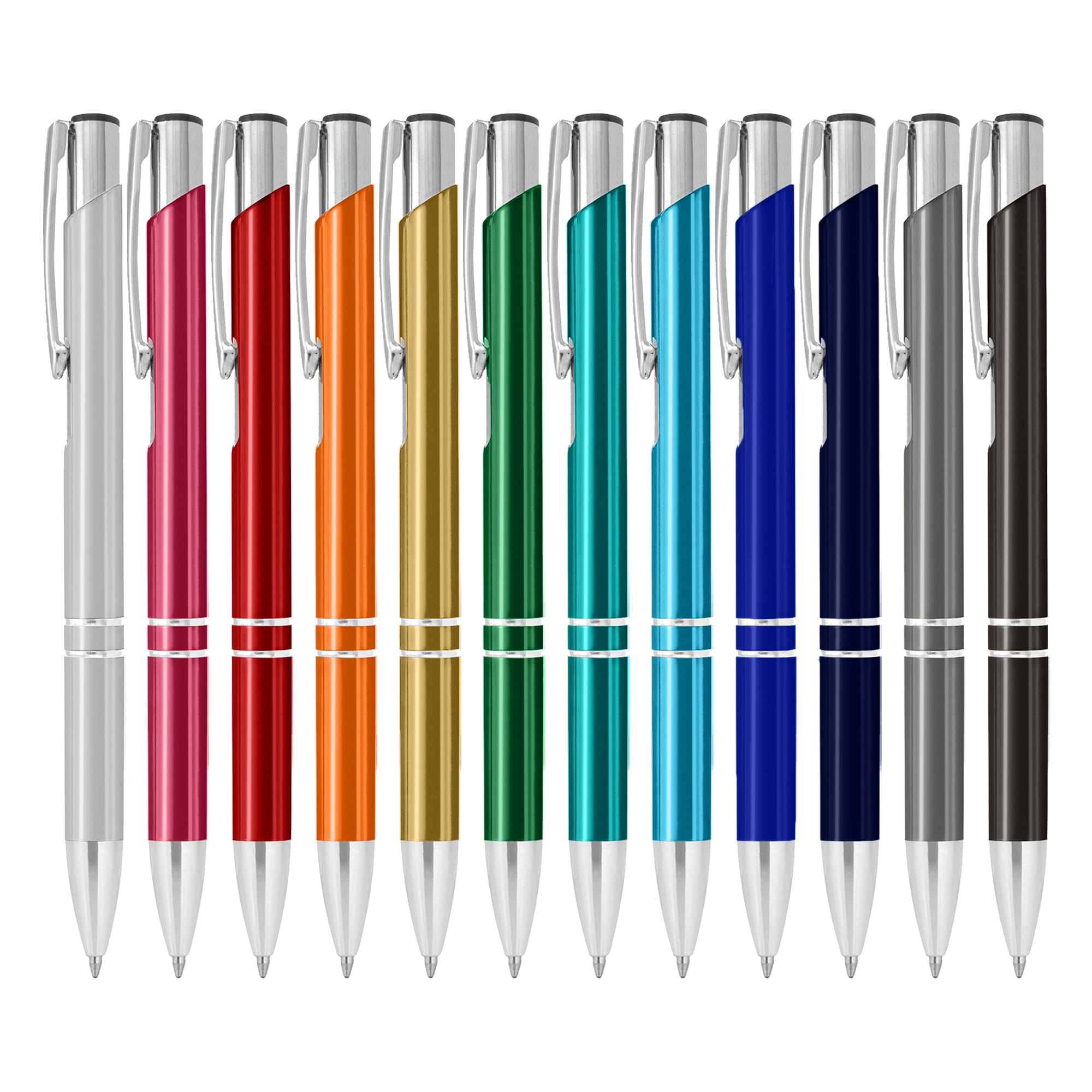 Popular aluminium stylish design pen with shiny silver fittings and metallic finishing barrel click action with plastic Parker-Type German manufactured black ink refill 1200 meters writing distance tungsten carbide ball provides you with quality writing.