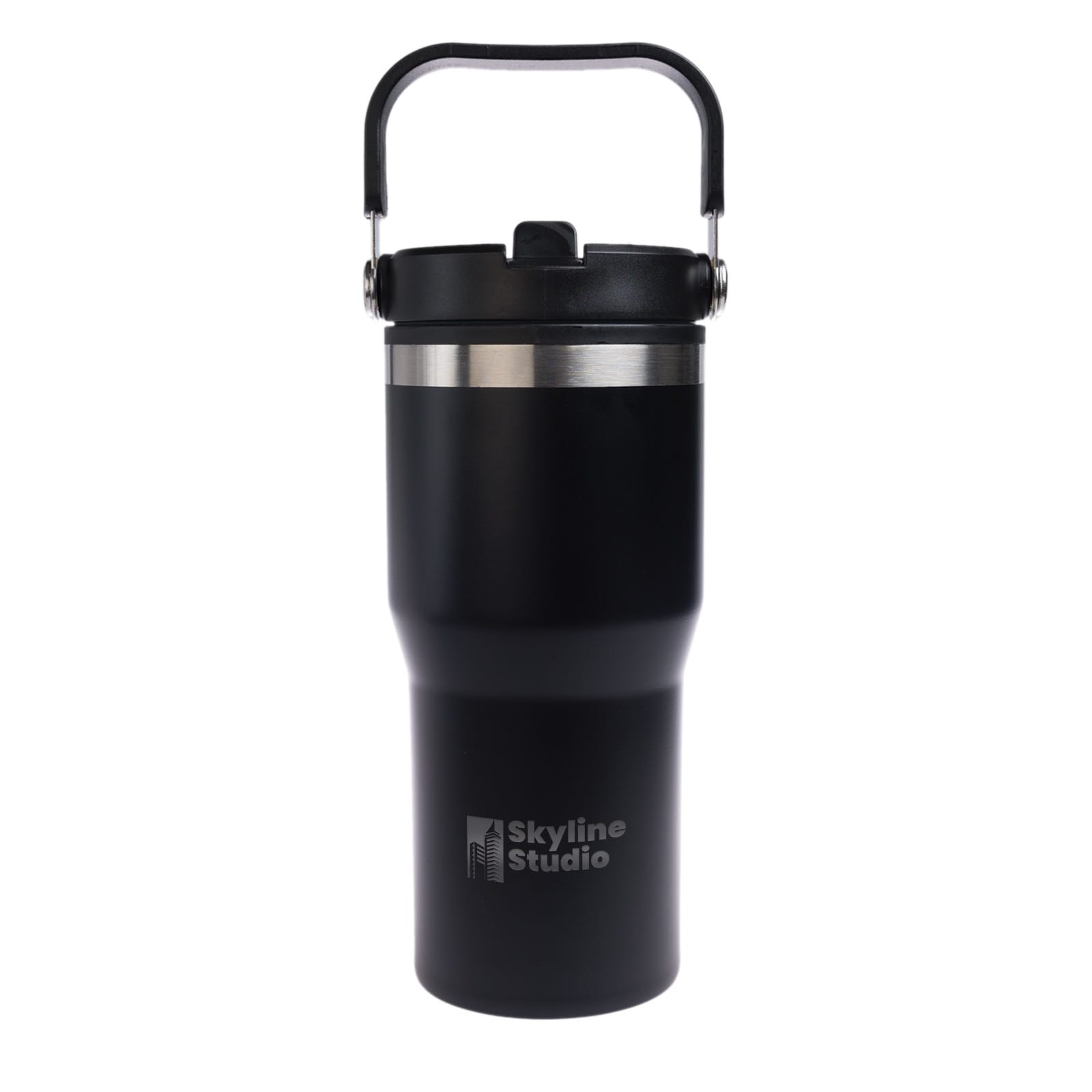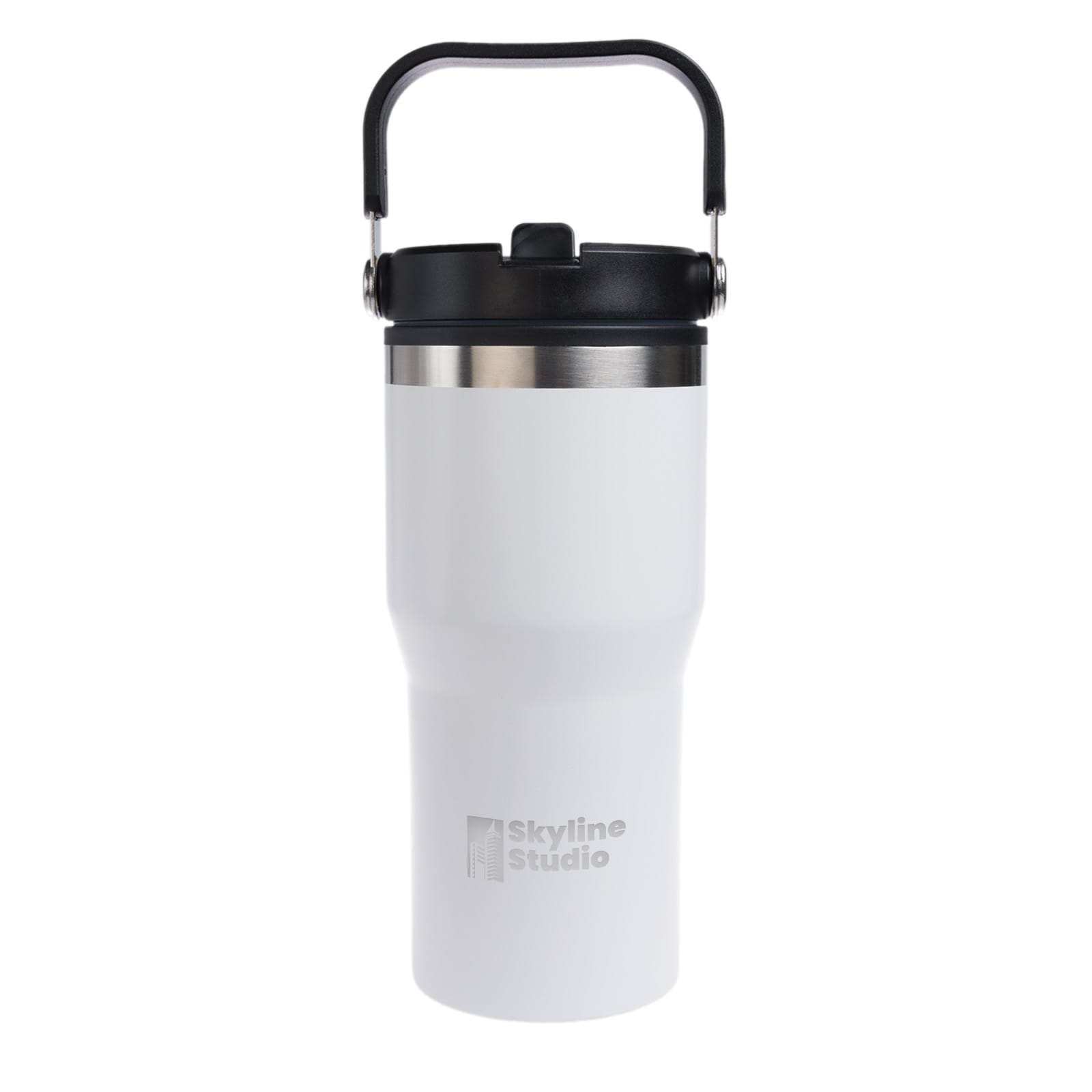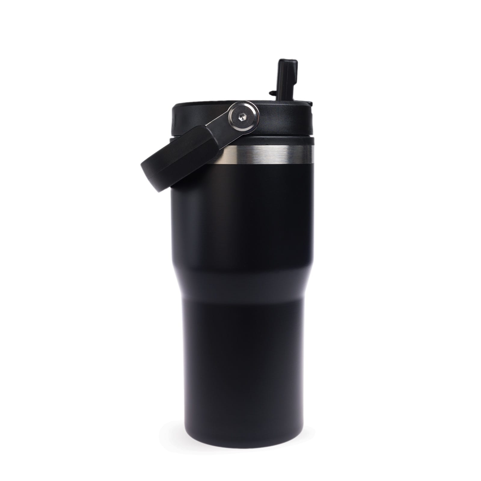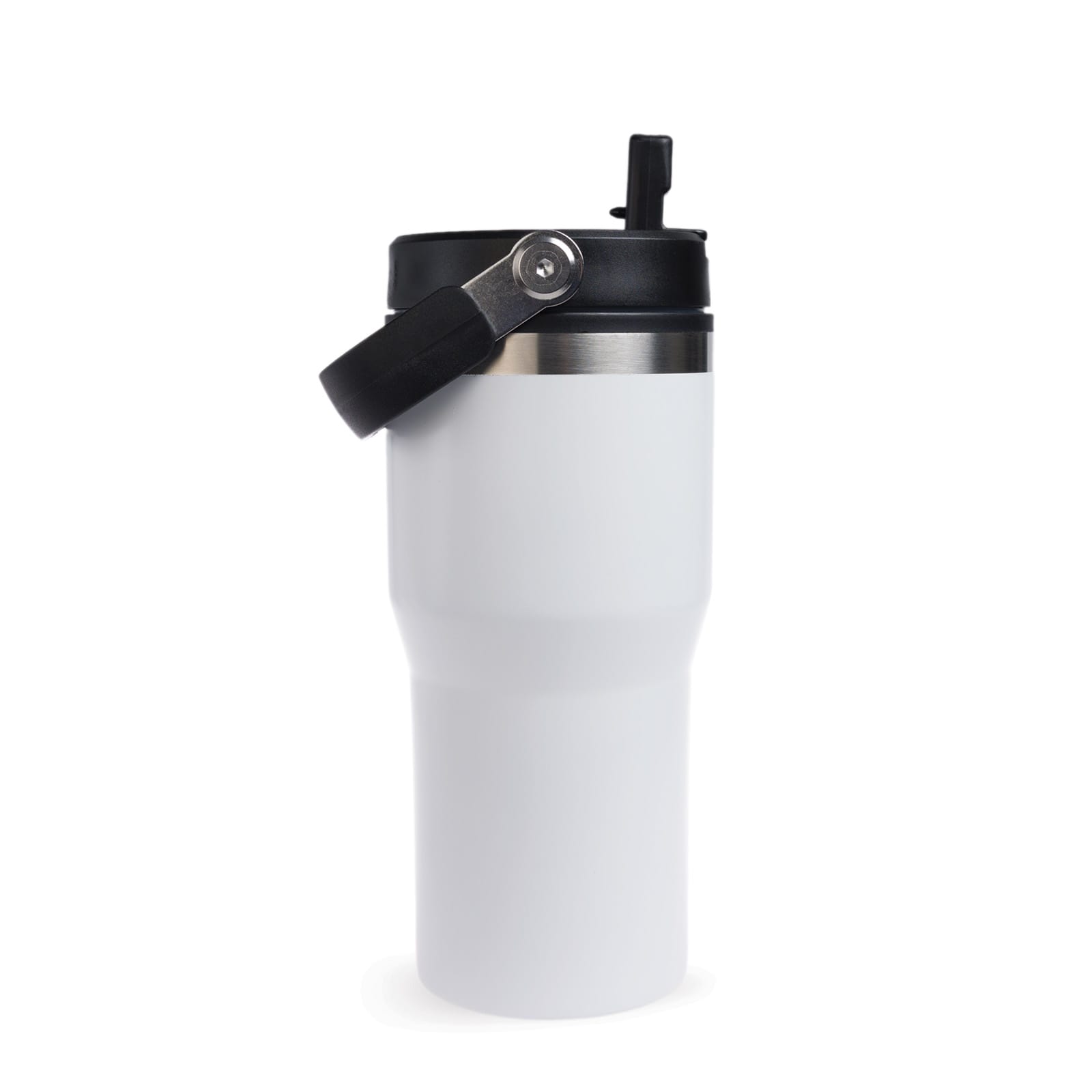 The Faith 620ml Stainless Steel Tumbler, a sleek and durable drinkware option for your daily hydration needs. This double-wall tumbler features a 201 grade stainless steel outer and a black PP liner, ensuring your drinks stay at the perfect temperature. The black screw-in lid includes a black flip-up mouthpiece and a clear straw for easy sipping. Each lid also boasts a stainless steel handle with a black grip for added convenience. Available in matte black and white, this stylish tumbler is perfect for on-the-go use.