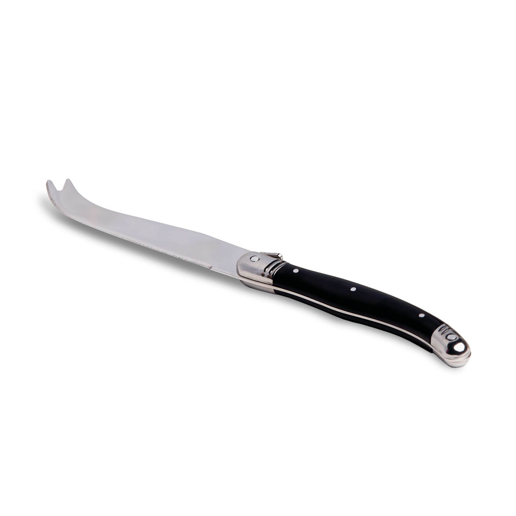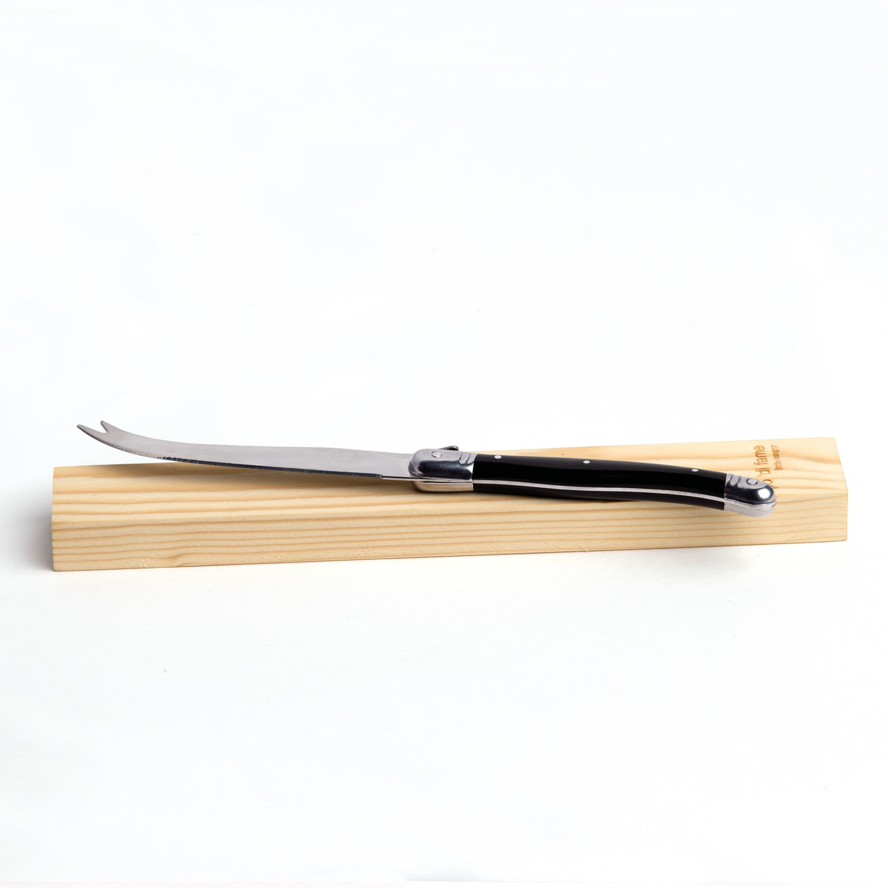 Ergonomically designed 23cm Stainless steel cheese knife with black plastic handle|Displayed in natural pine cavity die cut gift box|Supplied: in a black gift box