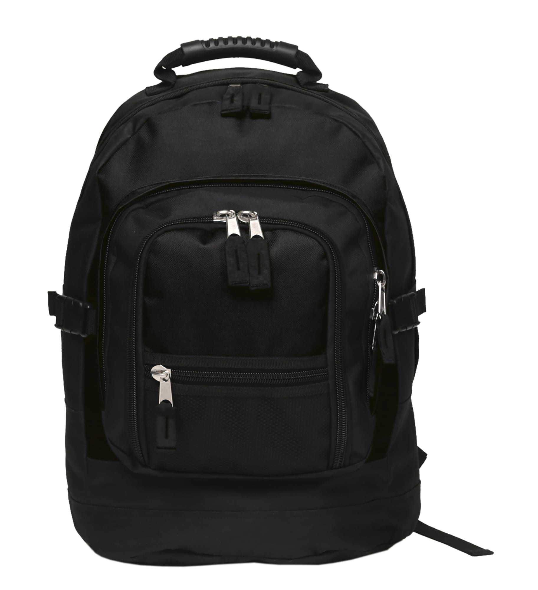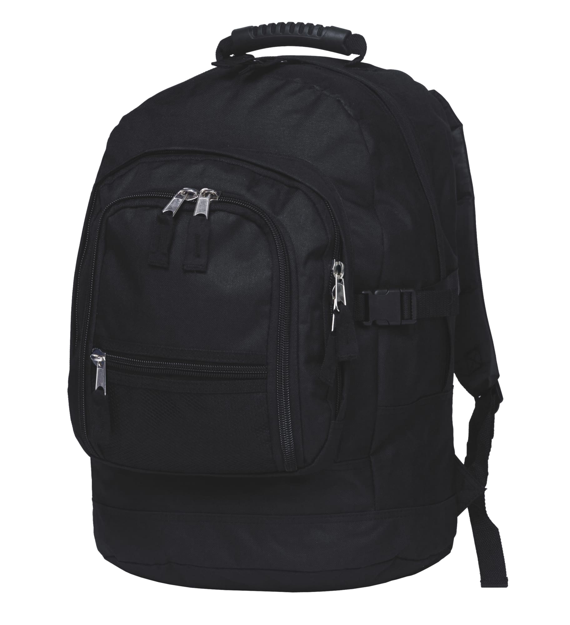600D polyester with latex rubber backing|Huge top loading main compartment|Three quick stash zippered front compartments|Quick release side compression straps|Heavy duty zippers and accessories|Rubber feet for added protection|Heavy duty moulded rubber grab handle|Fully padded shoulder straps and tyre tread back panels|Capacity: 36 Litres