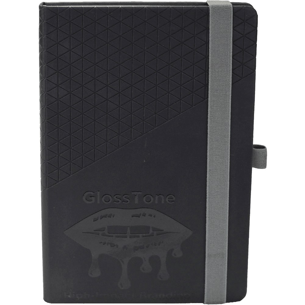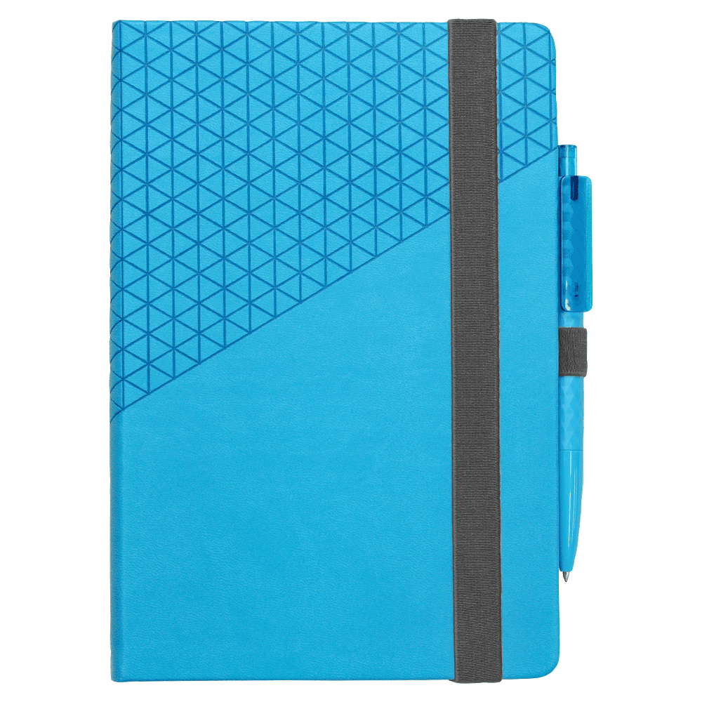 Geometric debossed pattern on both the notebook and pen is a classy look for any logo. The notebook is 80 sheets of cream paper with a back envelope for storage. The grey elastic band, pen loop and page marker gives a classy look. The matching geometric ballpoint pen has a flat front clip, perfect for decorating with a corporate logo. Both items are supplied in a two-part white gift box