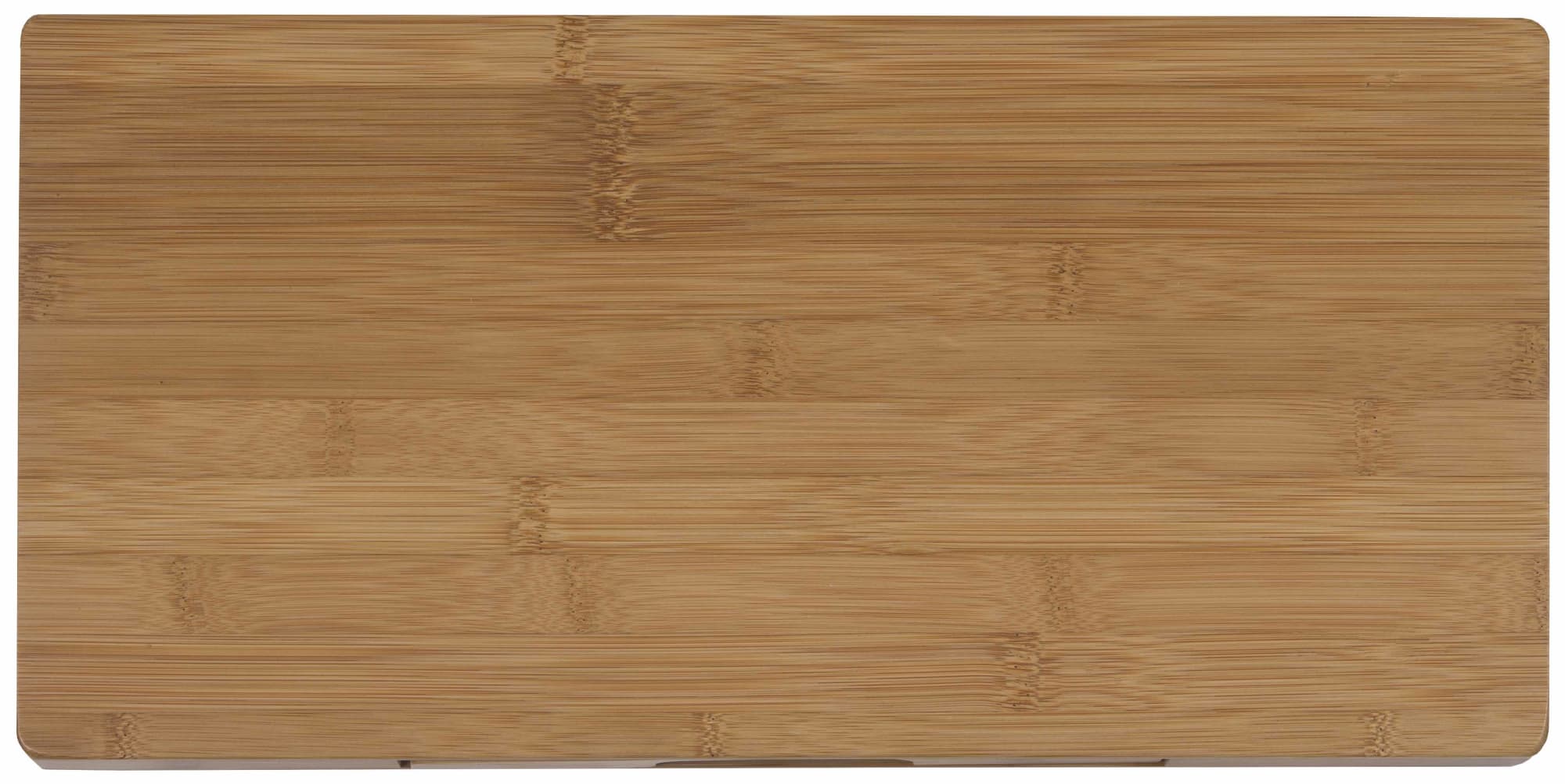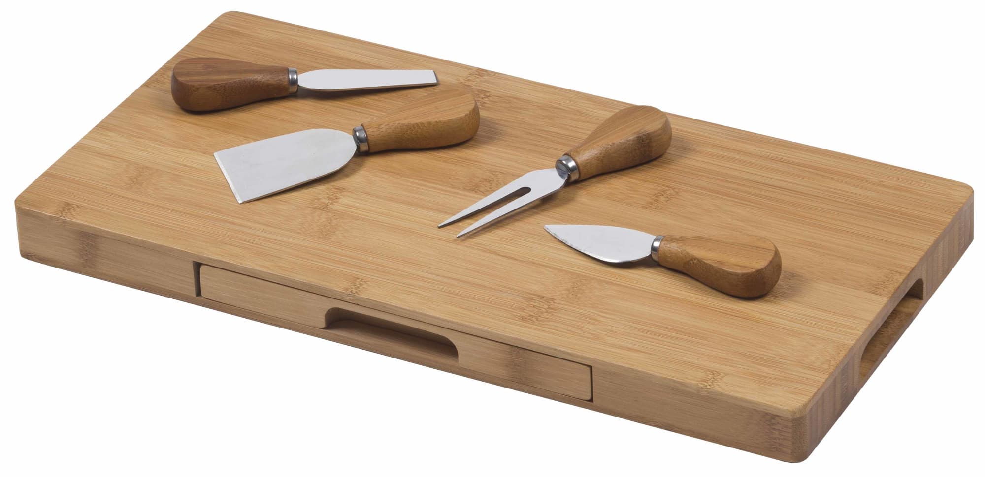 Rectangle bamboo cheese board|Stainless steel / bamboo utensils|Retractable drawer containing 3x cheese knives and 1x cheese fork|Large surface area with integrated carry handles|Each board displays its own character through its unique wood grain finish|Supplied: in a black two part po ‘di fame presentation box (42.5cm W x 4.0cm H x 22.5cm D)