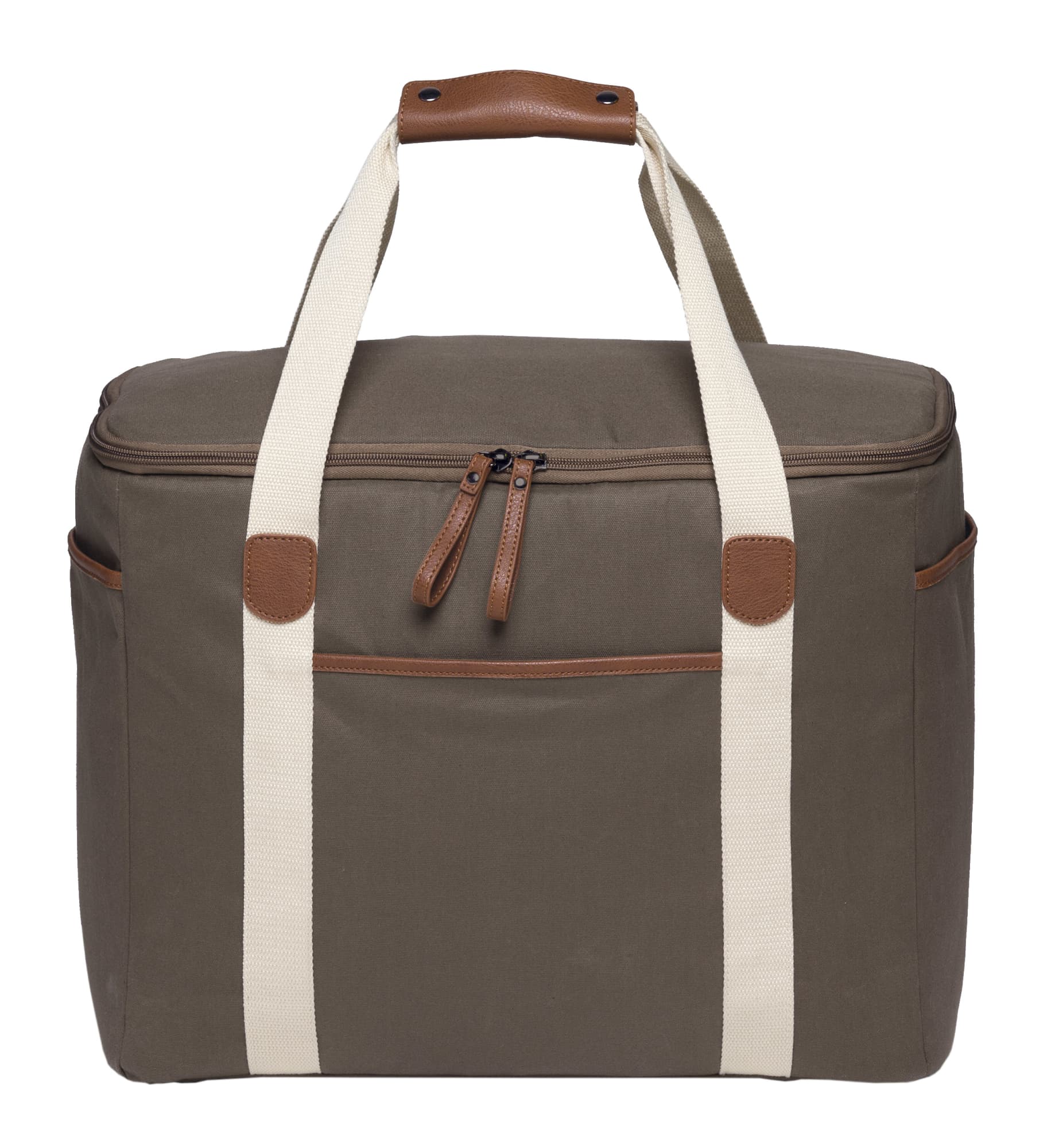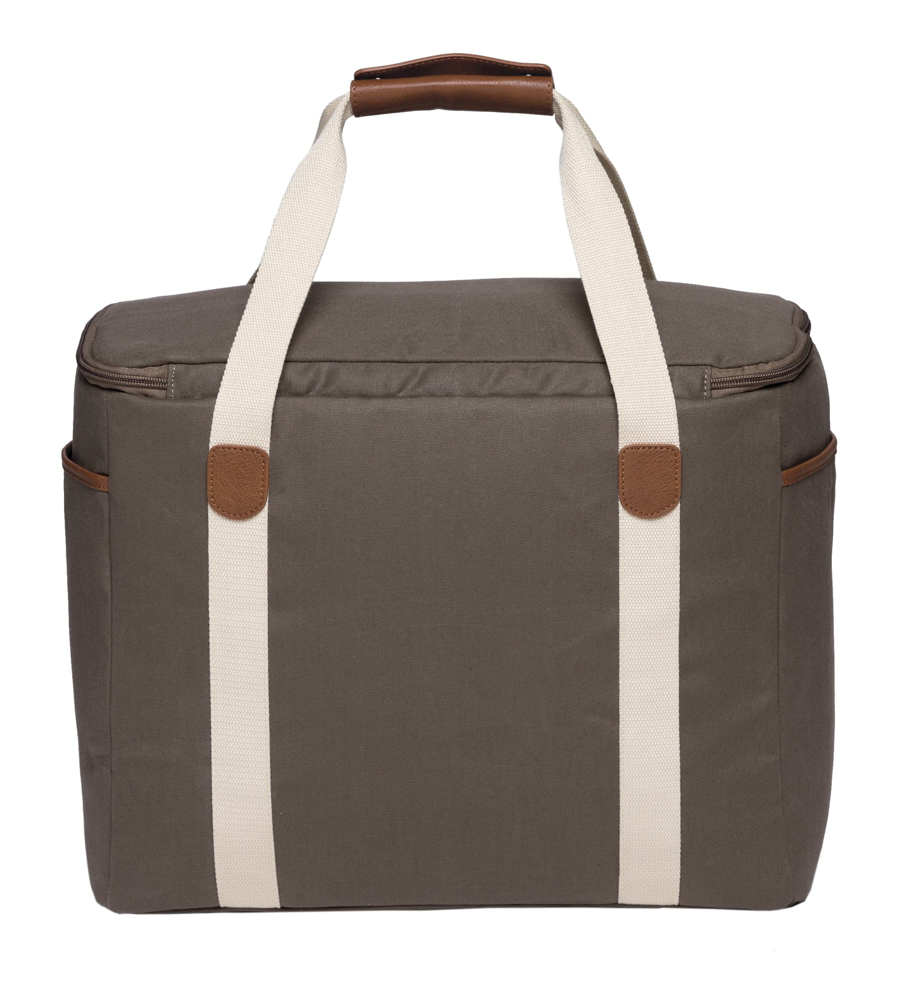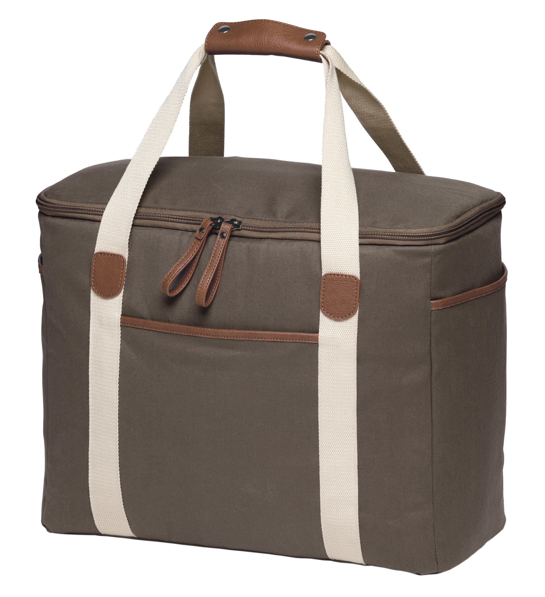 12oz Luxury waxed cotton canvas with faux leather trim|Huge zippered insulated main cooler compartment with heat sealed leak-proof PEVA lining|Front and end slip accessory pockets|Wide contrast webbing carry handles with faux leather wrap and dome closure|Gunmetal zip sliders with faux leather zip pullers|Capacity: 30 Litres