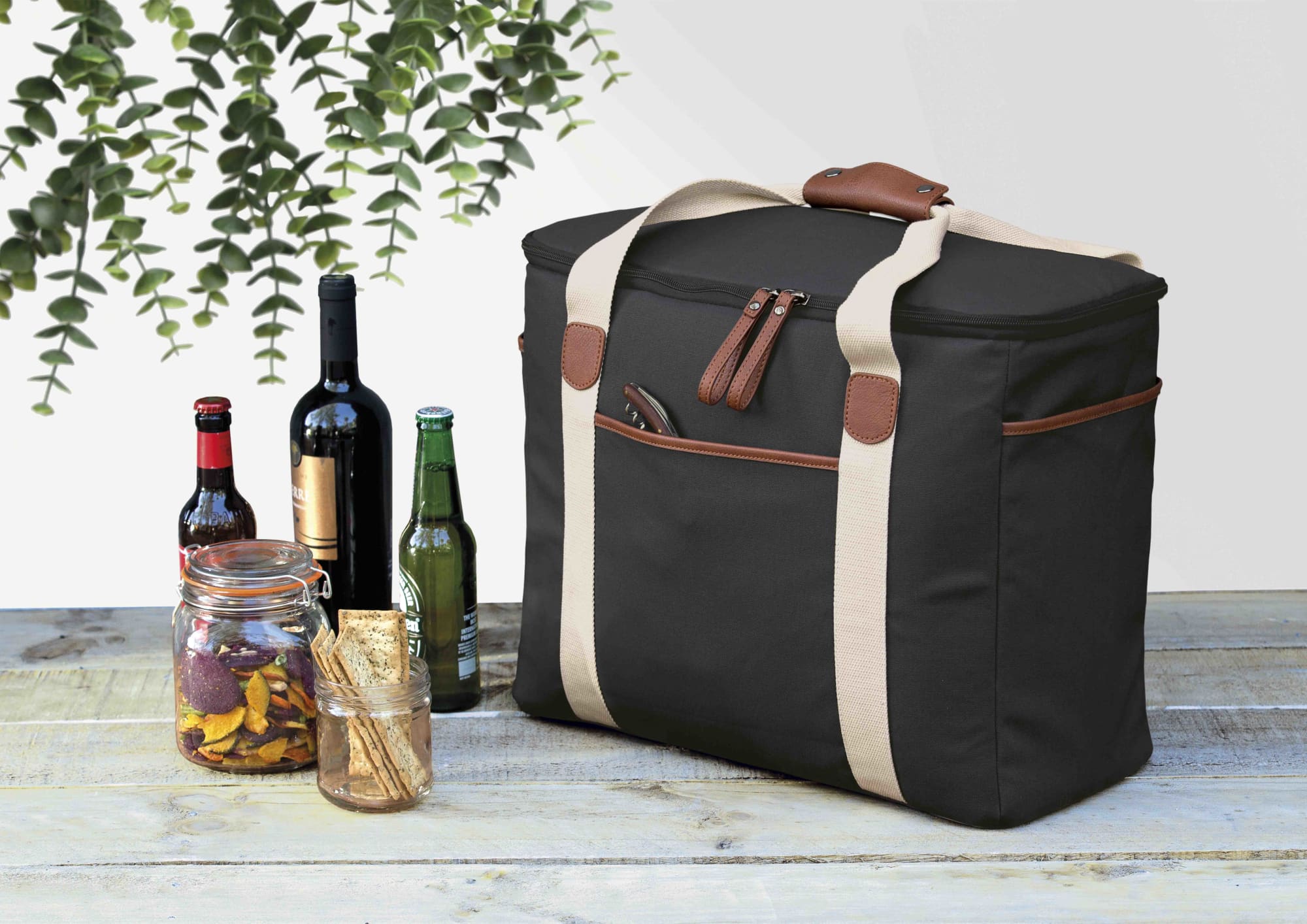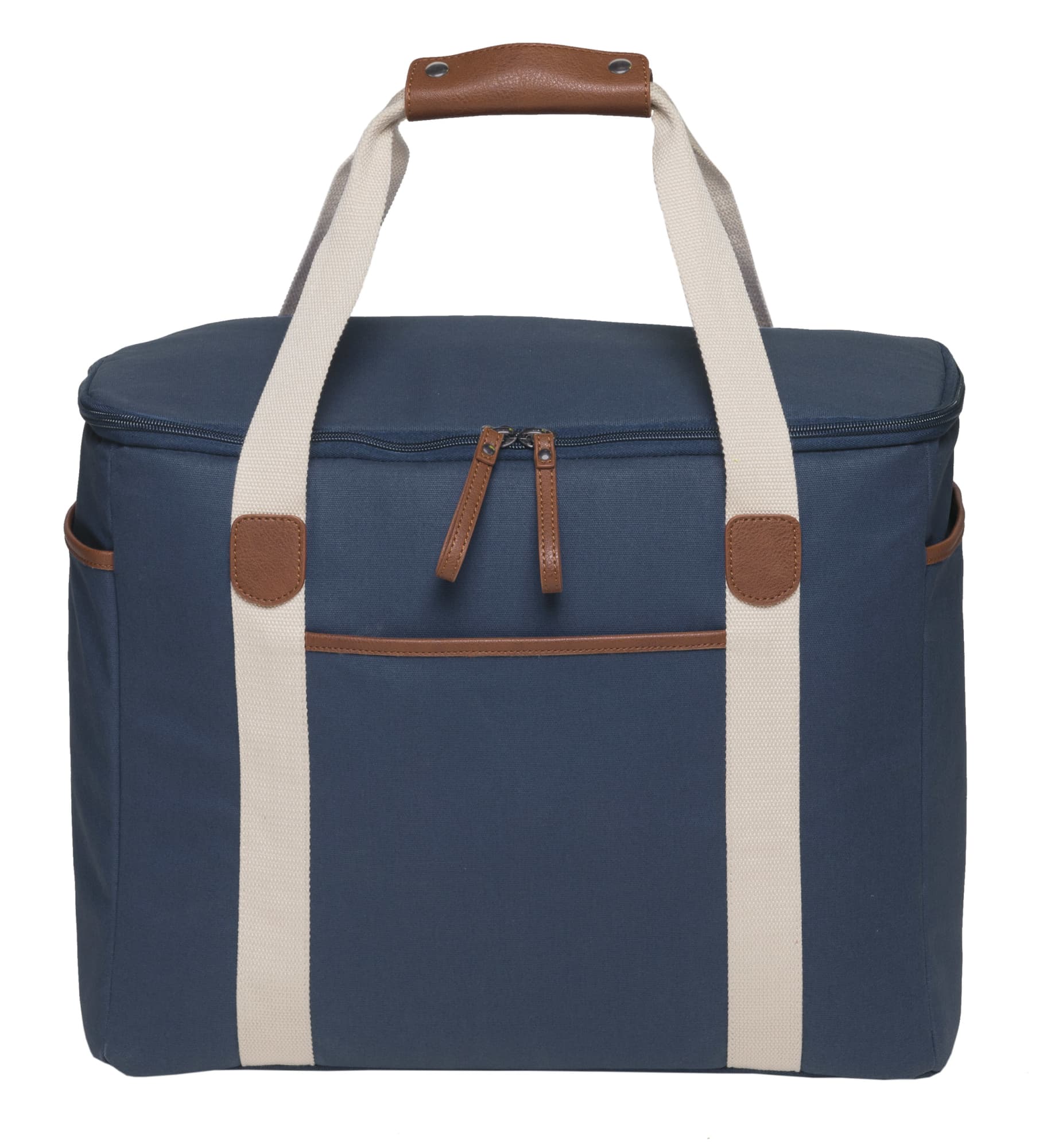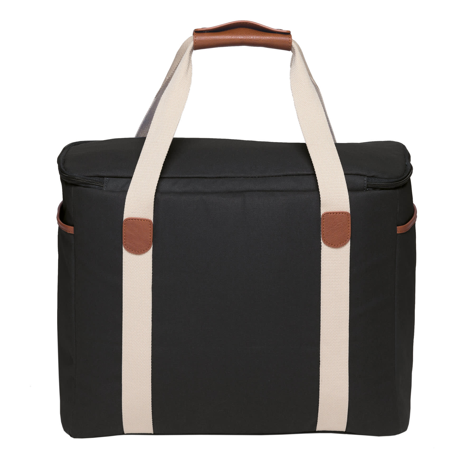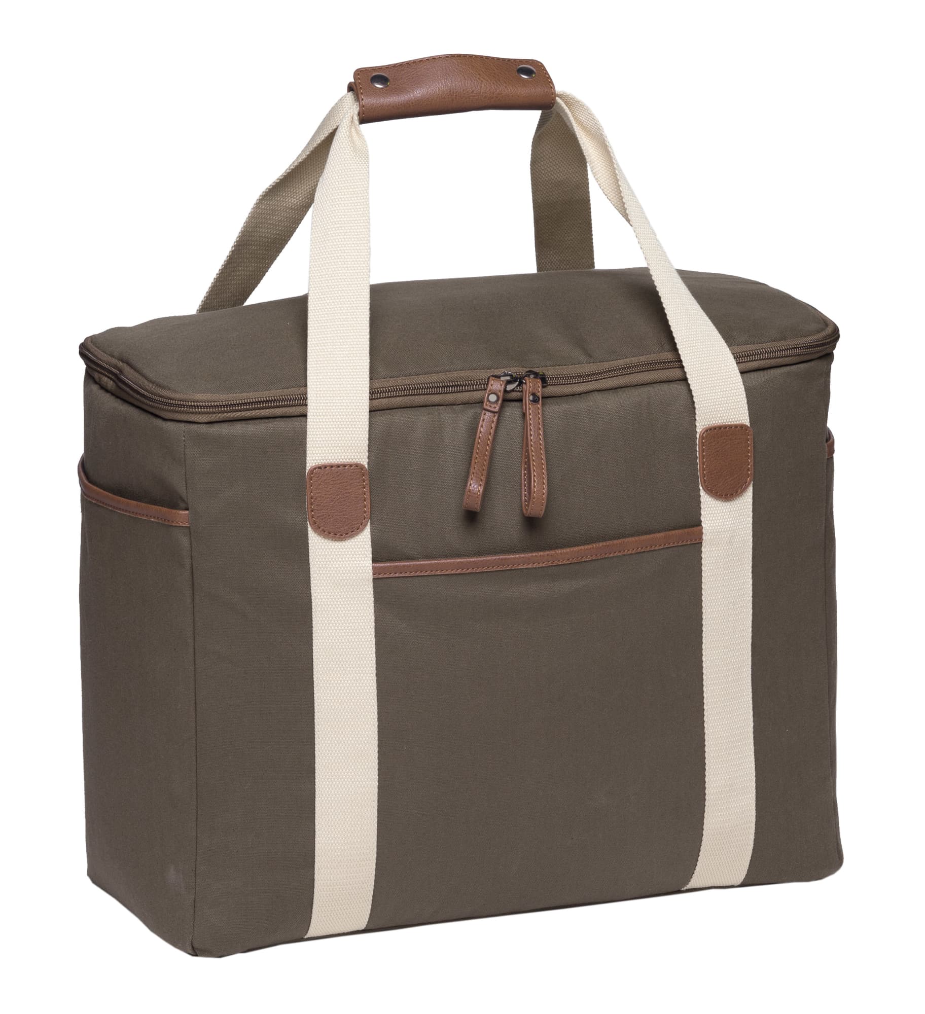 12oz Luxury waxed cotton canvas with faux leather trim|Huge zippered insulated main cooler compartment with heat sealed leak-proof PEVA lining|Front and end slip accessory pockets|Wide contrast webbing carry handles with faux leather wrap and dome closure|Gunmetal zip sliders with faux leather zip pullers|Capacity: 30 Litres