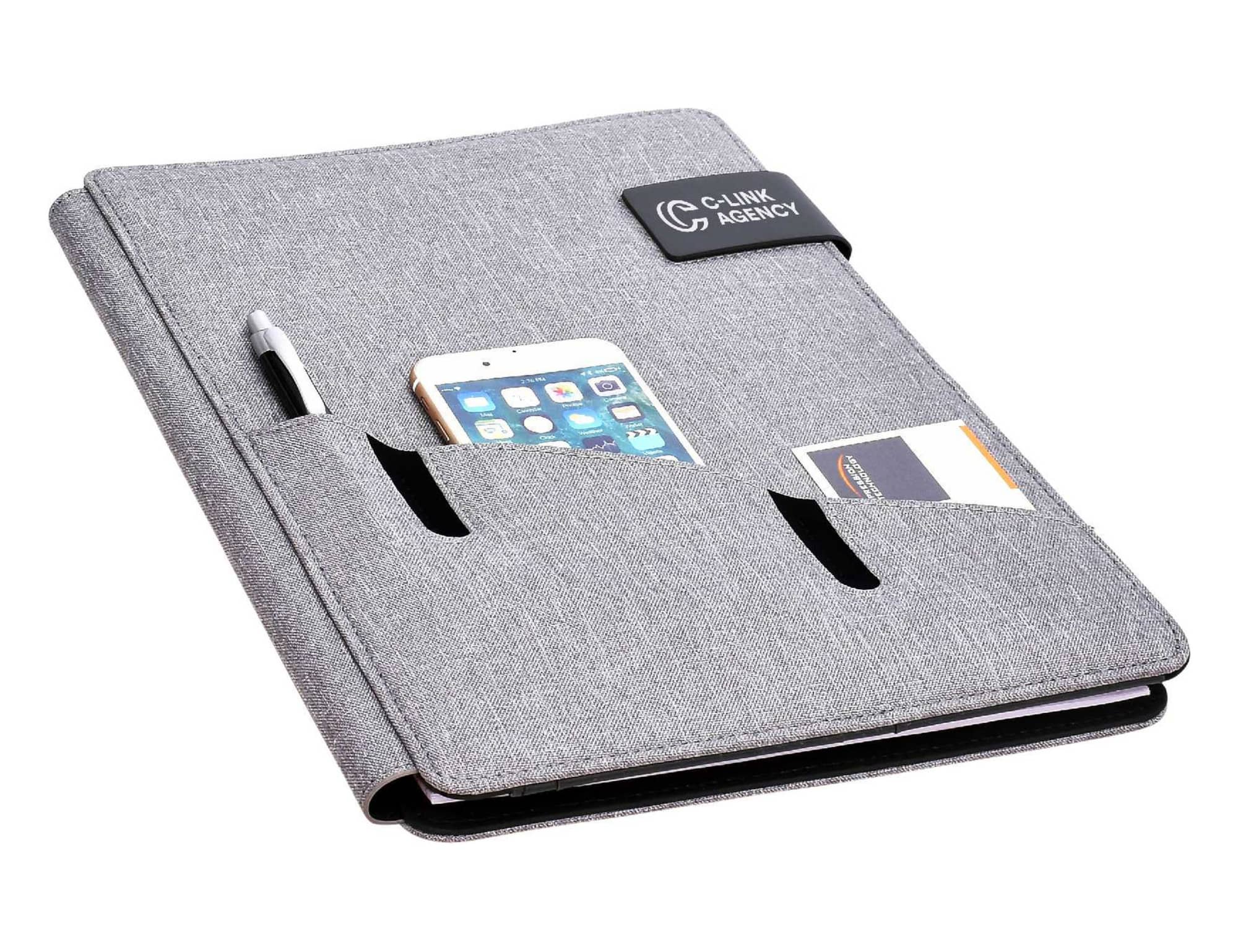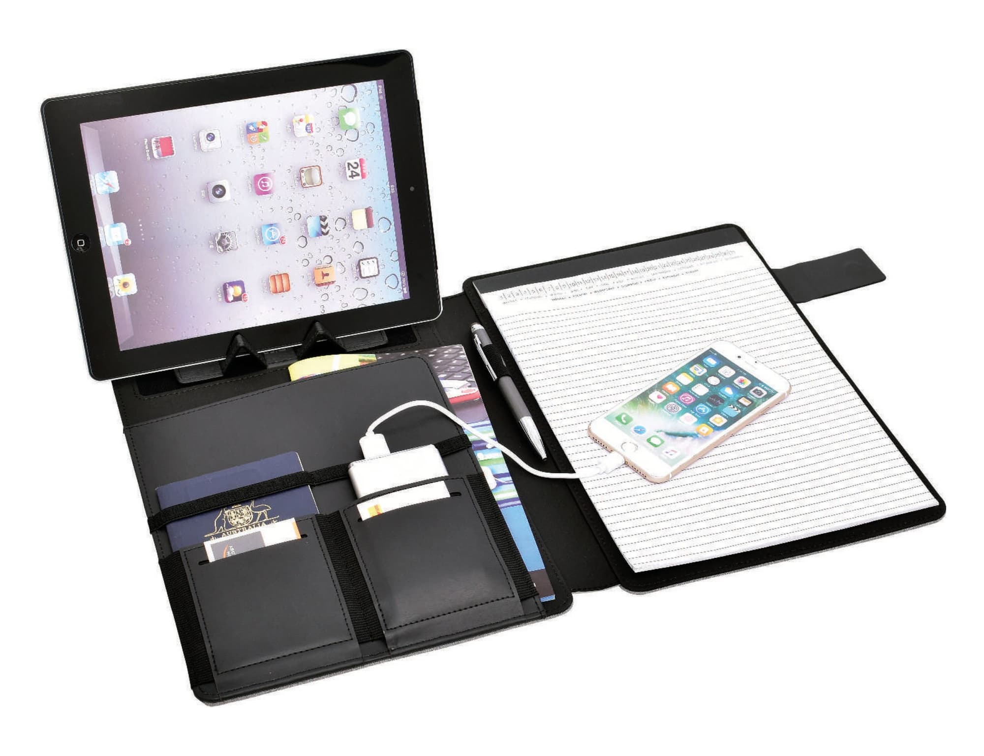 Hands-free A4 Portfolio, as the name suggests is designed to keep your hands free while safely securing in place your most valued accessories. This portfolio has pockets on the inside and outside designed to hold your mobile phone, pens, business and credit cards, phone charger, IT accessories and even includes an ingenious flat folding mobile phone/tablet stand. Made from the latest fabric inspired materials, this portfolio features a leather-look magnetic closure and is supplied with a ruled notepad. Available in grey or black. (Accessories not included)