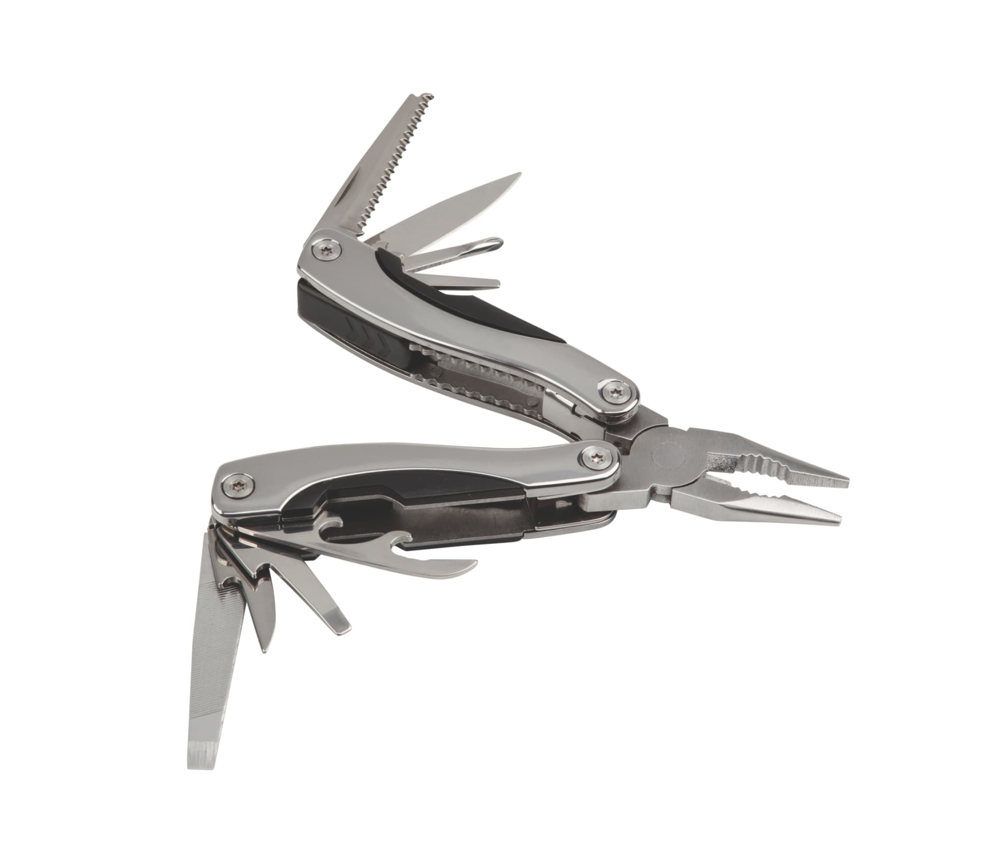 This 13-function multi tool is made with a high-gloss stainless steel handle and implements. It features a secure internal spring as well as a safety implement locking device that ensures the knife, screwdrivers etc. will remain extended until the unlock button is pressed. Available in gloss stainless steel with black trim and supplied in a deluxe nylon pouch.