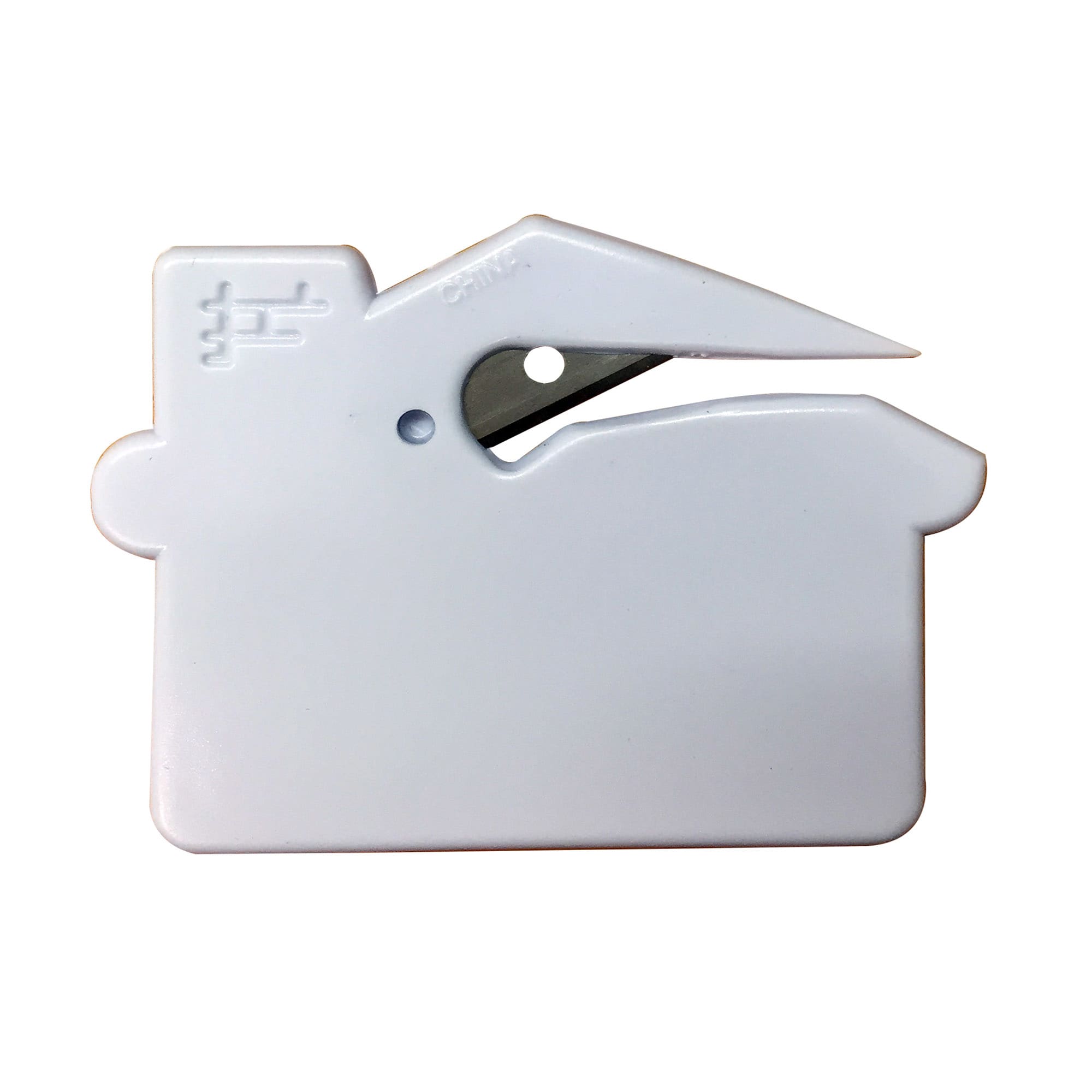 Plastic house shape letter opener has a sharp metal blade for cutting the envelope large branding area a great cost effective promotional product.