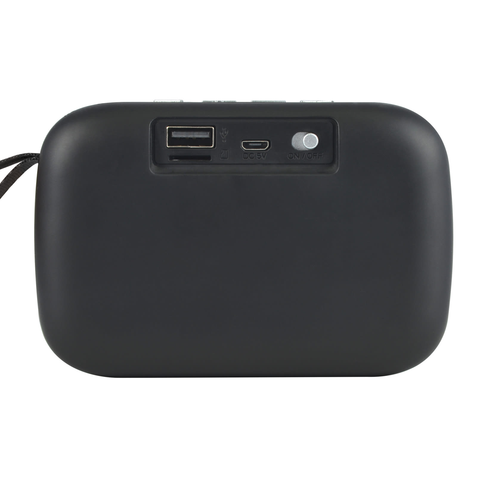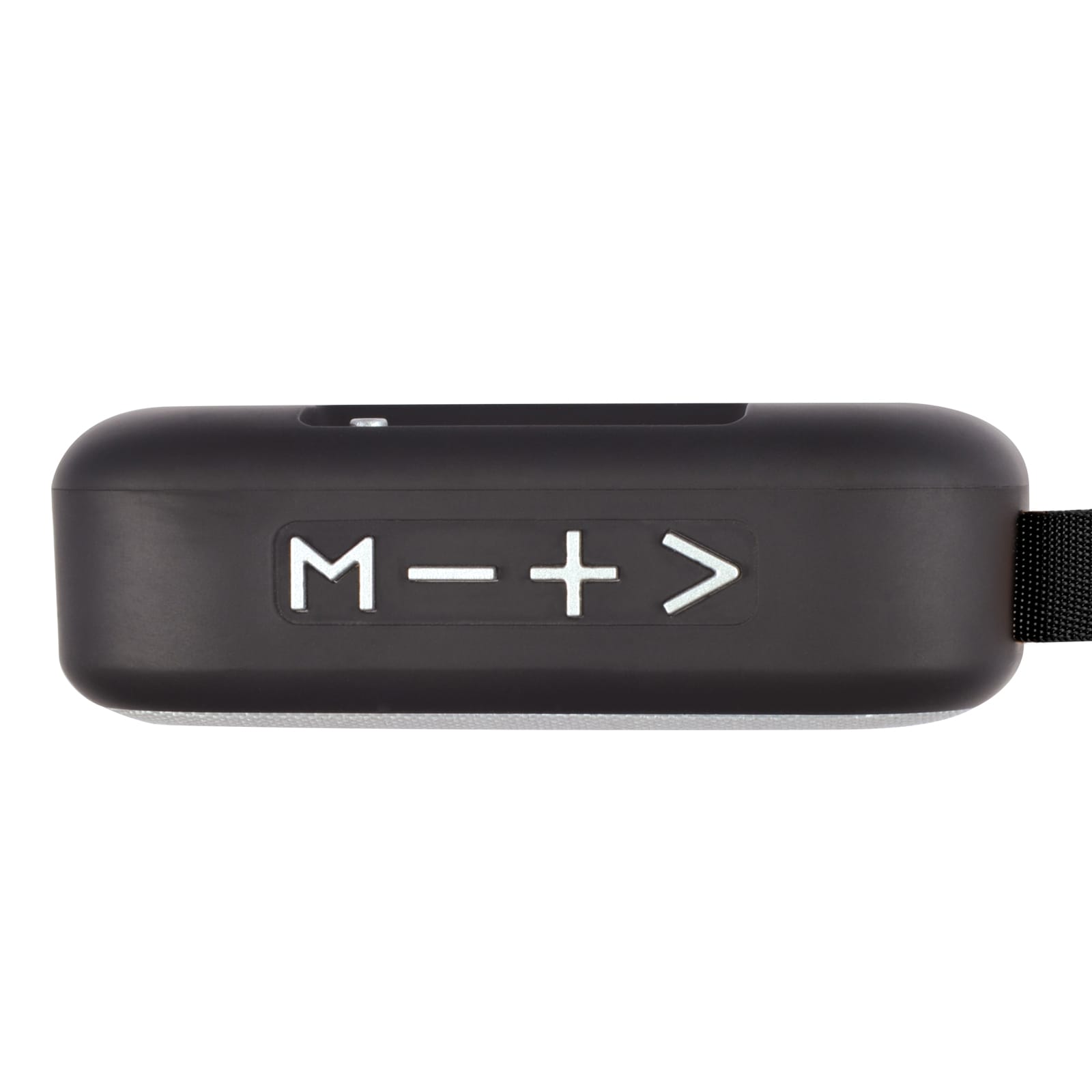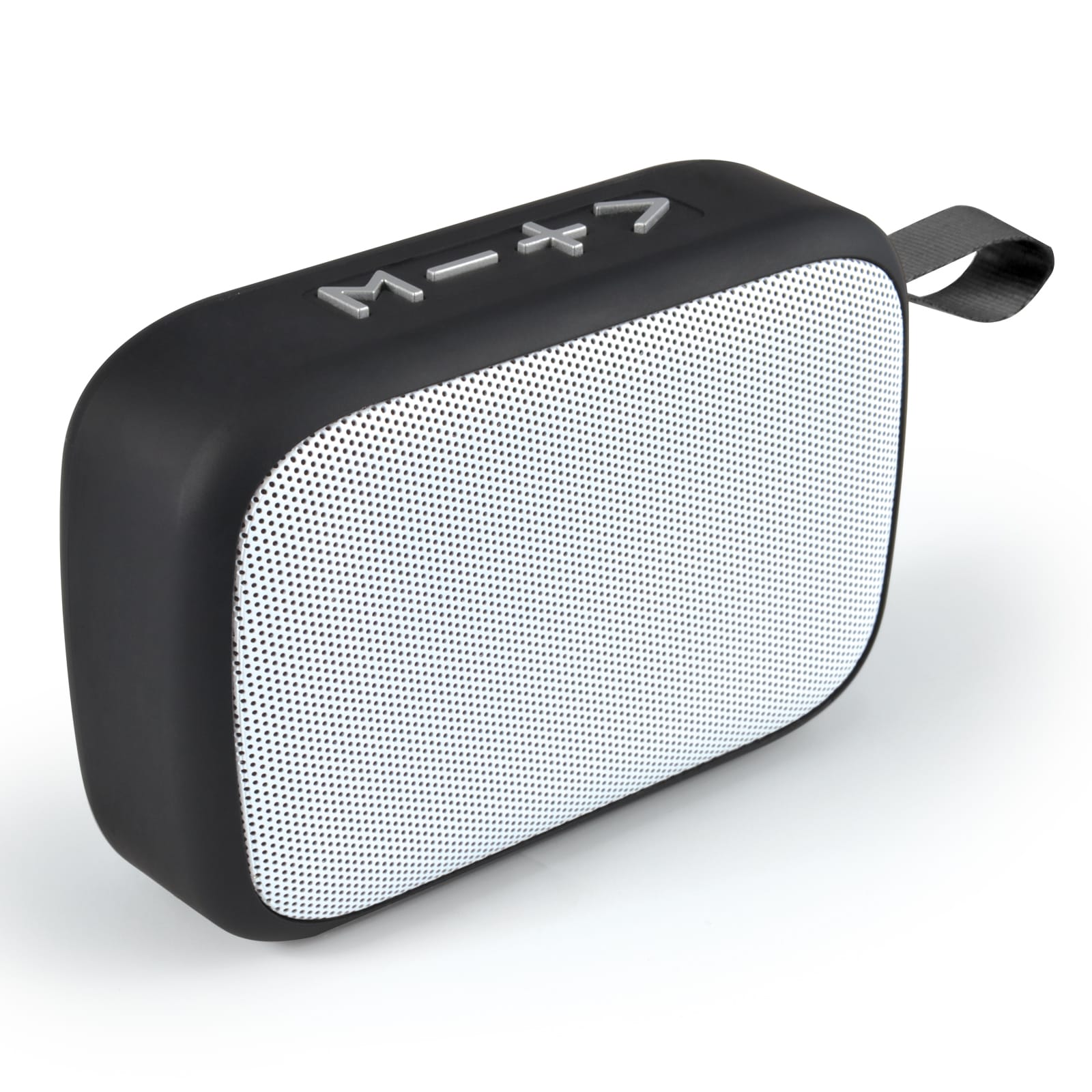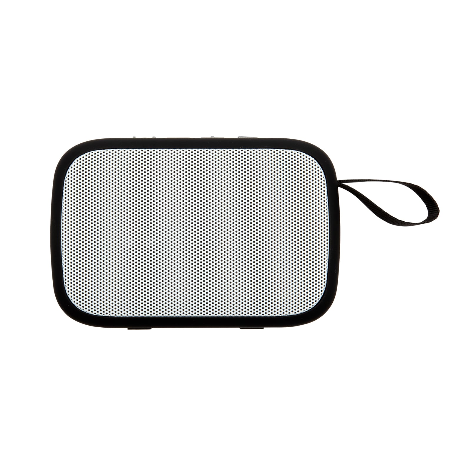 Elevate your music experience with the Jive Speaker, a compact Bluetooth speaker designed for convenience and performance. Sync it easily with your phone or other devices to enjoy crystal-clear audio. With a 3W output, FM radio function, and slots for Micro SD cards and USB drives, it offers versatile playback options. Enjoy up to 6 hours of music wirelessly within a 10-metre range. The speaker charges quickly with the included USB cable and comes with a user guide. Its sleek design features a white grill, black shell, and silver controls.