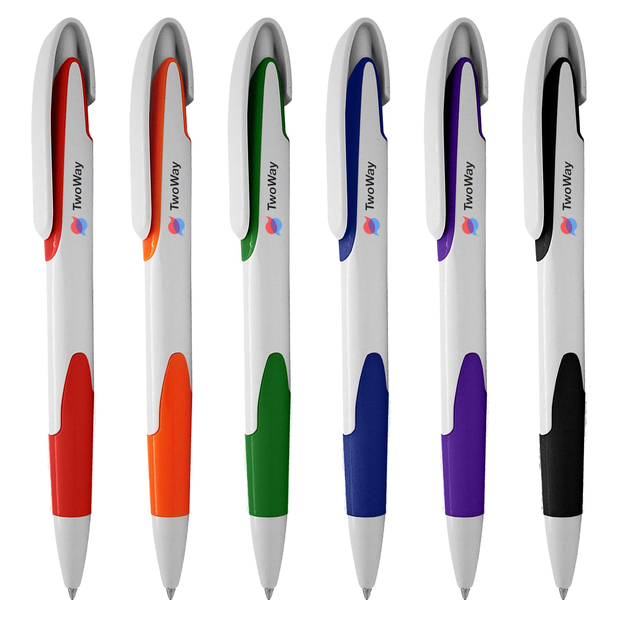 Click action plastic pen with broad printing area on clip white opaque barrel tip and clip with coloured soft-touch grip a small coloured panel beneath the clip matches the grip colour. It has high quality German manufactured black ink refill 1800 meters writing distance tungsten carbide ball provides you with quality writing.