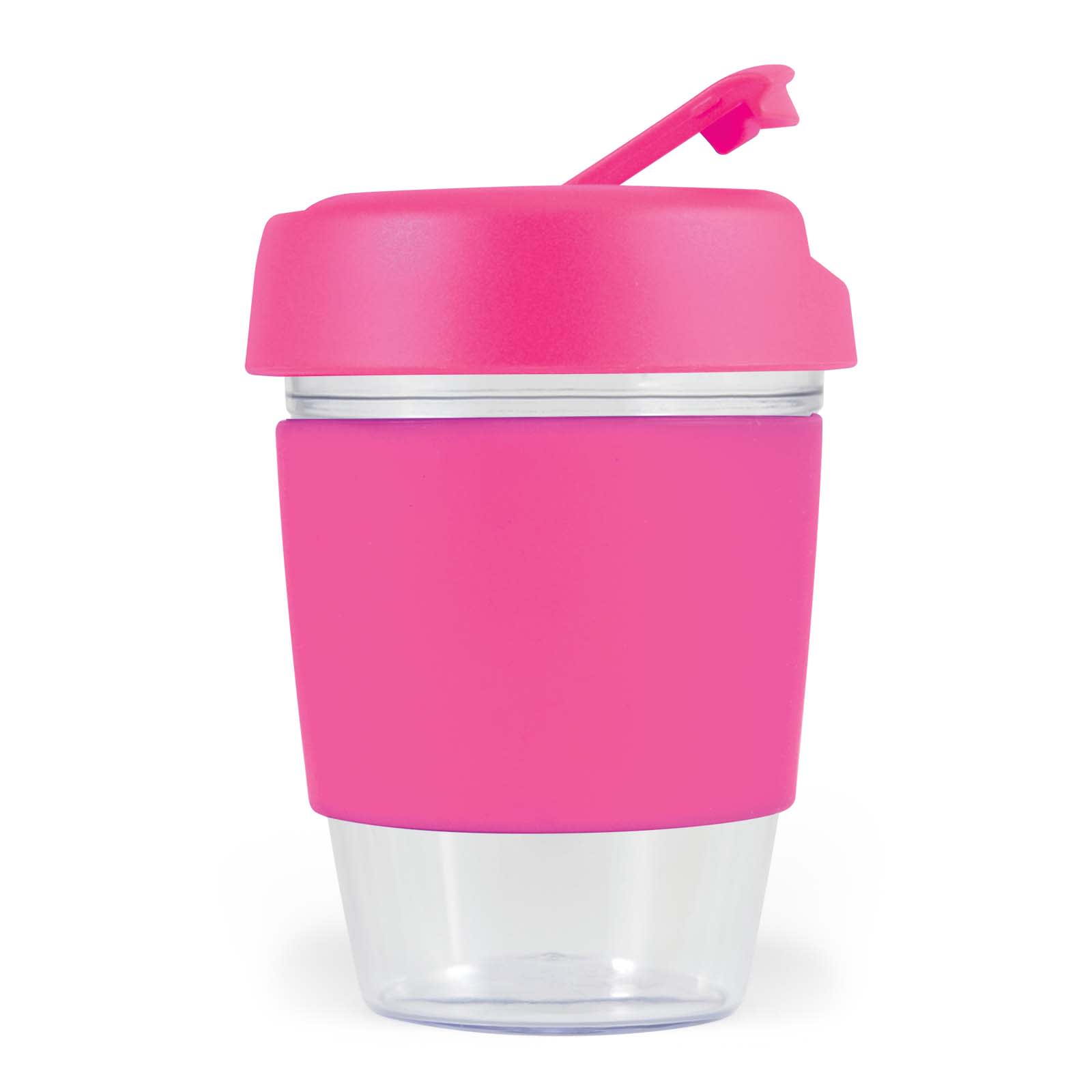 Introducing the Kick Cup Crystal with Silicon Band: a 320ml clear reusable coffee cup with a heat-resistant silicone sleeve and screw-on lid. Customise your cup with your choice of lid, flip piece, and silicone sleeve colours. BPA free. For logo longevity, hand washing is recommended.