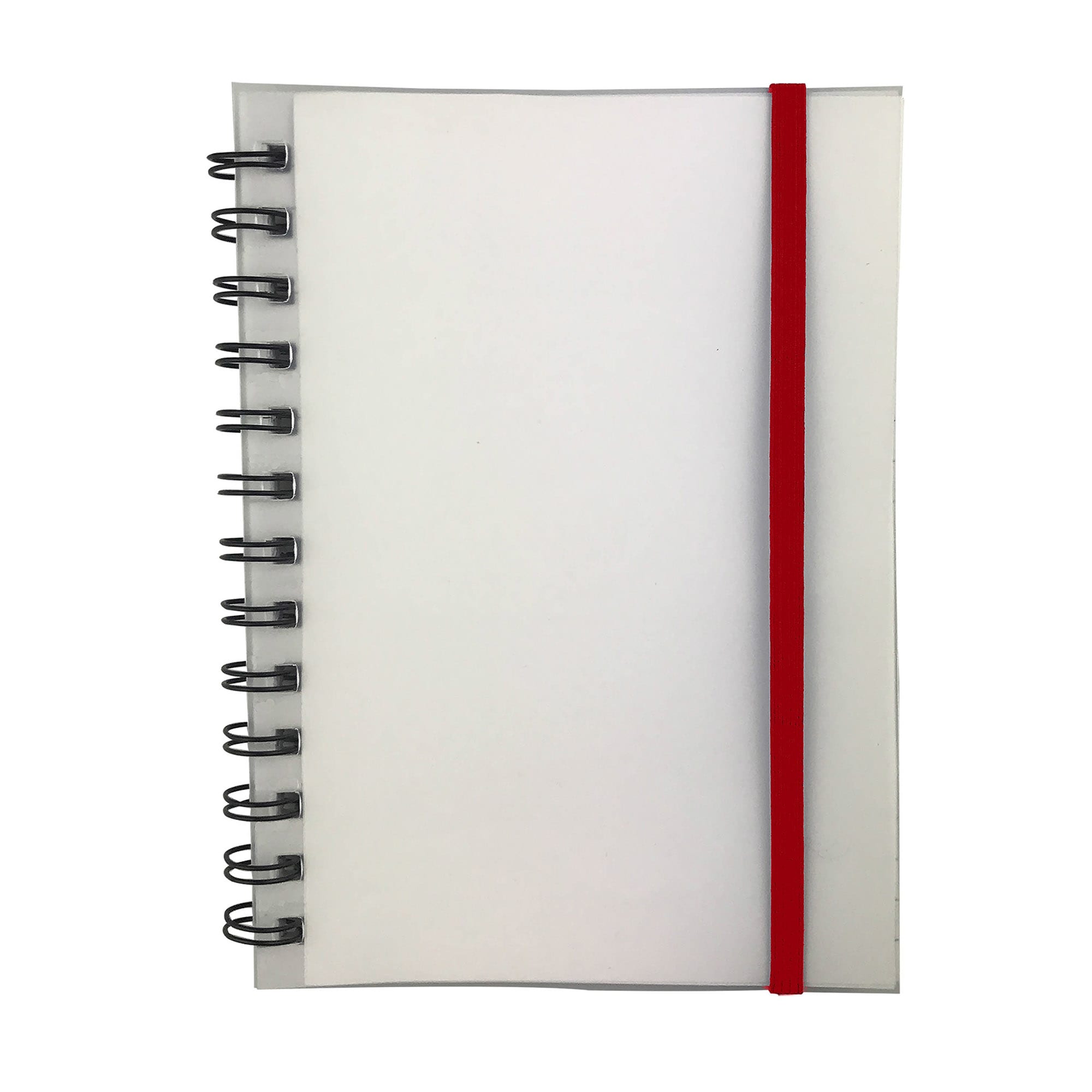 B6 PP cover notebook with side spiral bound the cover is made of frosted PP plastic it has 70 leaves(140 pages) of 70gsm white recycled lined paper and coloured elastic retaining closure.