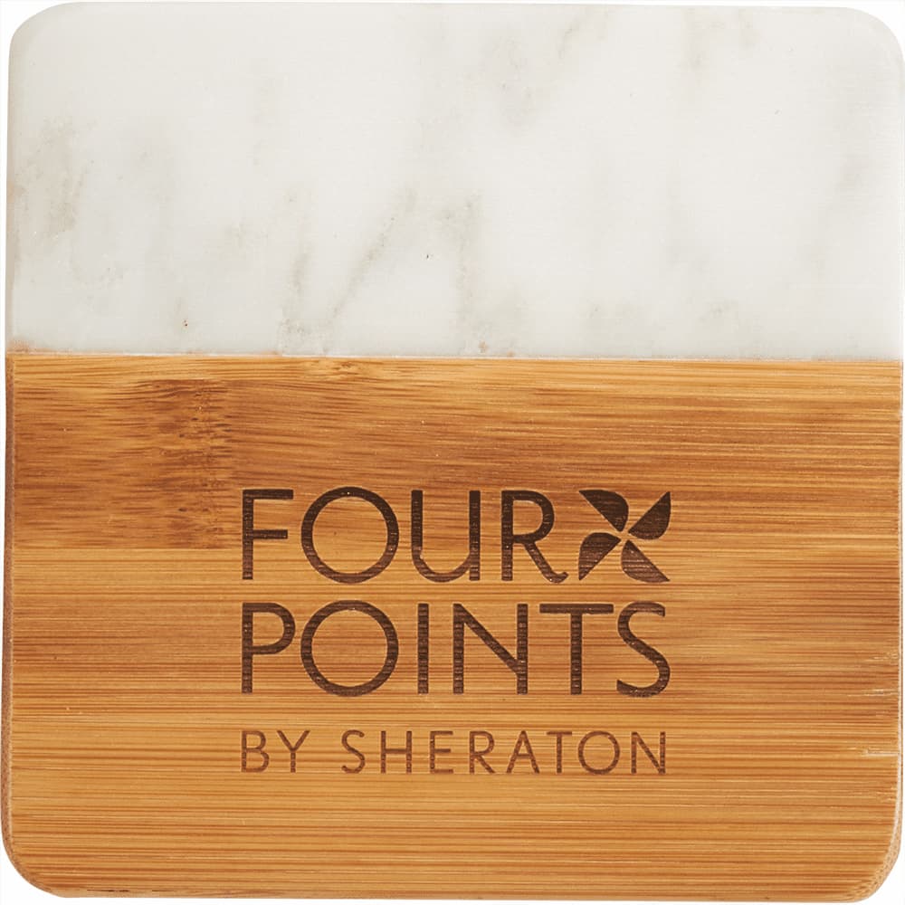 | Features | This chic four piece coaster set is crafted from marble and bamboo. The coasters are square with rounded corners. |