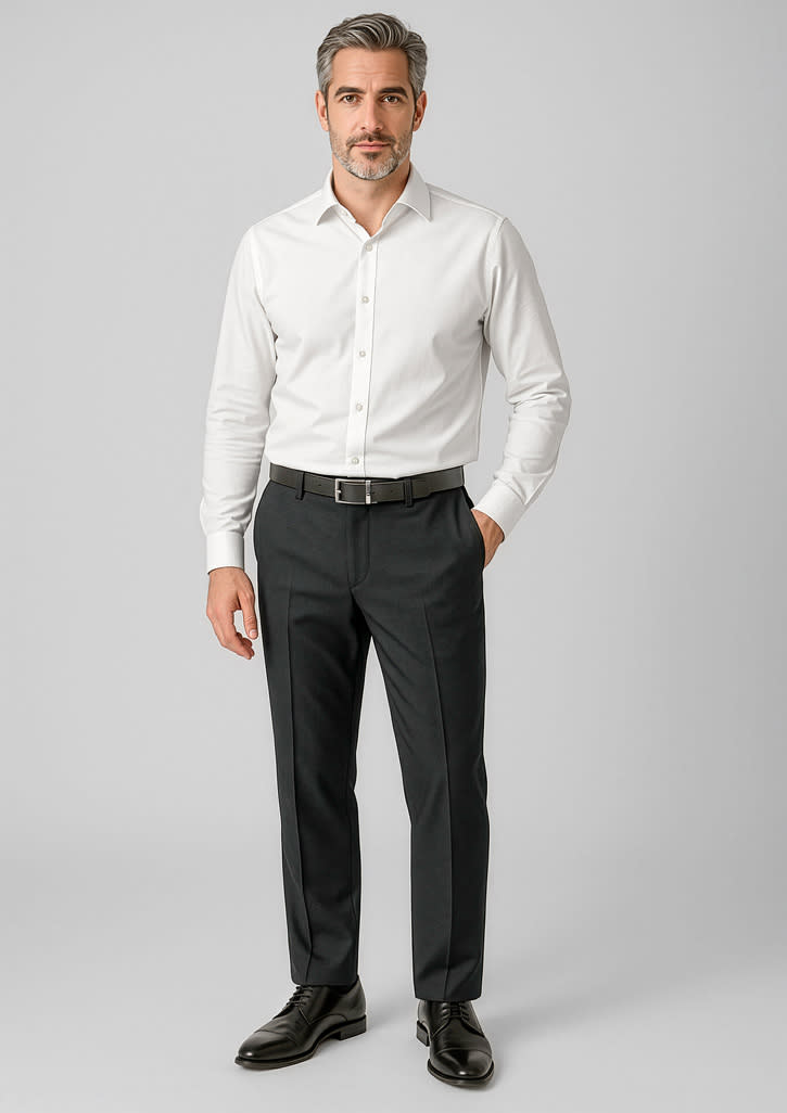 Features: Flat front and straight through the leg. With hidden elastic waistband for extra stretch and comfort. A ‘roomier’ mid-rise and deep side pockets.