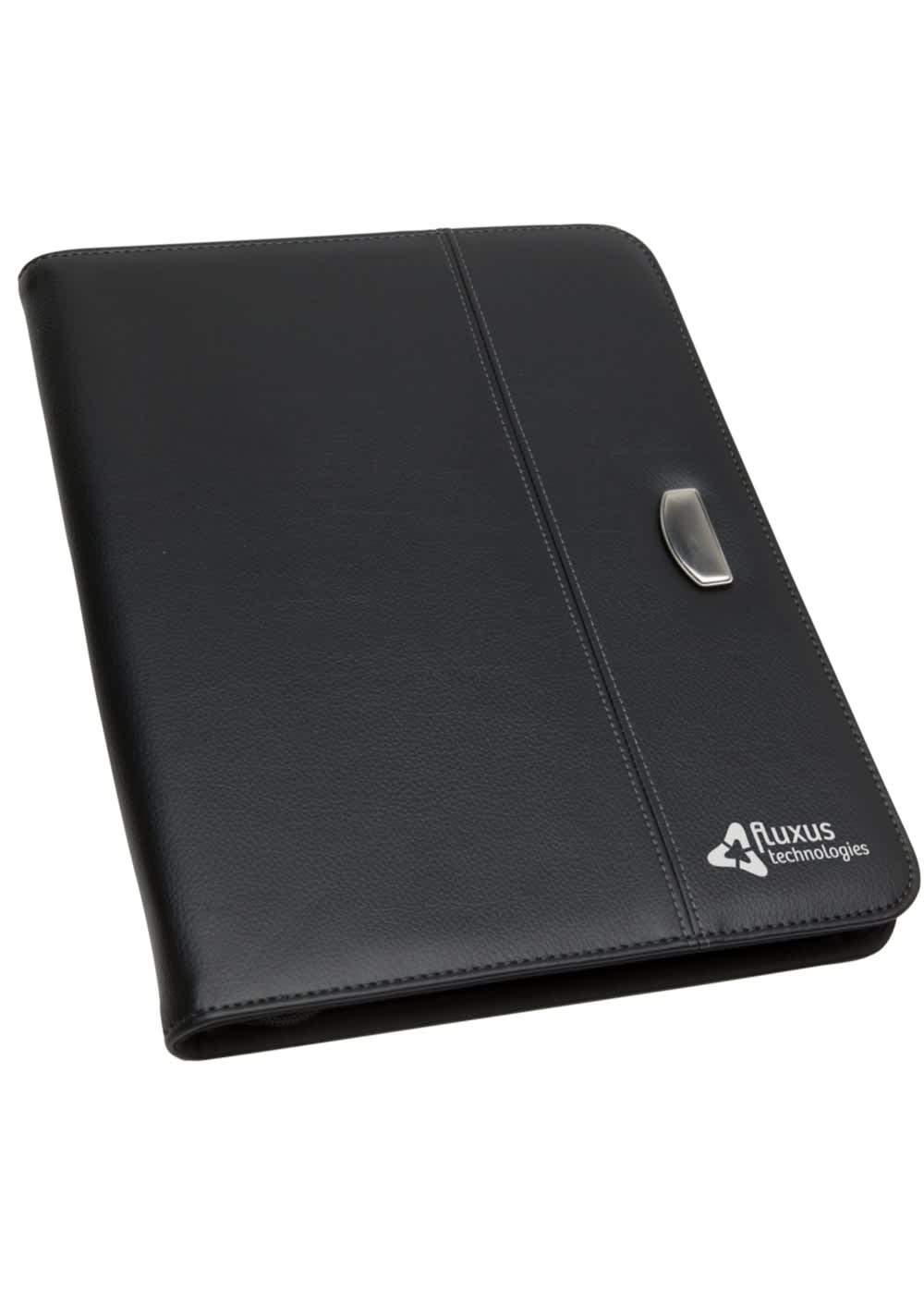 This soft grain finish A4 portfolio with an outer zip closure is designed to keep your contents secure. Your logo can be printed onto the portfolio or engraved on the brushed chrome accent plate (optional). Features include a soft grain finish outer, micro-fibre inner, outer zip closure, brushed silver accent plate, note pad (30 pages), pen loop, internal security zip pocket, multiple card pockets and a gusseted internal brochure pocket.