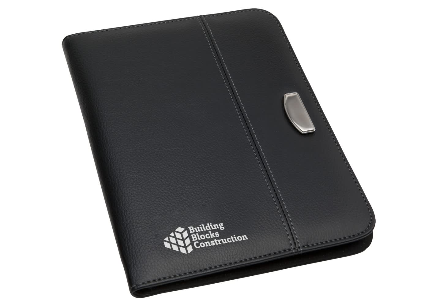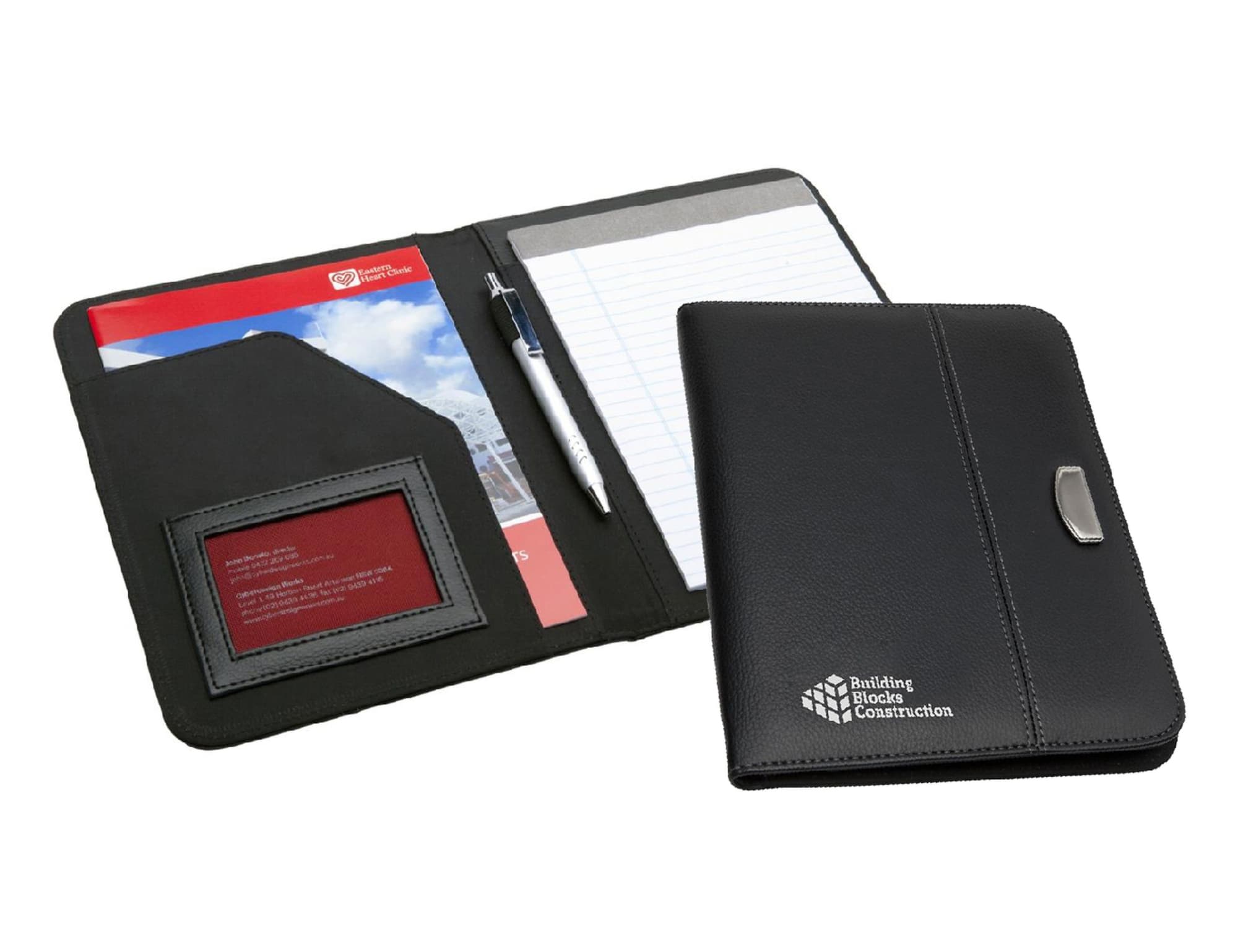 A quality A5 portfolio made with a soft grain finish. Your logo can be printed onto the portfolio or engraved on the brushed chrome accent plate (optional). Features include a soft grain finish outer, micro-fibre inner, brushed silver accent plate, note pad (30 pages), pen loop, card pocket and an internal brochure pocket. (Pen not included).