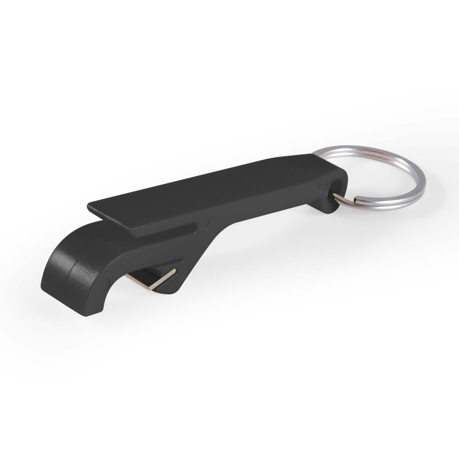 Plastic opener/keytag. Opens crown seal tops and ring pull can tops. Split ring 25mm diameter.