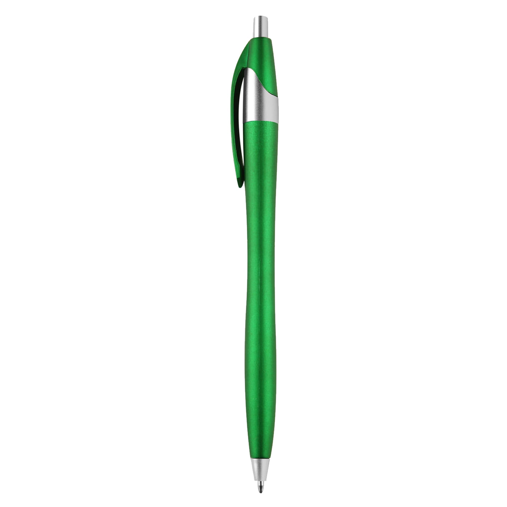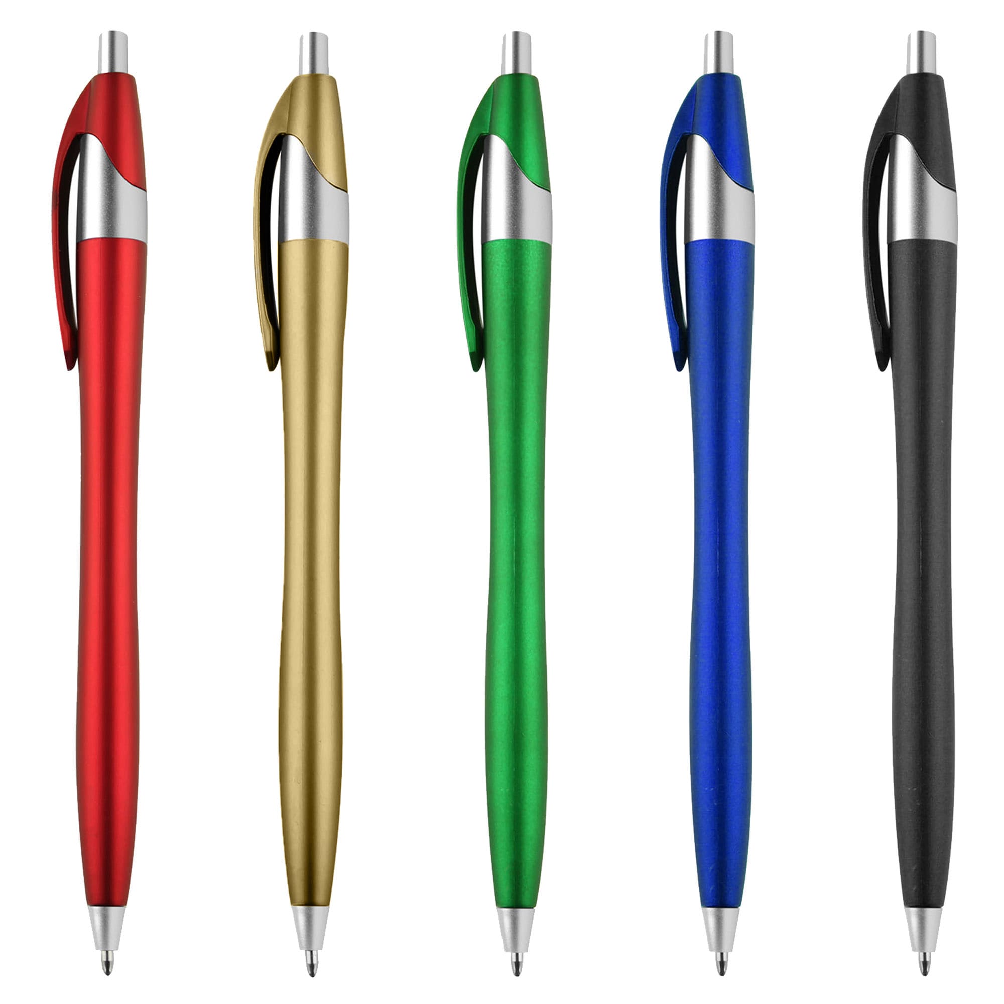 One of the most popular slim stylish plastic pen in promotions. Retractable pen with popular contoured design high quality affordable and a great solution for your next tradeshow office re-supply or give away. Metallic coloured barrel with silver push button neck and tip. Cross-type German manufactured black ink and tungsten carbide ball which brings you the better writing quality 1200 meters writing distance.
