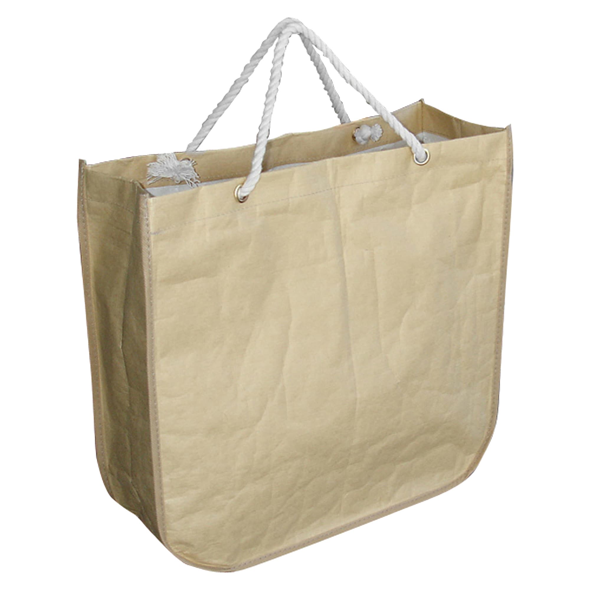 Stylish round corner paper bag with white PP woven laminated inside short cotton rope handles with reinforced metal eyelets to add more strength large gusset with a small pouch inside. Water resistant tough and strong. A great fashion bag branded with your logo for your promotional event.