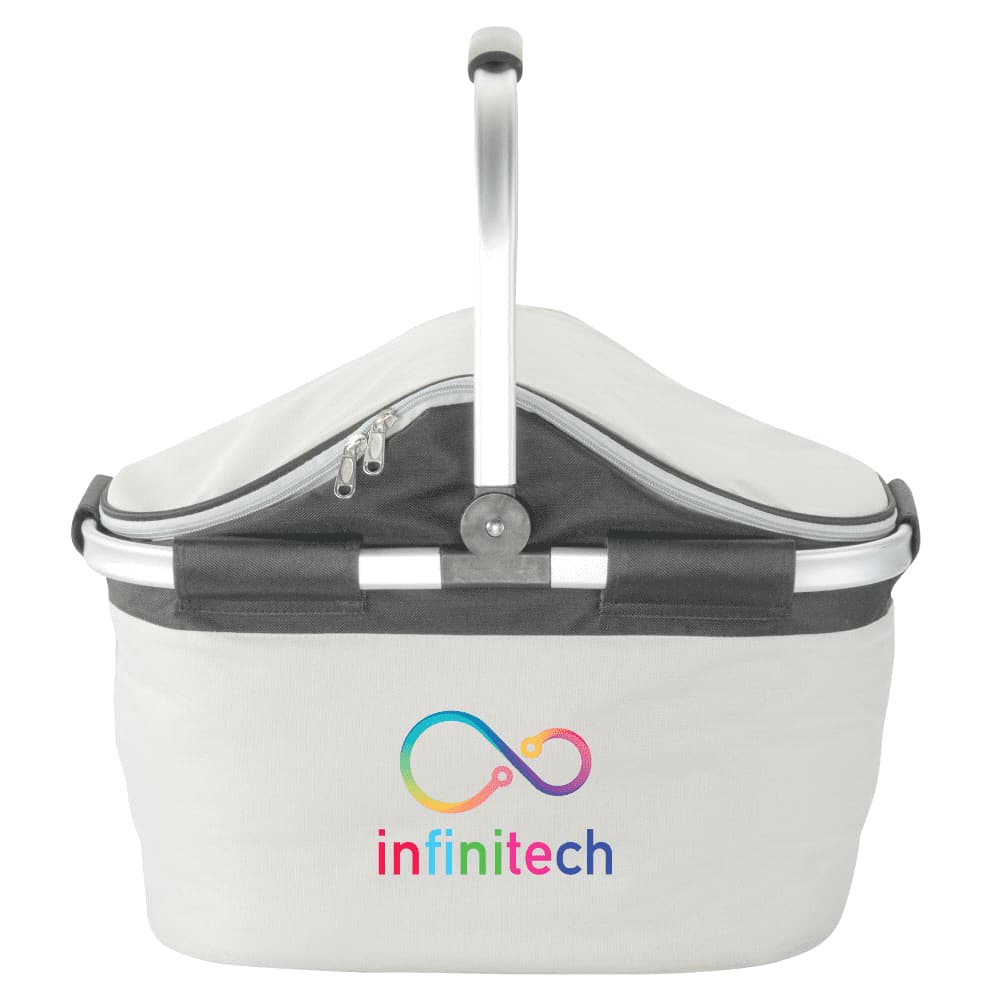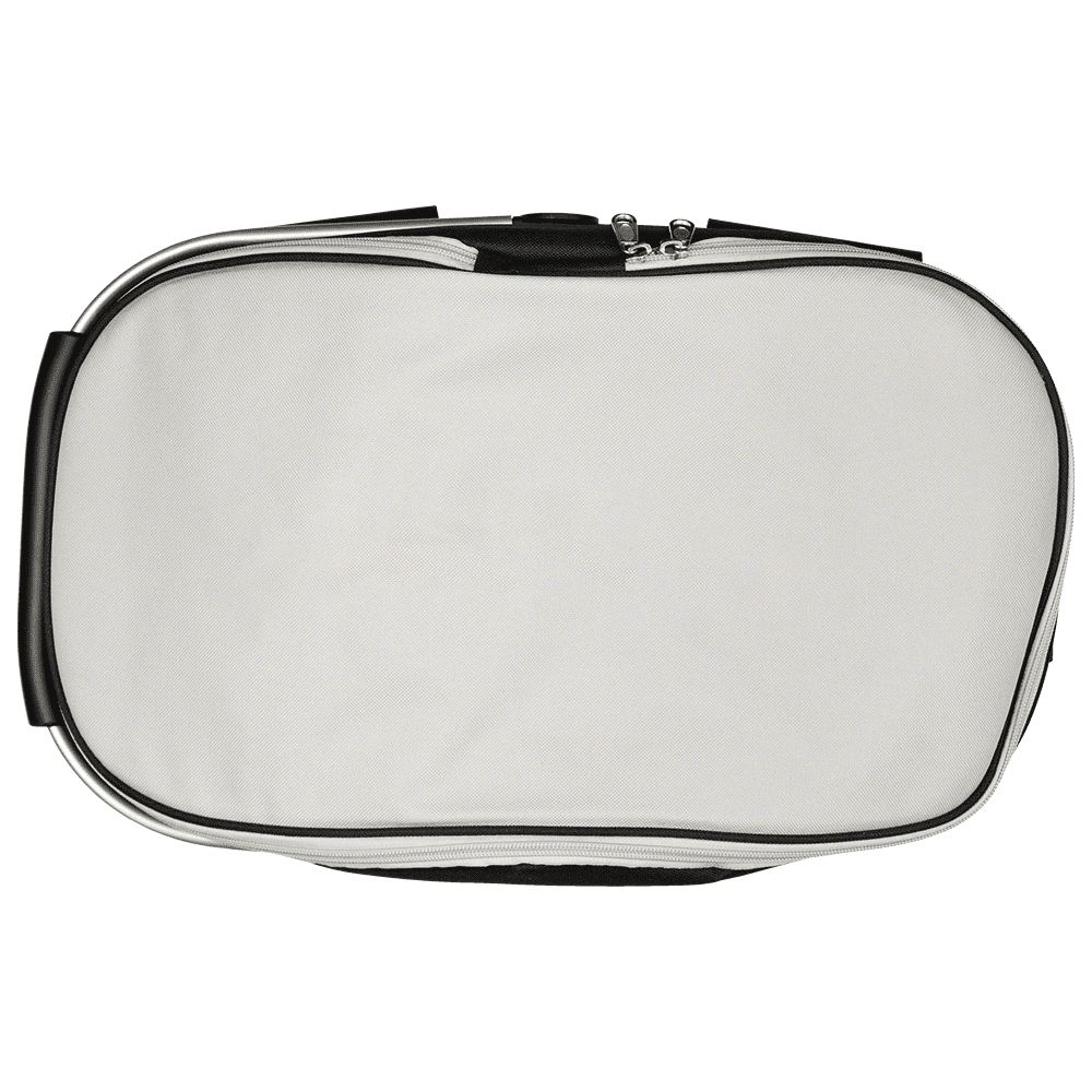 The ultimate picnic set. This innovative design comes with a folding metal frame, two insulated cooler sections and a complete picnic set. Supplied flat packed for easy transportation. Pale grey bag with black trim.