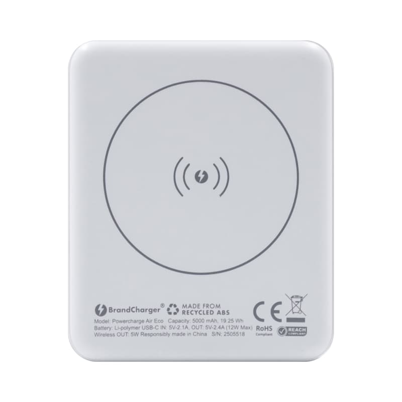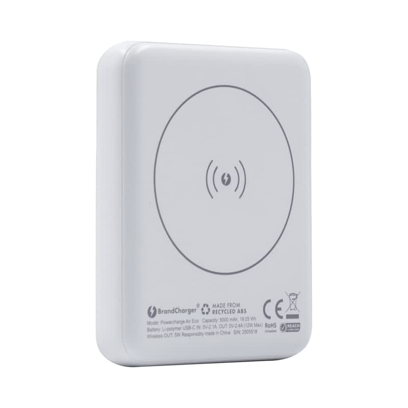 The Powercharge Air Eco is a pocket-sized powerbank crafted from recycled ABS, combining eco-friendliness with portability. Its 5,000 mAh capacity supports 5W wireless charging (Magsafe, Qi1, and Qi2) and comes with a 12W USB-C port for charging devices requiring a wired connection. With its low temperature smart chip technology the Air Eco protects devices from overcurrent, overdischarge, overcharging, overheating, and short-circuiting. It includes a LED battery indicator, Type-C charger cable, a user manual, and an additional magnetic ring that can be stuck to the rear of non-magnetic charging smartphones. Material: Recycled ABS.