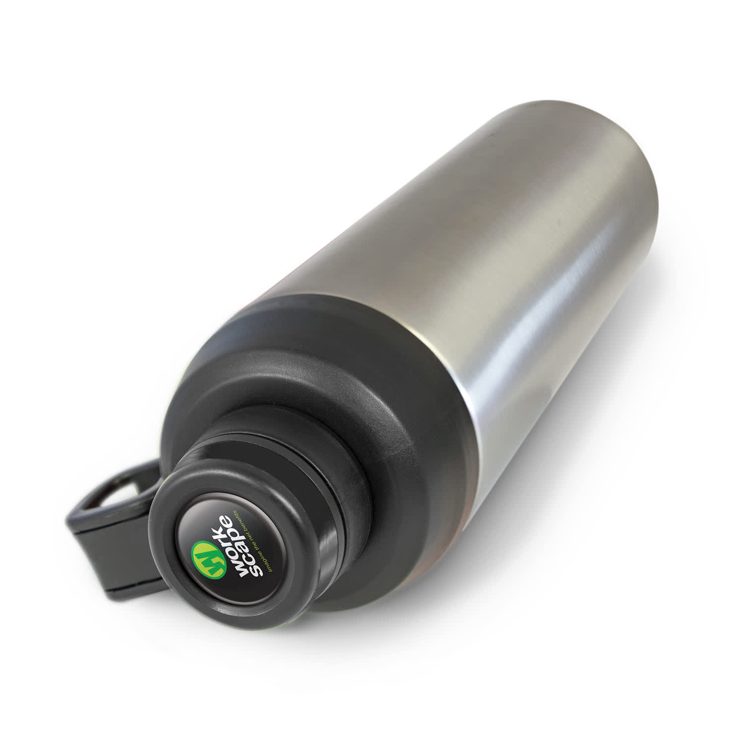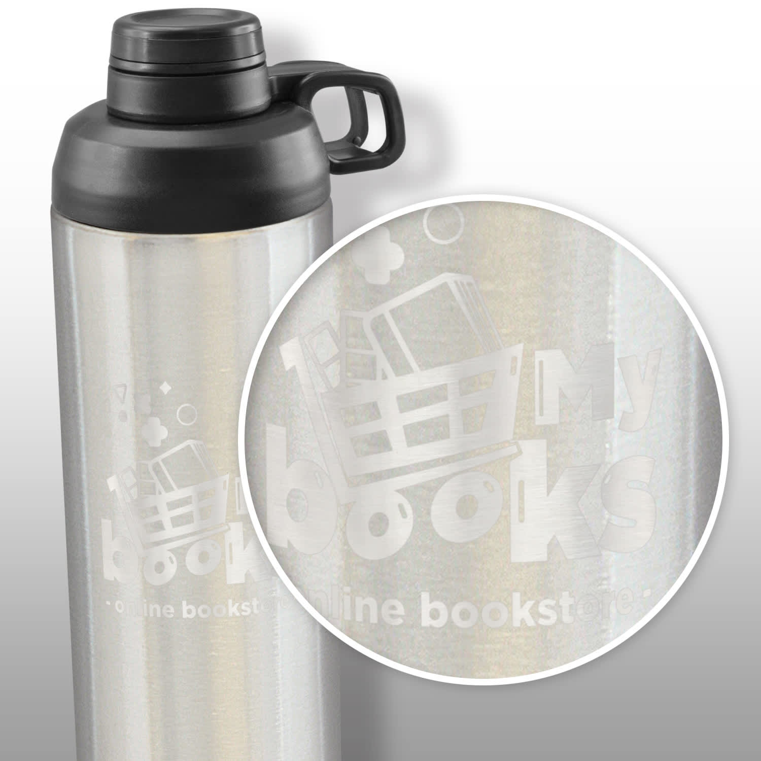 Large 900ml stainless steel drink bottle which has a secure screw on lid with a flip cap that has the option of adding a smart resin coated logo on the top. The lid also has a carry handle and a silicone outer ring for improved grip. Primo is BPA-free and has a wide opening which is ideal for adding ice cubes or fruit for flavouring. The black and white bottles laser engrave to a shiny steel finish and the silver bottle engraves to a natural etch. This product is not dishwasher safe and handwashing is recommended.