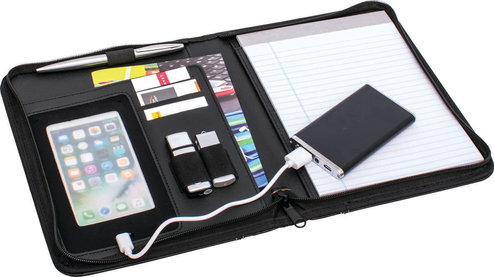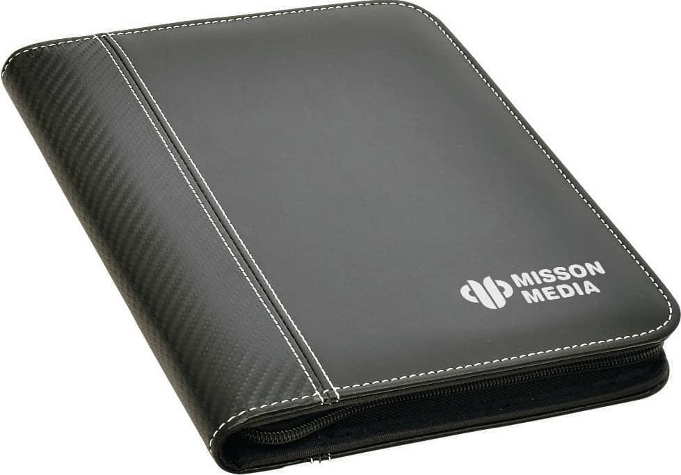 Made from soft-feel leatherette with carbon fibre inspired trim, this stylish A5 portfolio features contrast stitching as well as a mobile phone pocket (with conductive covering allowing you to operate the mobile phone while in the pocket). Designed to hold your accessories in one place, including charging cables, ear buds, business cards and a pen. To ensure your valuables don’t get lost, this portfolio includes an outer zip closure. A ruled top folding A5 notepad is included, which can be replaced after use with either a top or side folding notepad. (Accessories not included)