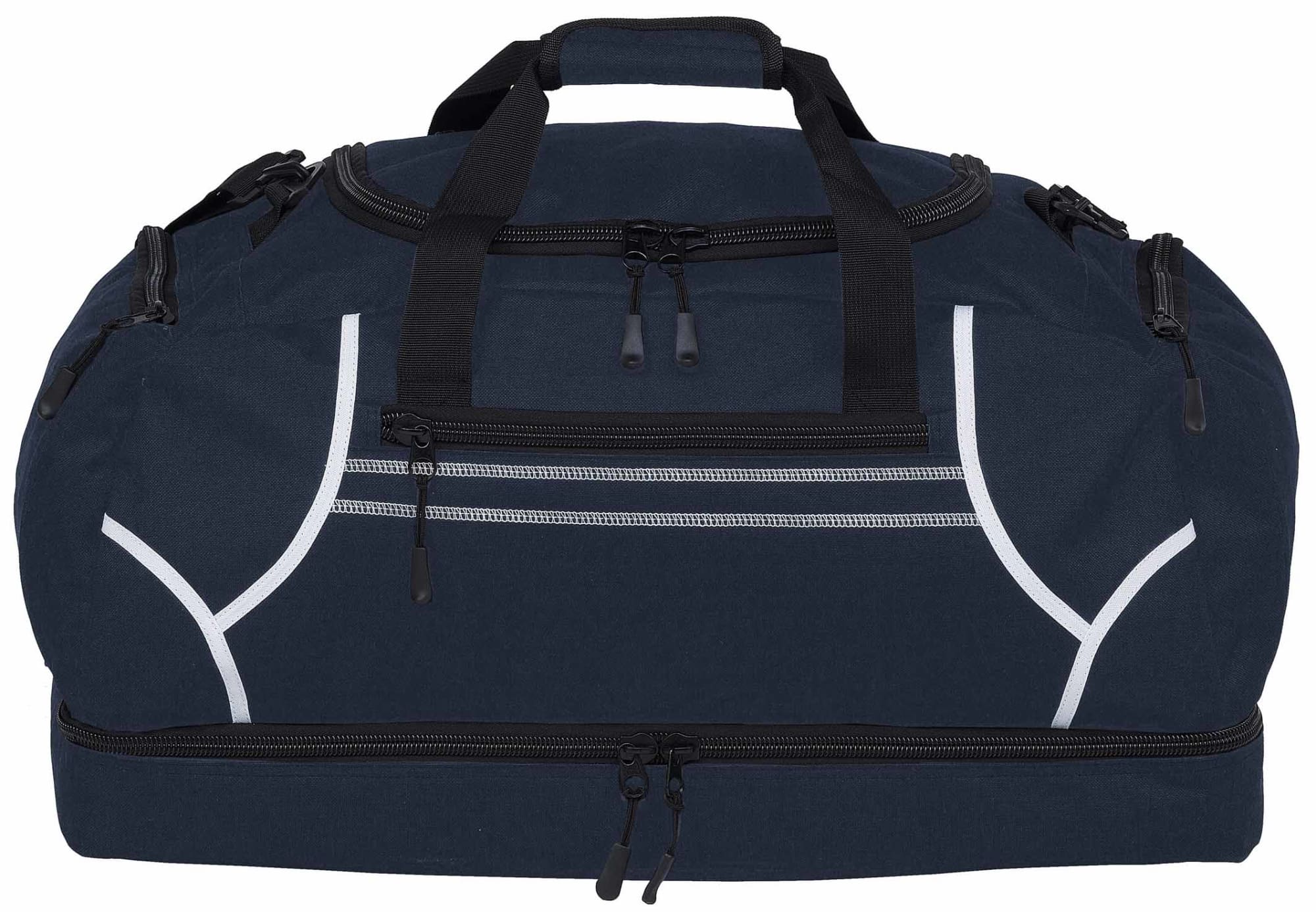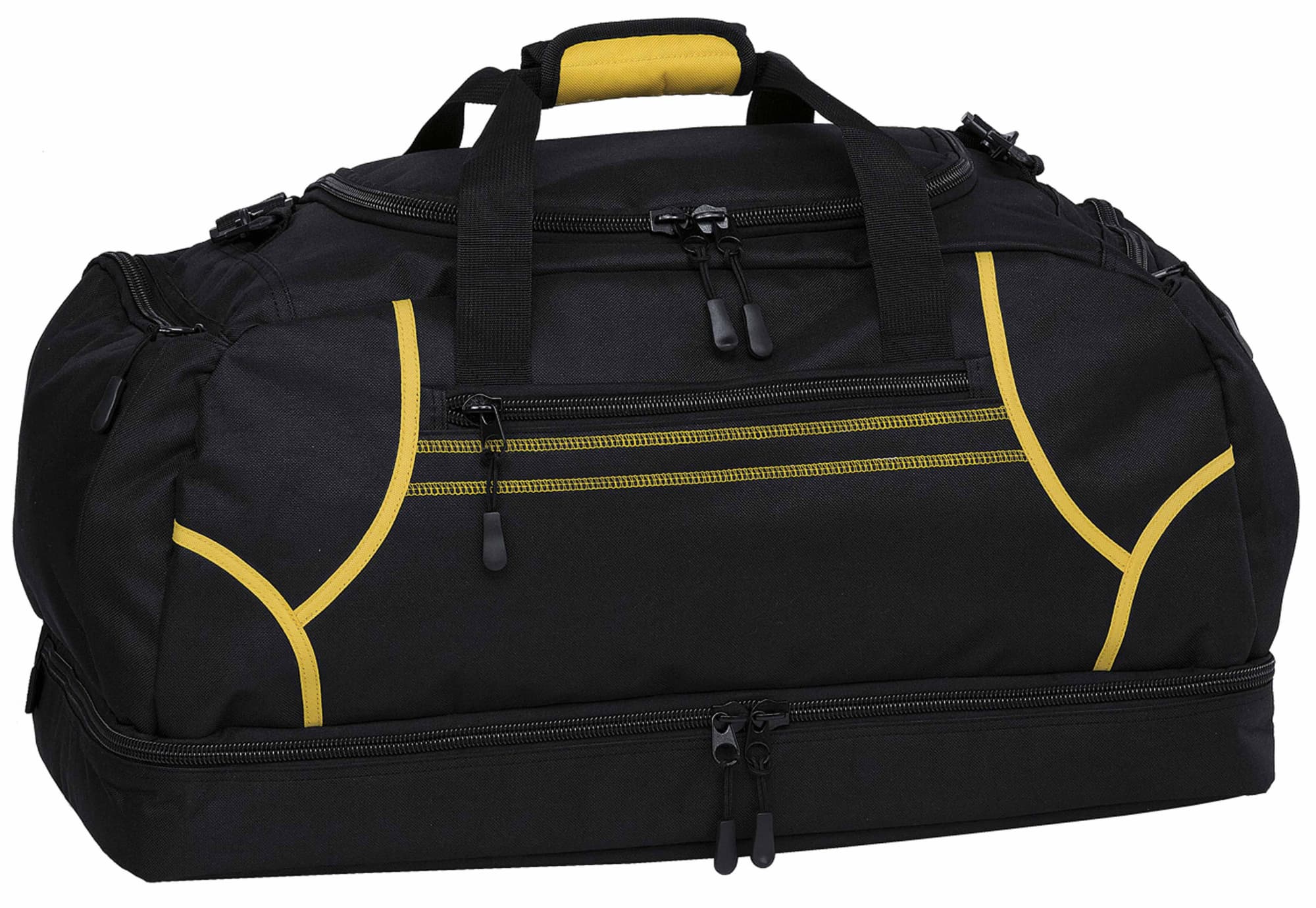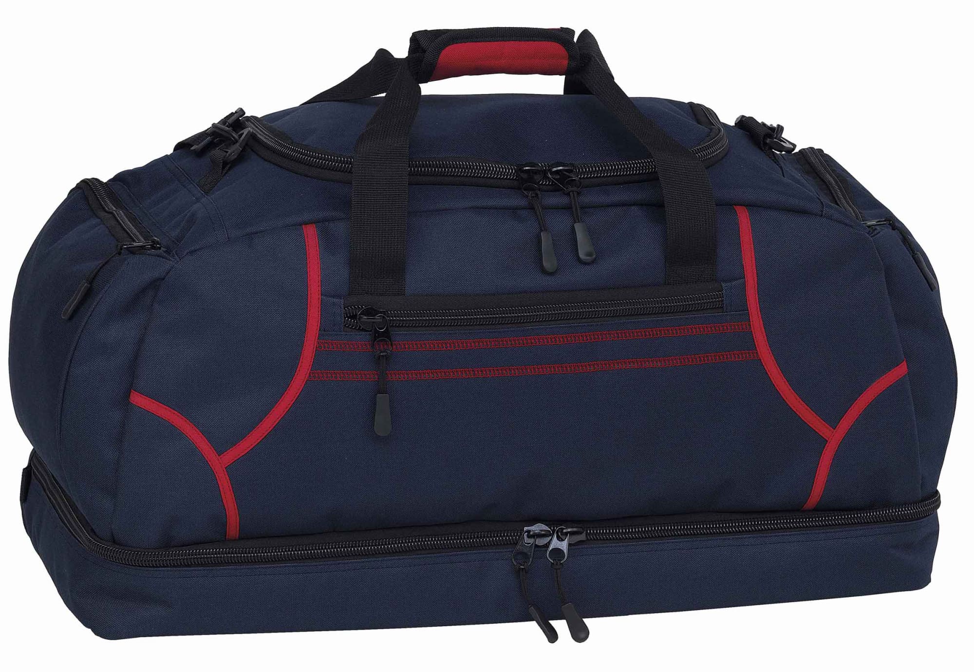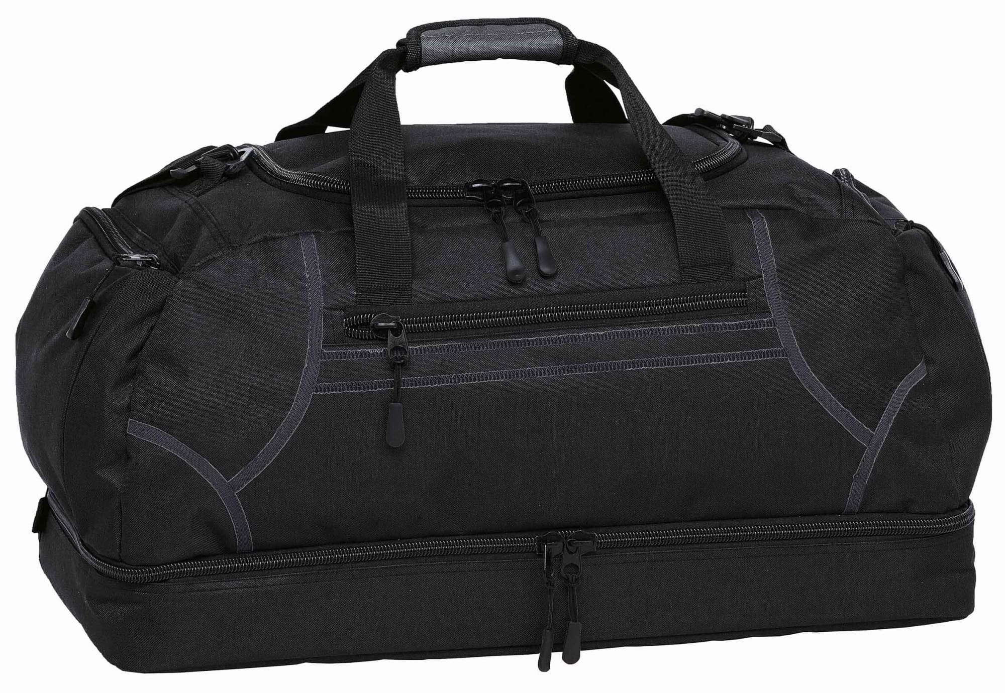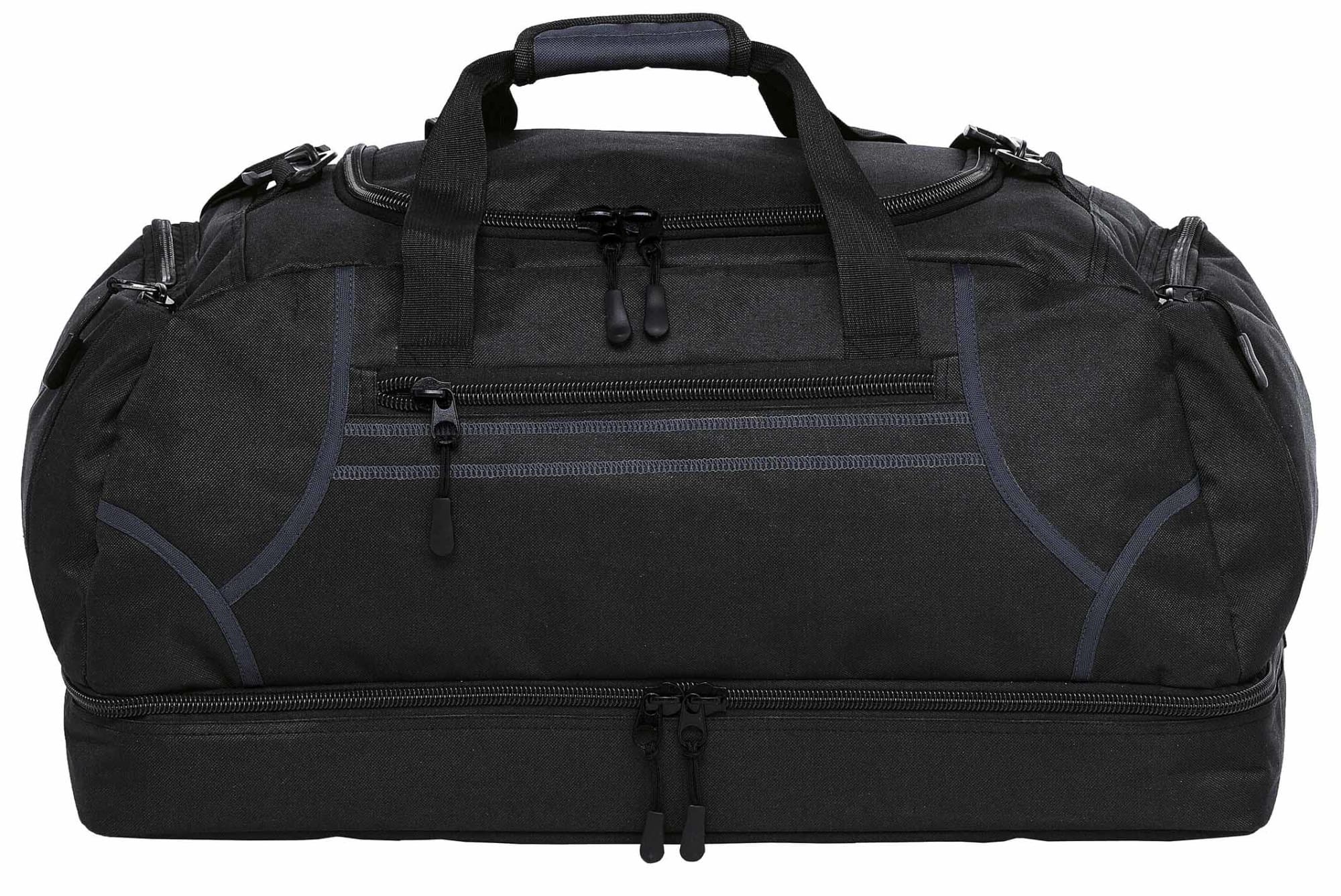 600D polyester with latex rubber backing|Huge main compartment with U-shaped zippered opening|Quick stash zippered front pocket with contrast twin cover stitch detailing|Two zippered end compartments|Drop bottom zippered compartment|Detachable/adjustable padded shoulder strap|Velcro wrap carry handle for comfortable grip|Heavy duty zippers and accessories|Rubber feet for added protection|Capacity: 55 Litres