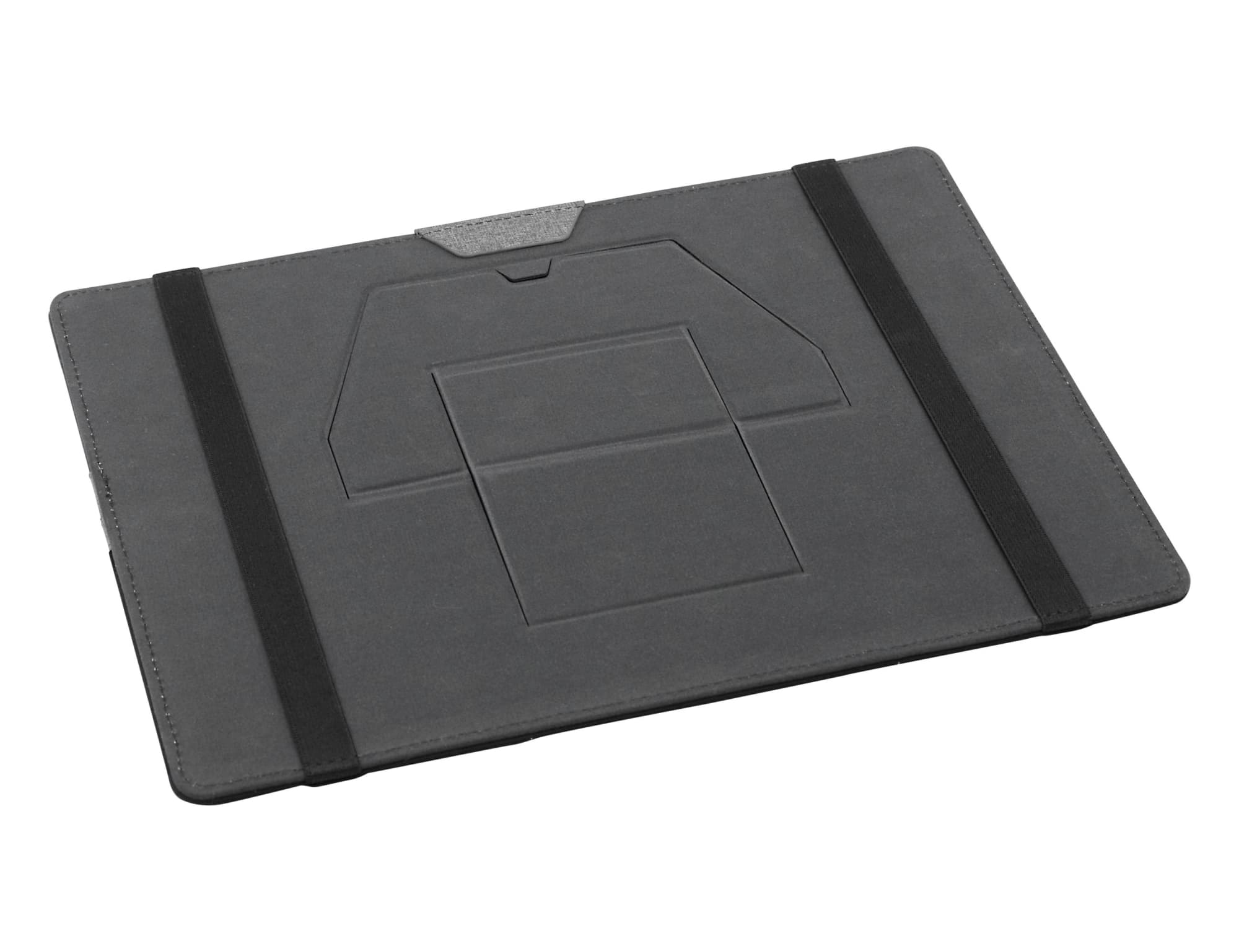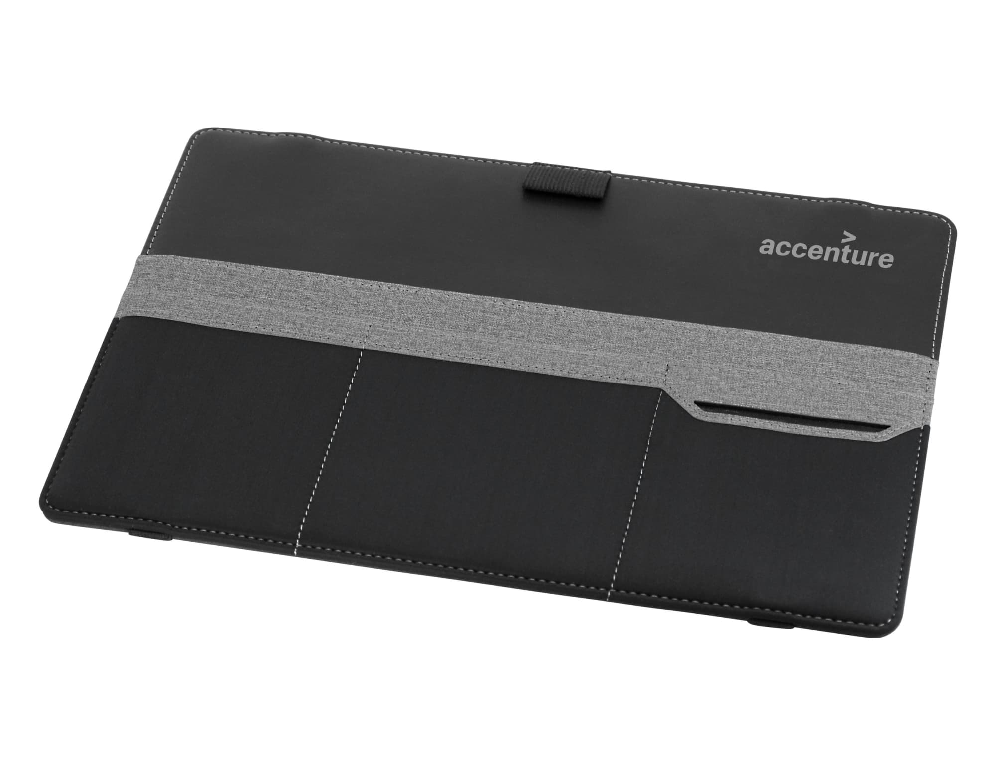 This organiser easily attaches to a laptop and is designed to keep all your stationery and tech products together for easy access. Standing upright, it features a fold-out leg, multiple pockets to hold a phone, cards, chargers, brochures and much more.