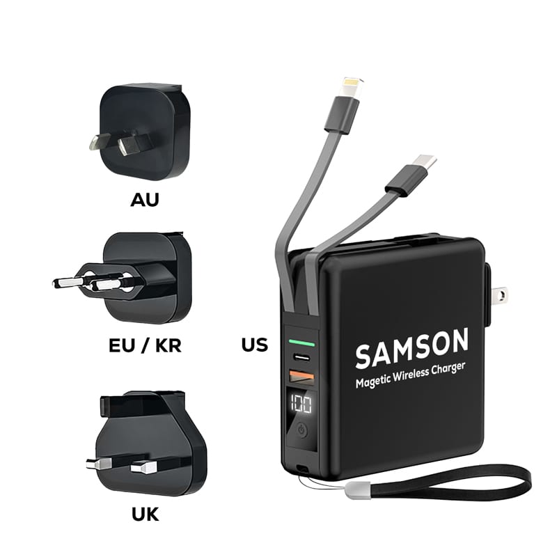 Introducing Samson, the ultimate travelling companion. This global travel adaptor provides 15-watt Magnetic wireless charging, integrated Type-C and lightning cable connectivity. This 10,000 mAh power bank combines the best of both worlds by allowing you to travel and conveniently fast charge your devices without extra cables. In addition, its 3 interchangeable adapters allow for direct connection to power sockets in most countries worldwide. Offering Type-C Power Direct (20W), Quick Charge 3.0 (18W), and magnetic wireless outputs, this travel charger gives you peace of mind with over-current, over-voltage and short-circuit protection. This power bank is compatible with iOS, Android, and any Qi-enabled wireless device, and it will charge multiple devices simultaneously. Includes USA, EU, UK, HKG and AU adapters, a magnetic ring sticker, a hand strap and a user manual, all packaged in a fabric-covered EVA zippered case. Material: ABS, PC.