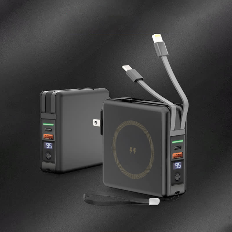 SpecificationsBattery Capacity: 10000 mAh (36Wh) (Min 9600mAh). AC Input: 100-240V - 50/60Hz 0.5A, Type-C (PD) 5V/3A, 9V/2A (18W Orange). Charger Mode Output: 5V/3A (Total). Power Bank Output: Type-C (PD) 5V/2.4A, 9V/2.22A, 12V/1.67A (20W). USB QC3.0 5V/2.4A, 9V/2A, 12V/1.5A. Type-C Cable Output: 5V/3A, 9V/2A, 12V/1.5A. Lightning Cable Output: 5V/2A. Magnetic Wireless Charging Output: 15 Watts (backward compatible), Charge Coil: 1, Charging Distance: < 10 mm, Charging Efficiency: 90%. Battery Charge Time: 3-4 hours, Number of Device Charges: iPhone 15 Pro (185%), iPad Air 10th Gen (80%), Samsung s23 (155%), Charge Cycle > 500 times. Total Output: Cable+Type-C+USB+Wireless: 5V/3A. Weight: 258g.