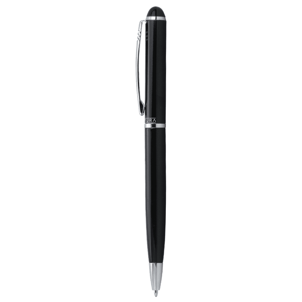 Exclusively designed twist type ballpoint pen. The silver has a matte finish, the black a gloss