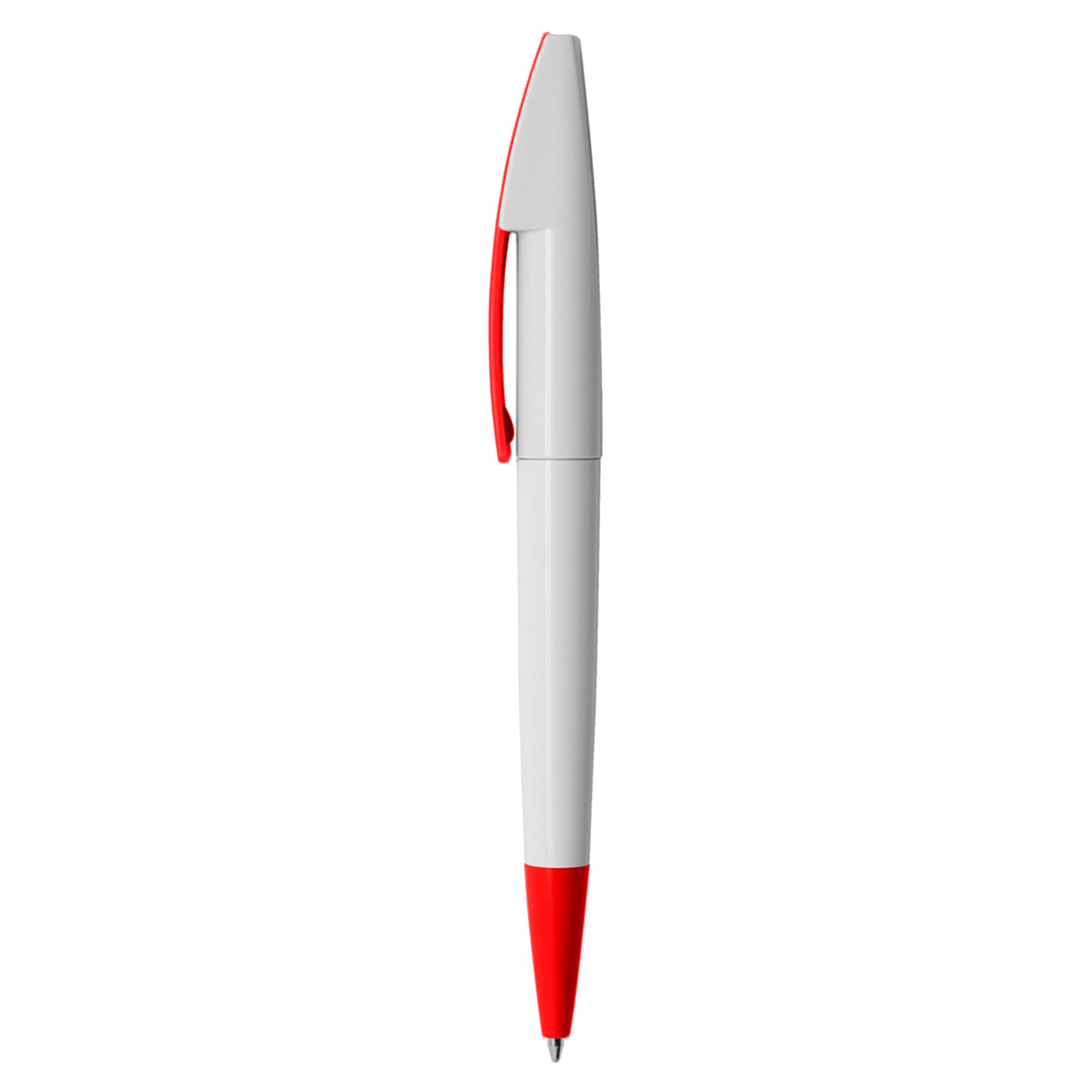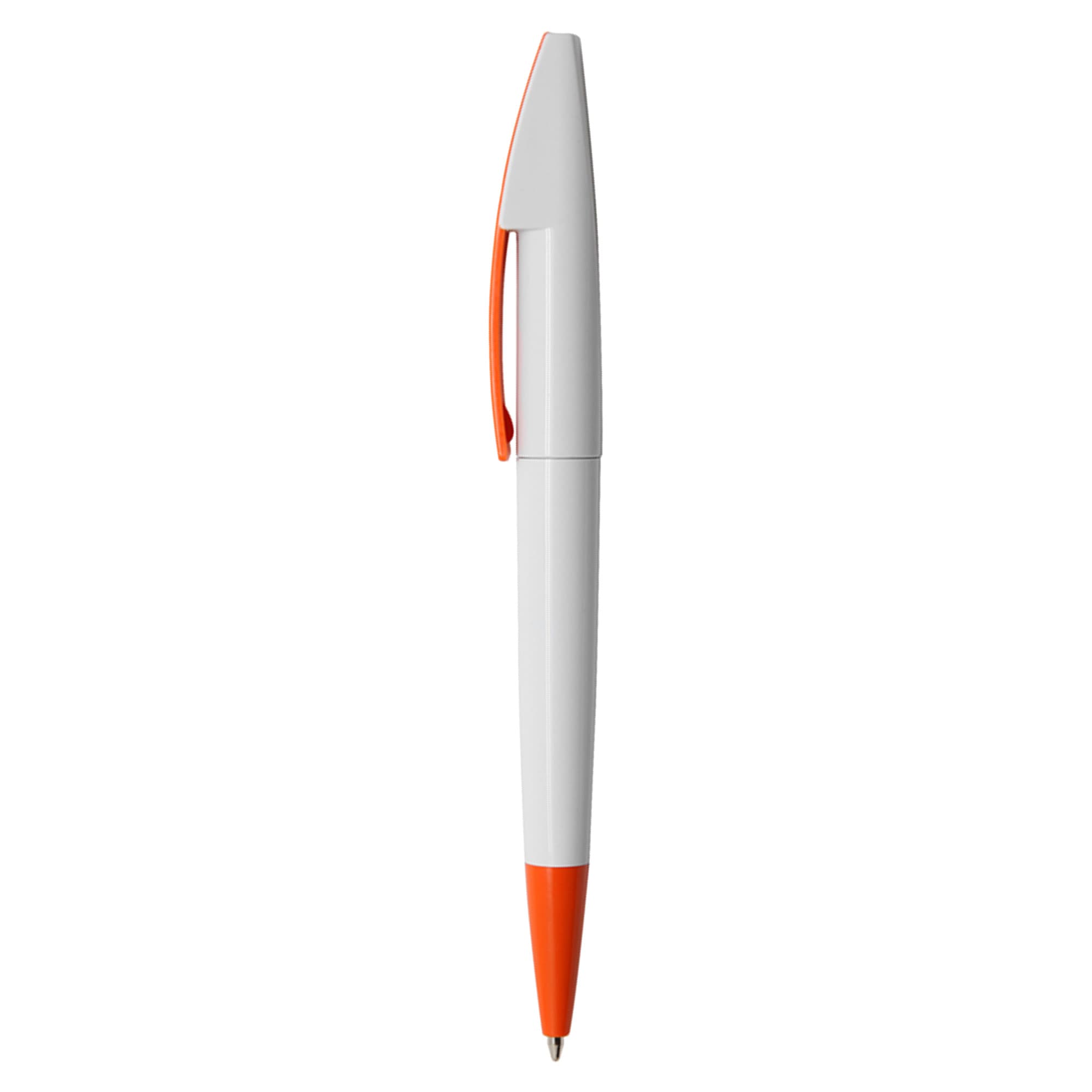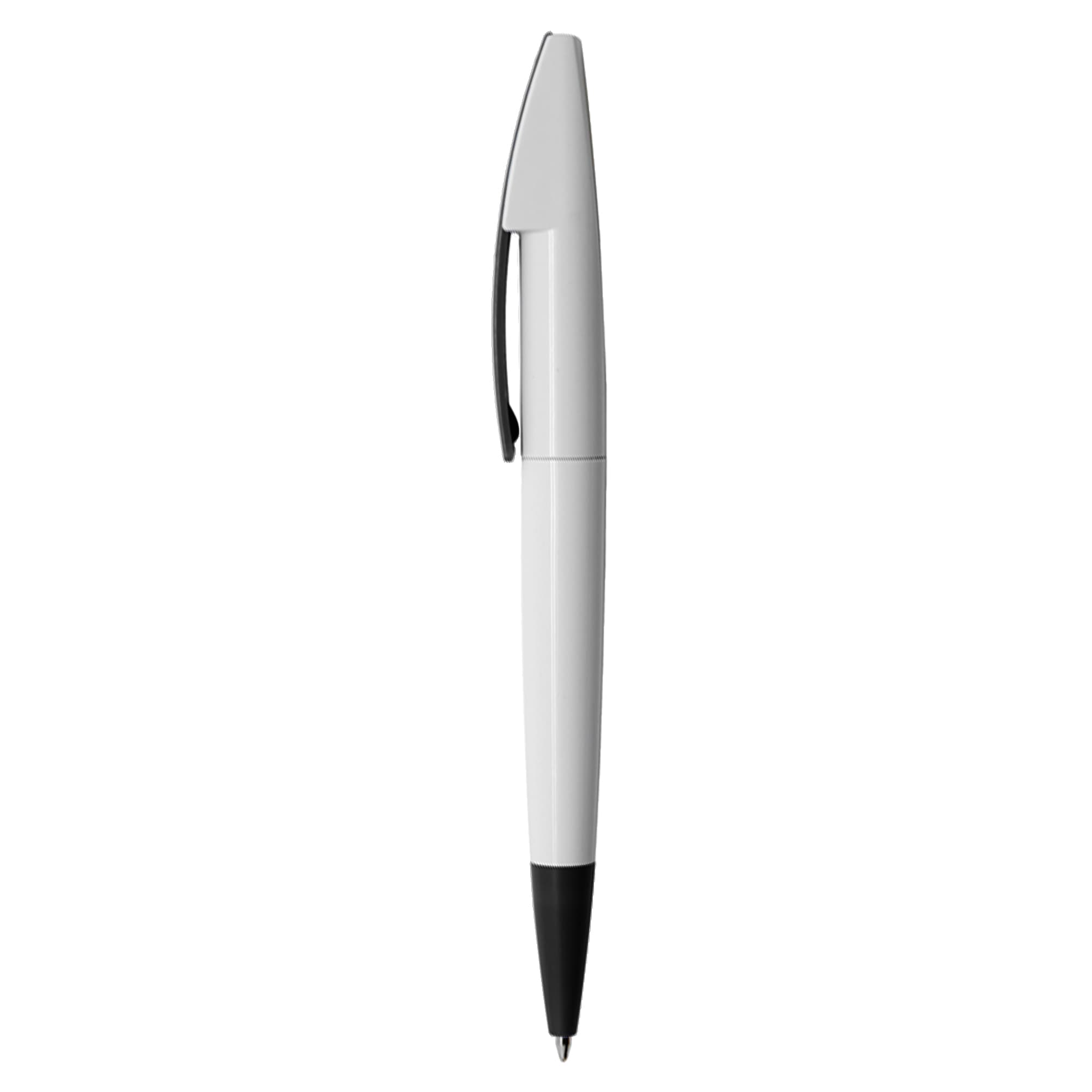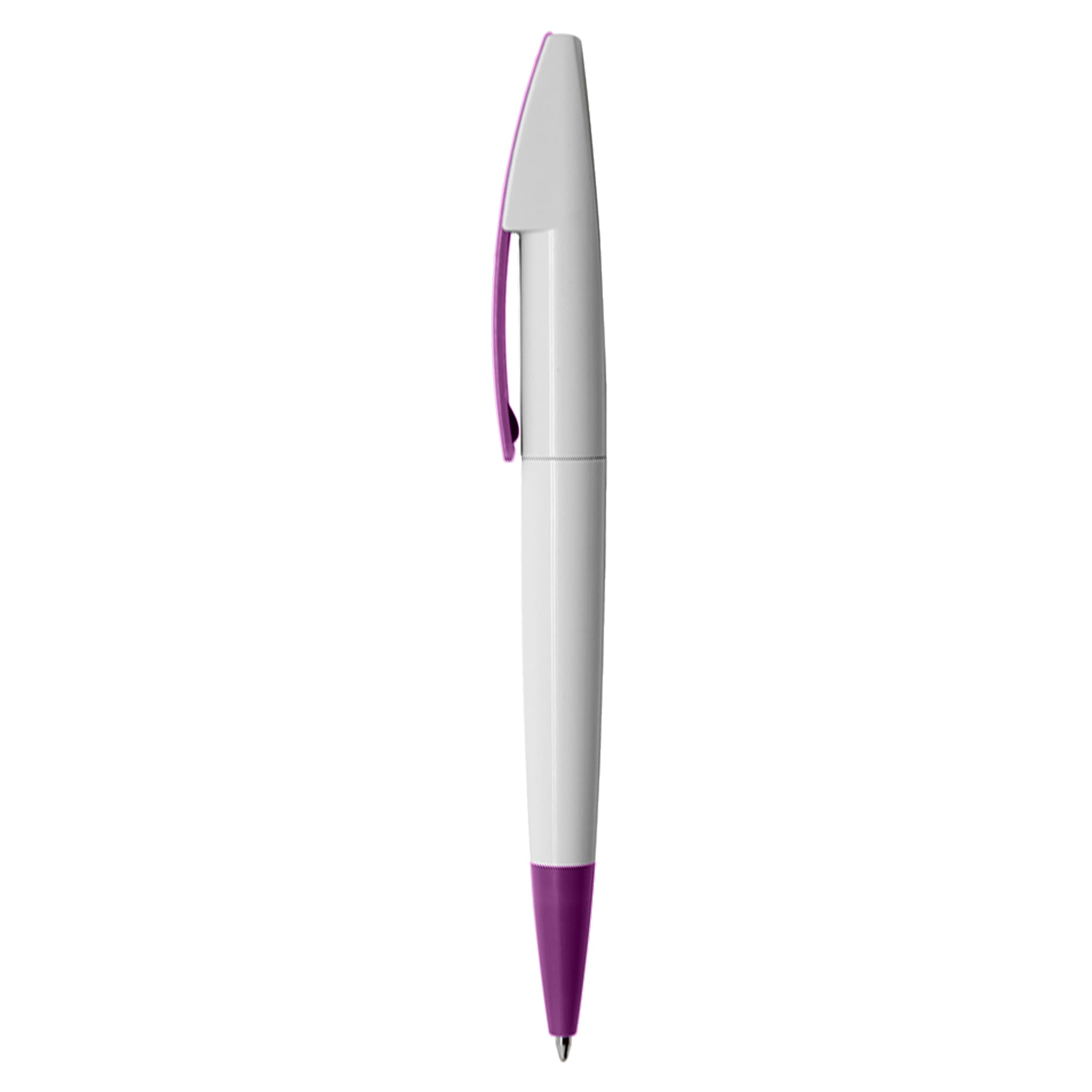 Quality European style plastic pen with white barrel and coloured clip and tip large printing area on clip twist action with high quality German manufactured black ink refill 1800 meters writing distance tungsten carbide ball provides you with quality writing.