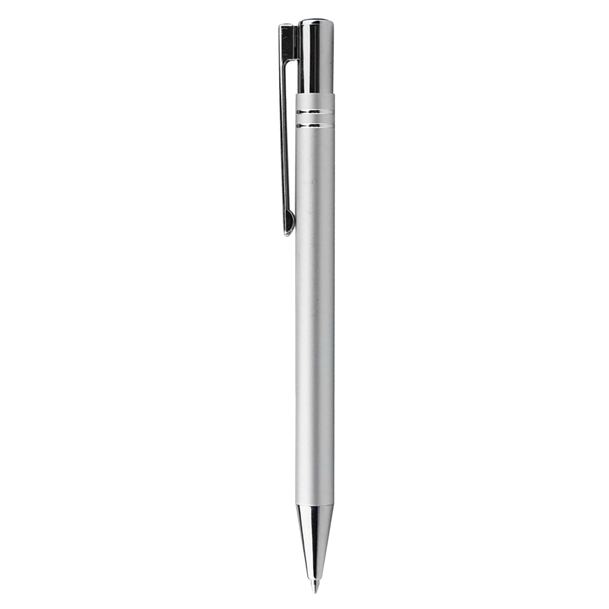 Simple design aluminium metal pen with glossy metallic finish barrel. Click action with shiny silver chrome trim large printing area. High quality German manufactured black ink refill 1200 meters writing distance tungsten carbide ball provides you with quality writing. Comes standard with black ink but blue ink is available on request.