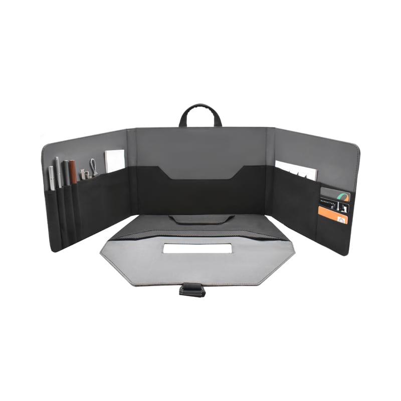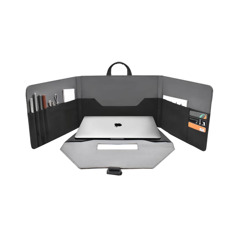 Ultimate “Anywhere” Workstation Bag! Work whenever and wherever you see fit with the Specter Workspace Laptop Bag. Loaded with handy compartments, convenient features, and exceptionally modern design, this bag is like taking your office on the go without the bulk. The Specter Workspace Bag is designed with remote workers and digital nomads in mind. The bag’s unique folding design reveals an ergonomic workstation perfect for your laptop or tablet. In addition, pockets are included for your smartphone, wallet, business cards, documents and more. Material: Polyester, Nylon.