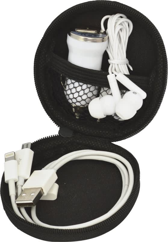 Spirit Techno Kit ensures all your mobile charging and sound are kept in one place. Featuring a USB 3-in-1 charging cable (30 pin/Lightning/Micro USB), phone car charger and earphones all packed into a soft-feel mini case for safe keeping