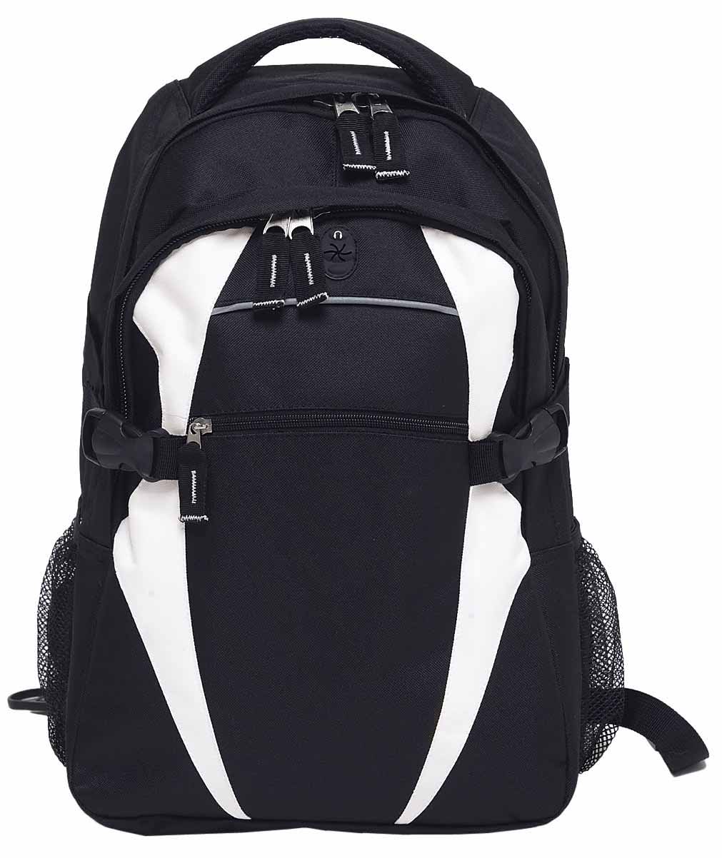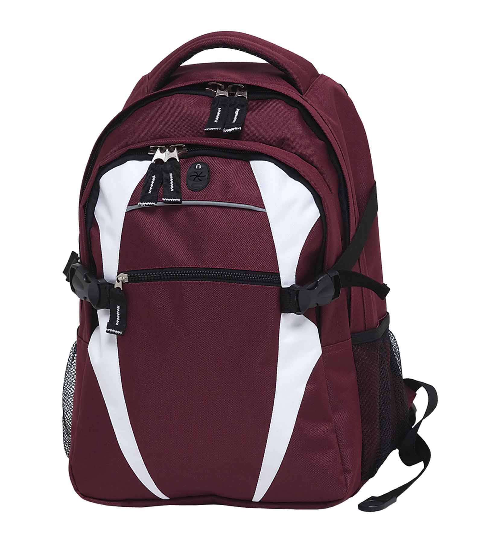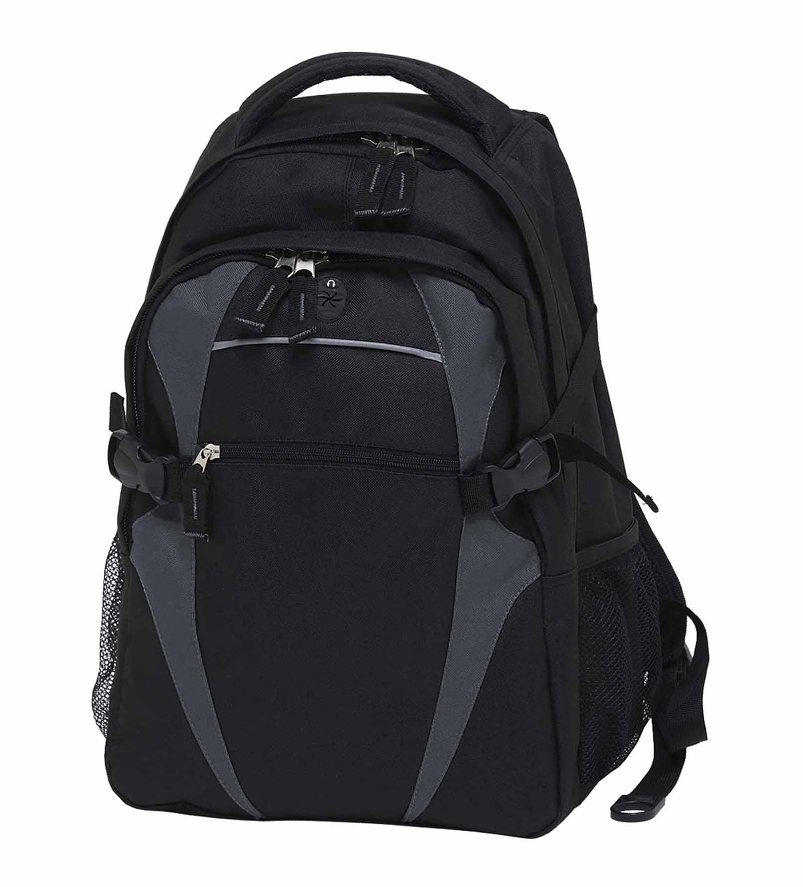 600D polyester with latex rubber backing|Two separate storage compartments|Quick stash zippered front pocket with reflective piping|Mesh backed shoulder straps and contoured padded mesh back panels|Quick release side compression straps|Dual mesh drink bottle pockets (bottles shown not included)|Heavy duty zippers and accessories|Rubber feet for added protection|Mesh backed padded quick grab handle|MP3 pocket in front compartment with rubber headphone exit port|Capacity: 28 Litres