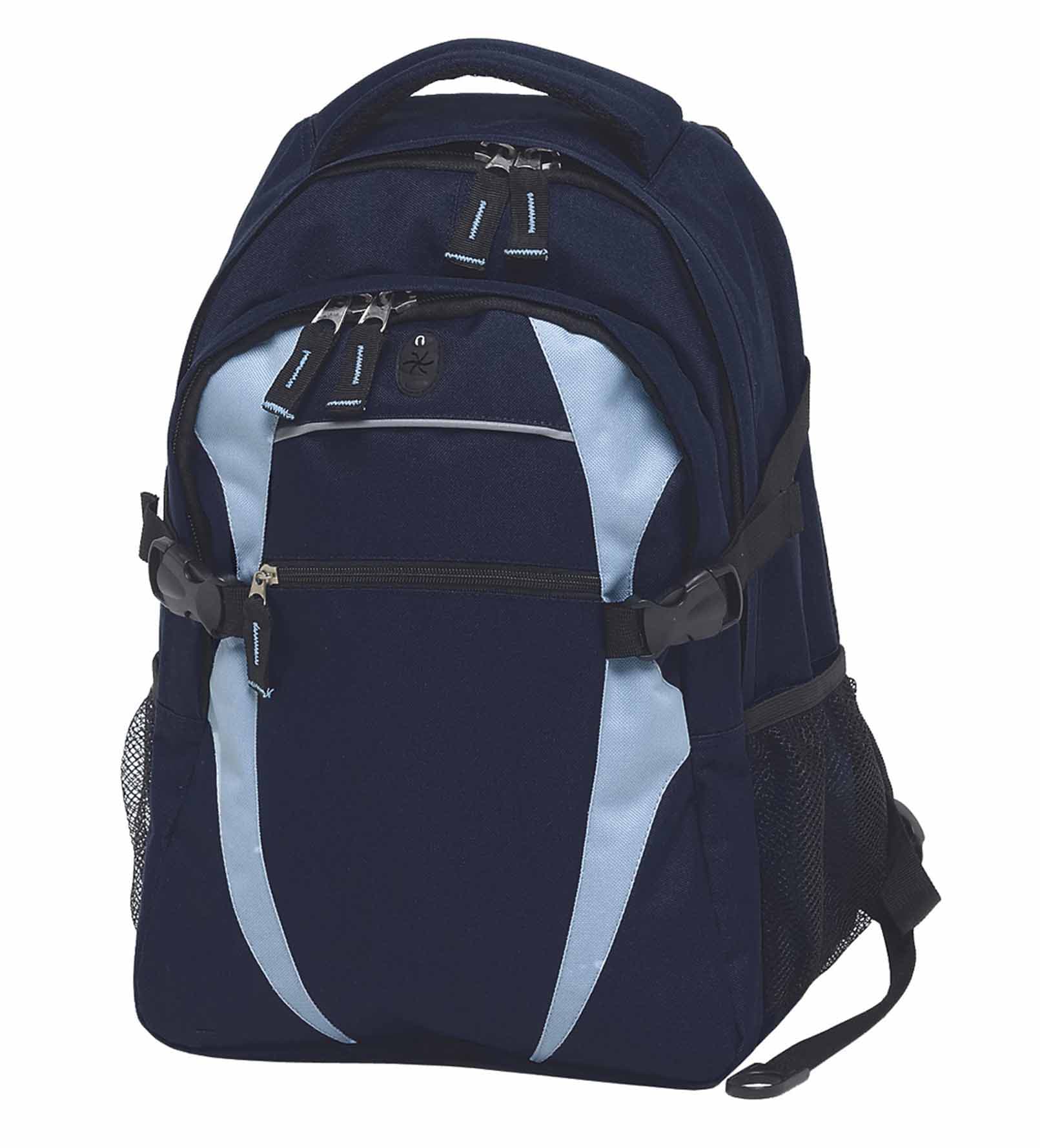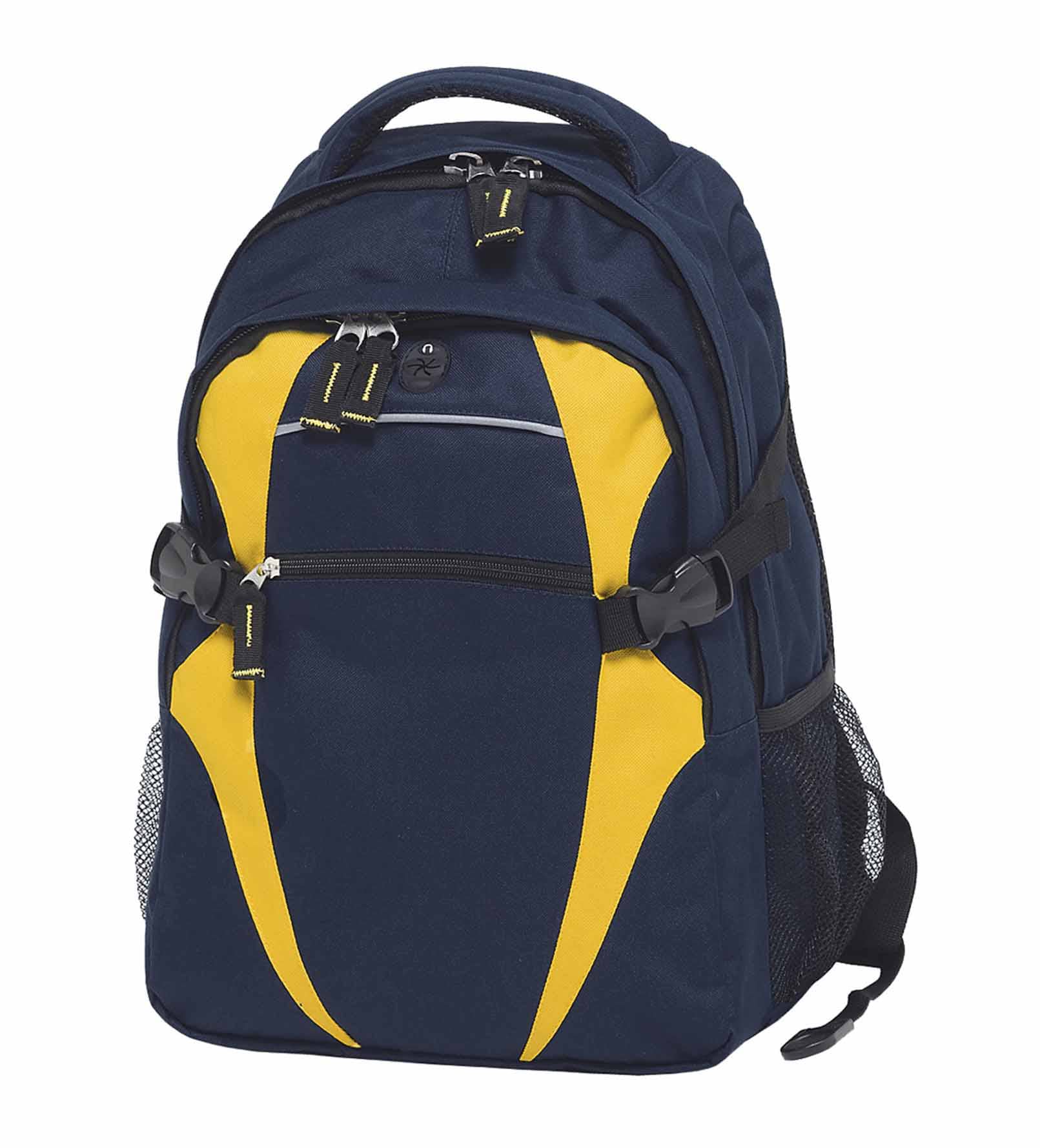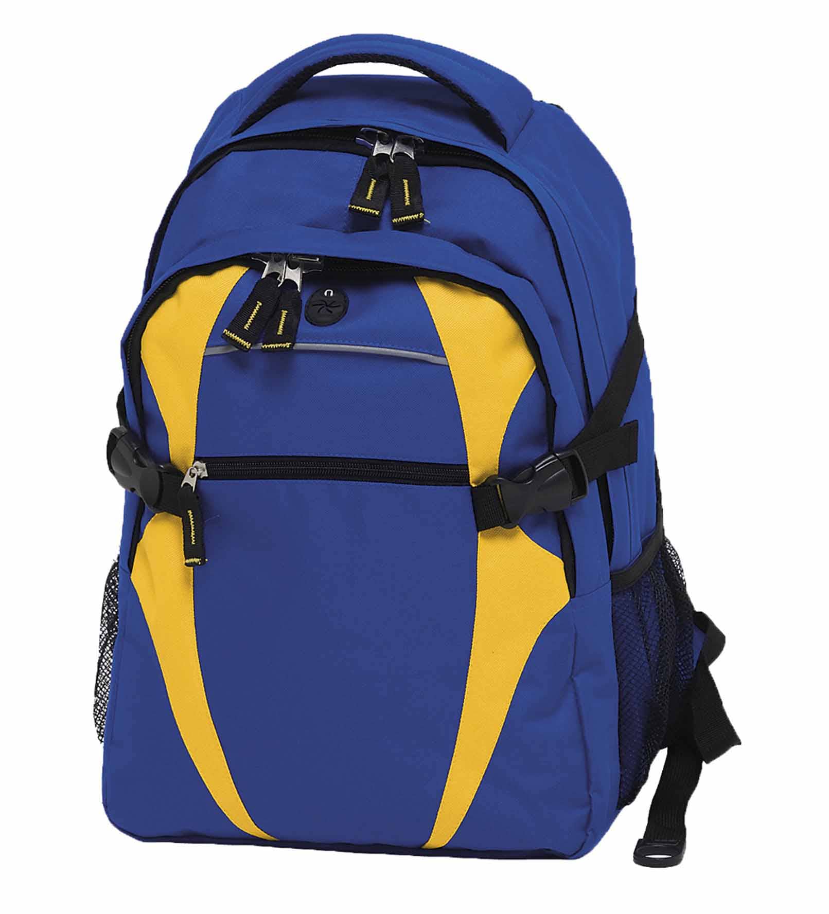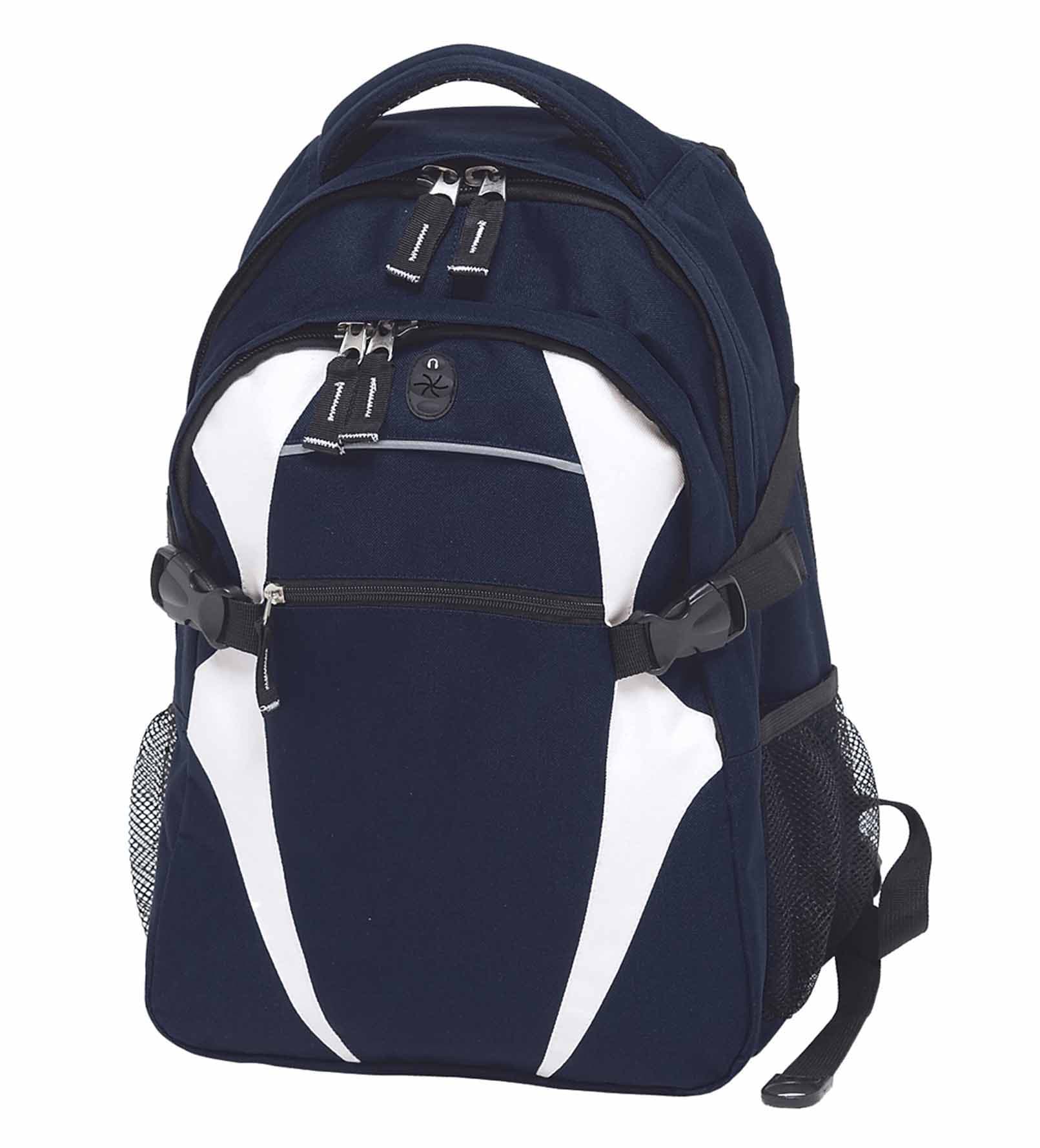 600D polyester with latex rubber backing|Two separate storage compartments|Quick stash zippered front pocket with reflective piping|Mesh backed shoulder straps and contoured padded mesh back panels|Quick release side compression straps|Dual mesh drink bottle pockets (bottles shown not included)|Heavy duty zippers and accessories|Rubber feet for added protection|Mesh backed padded quick grab handle|MP3 pocket in front compartment with rubber headphone exit port|Capacity: 28 Litres