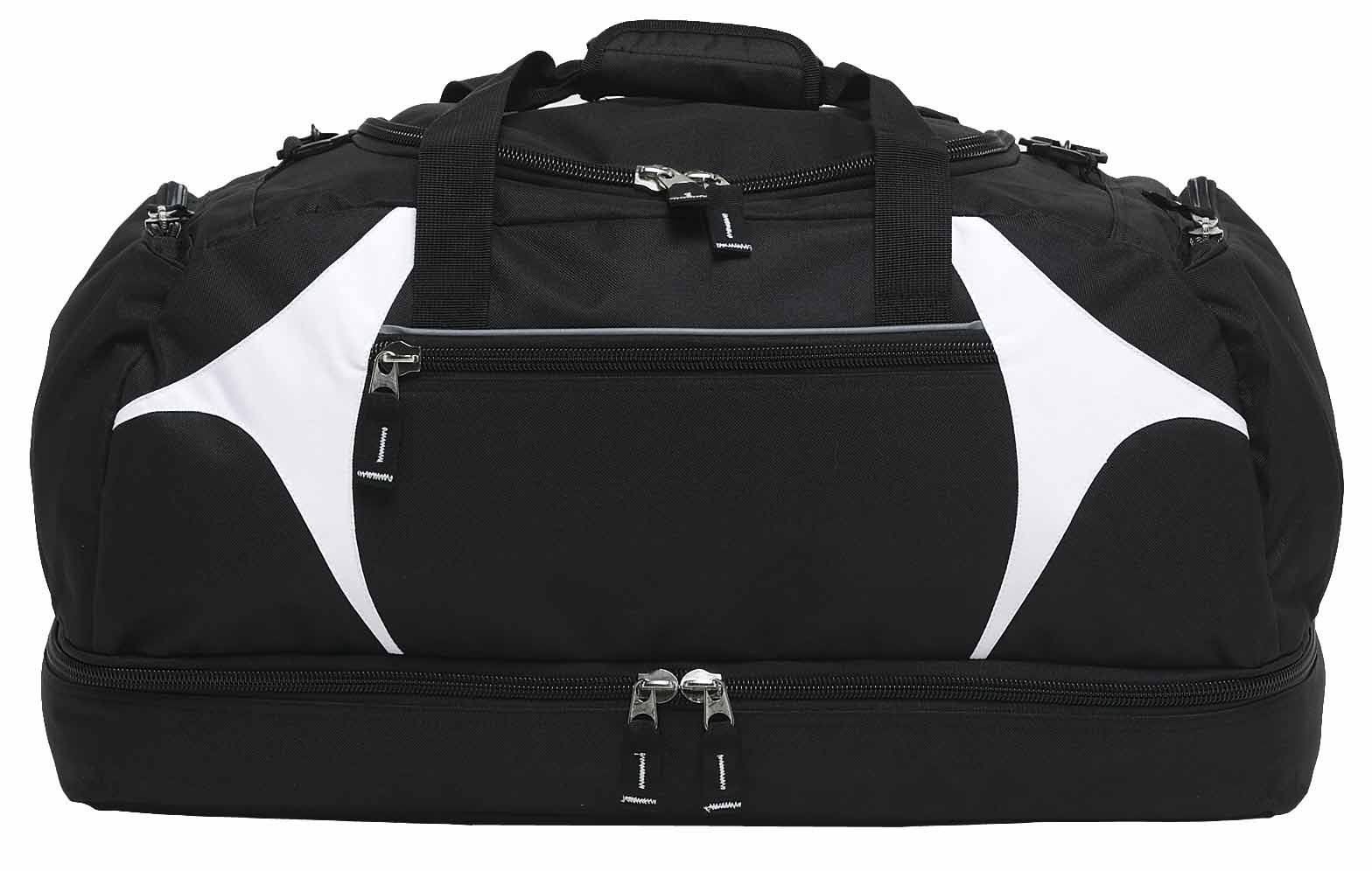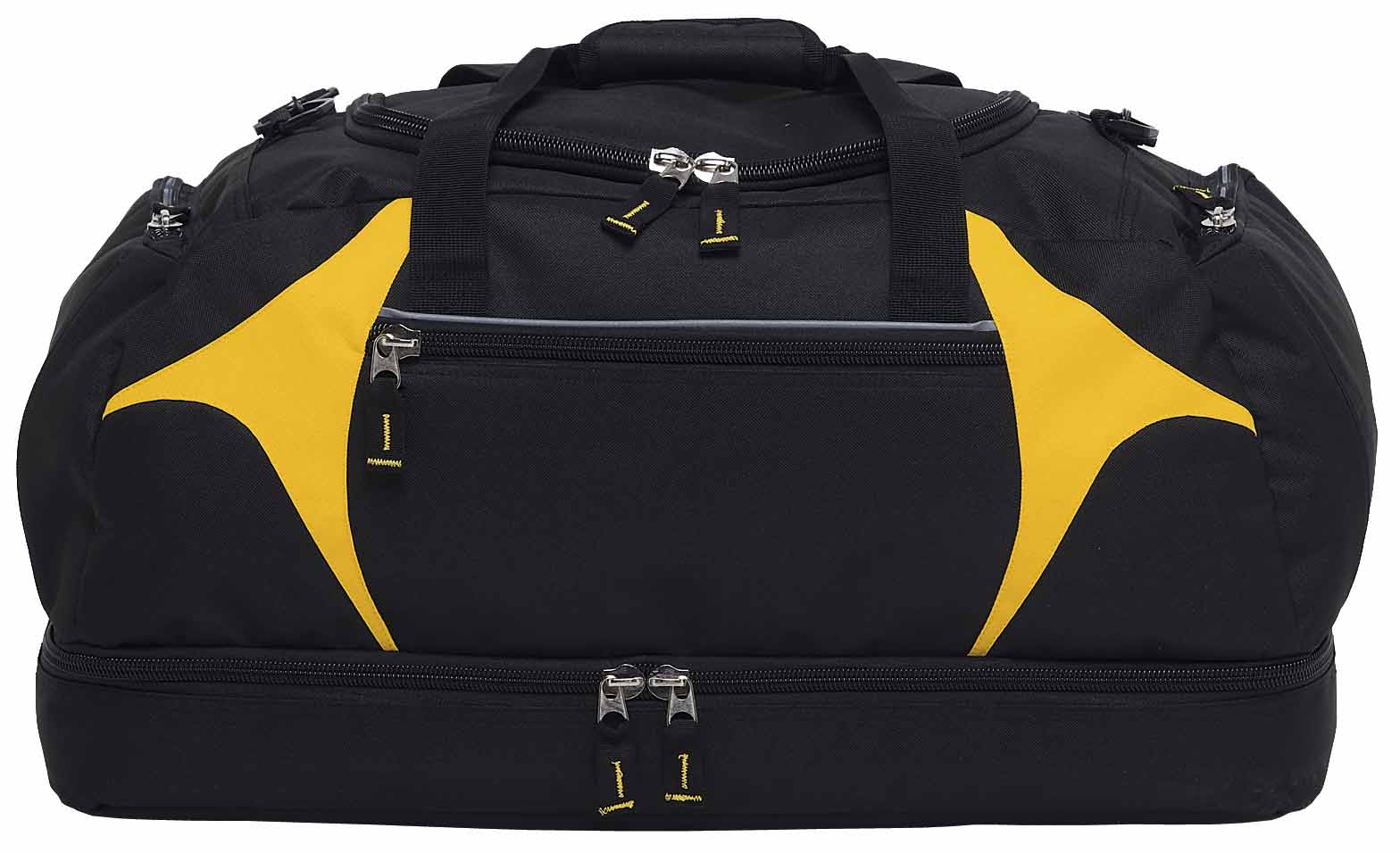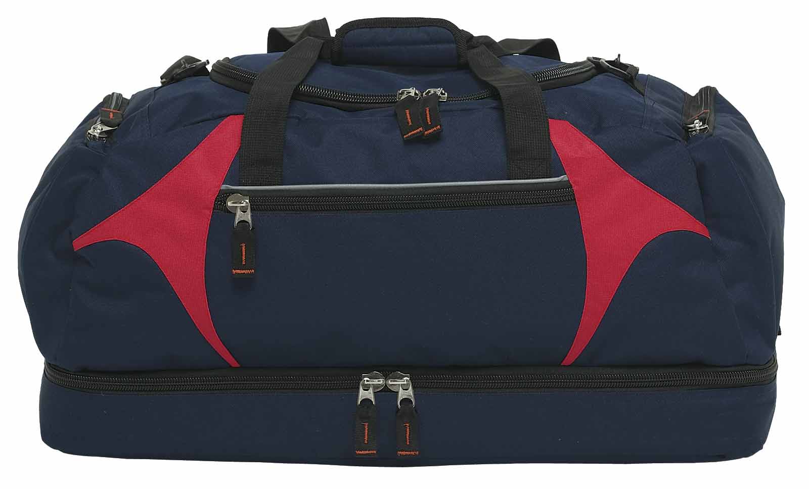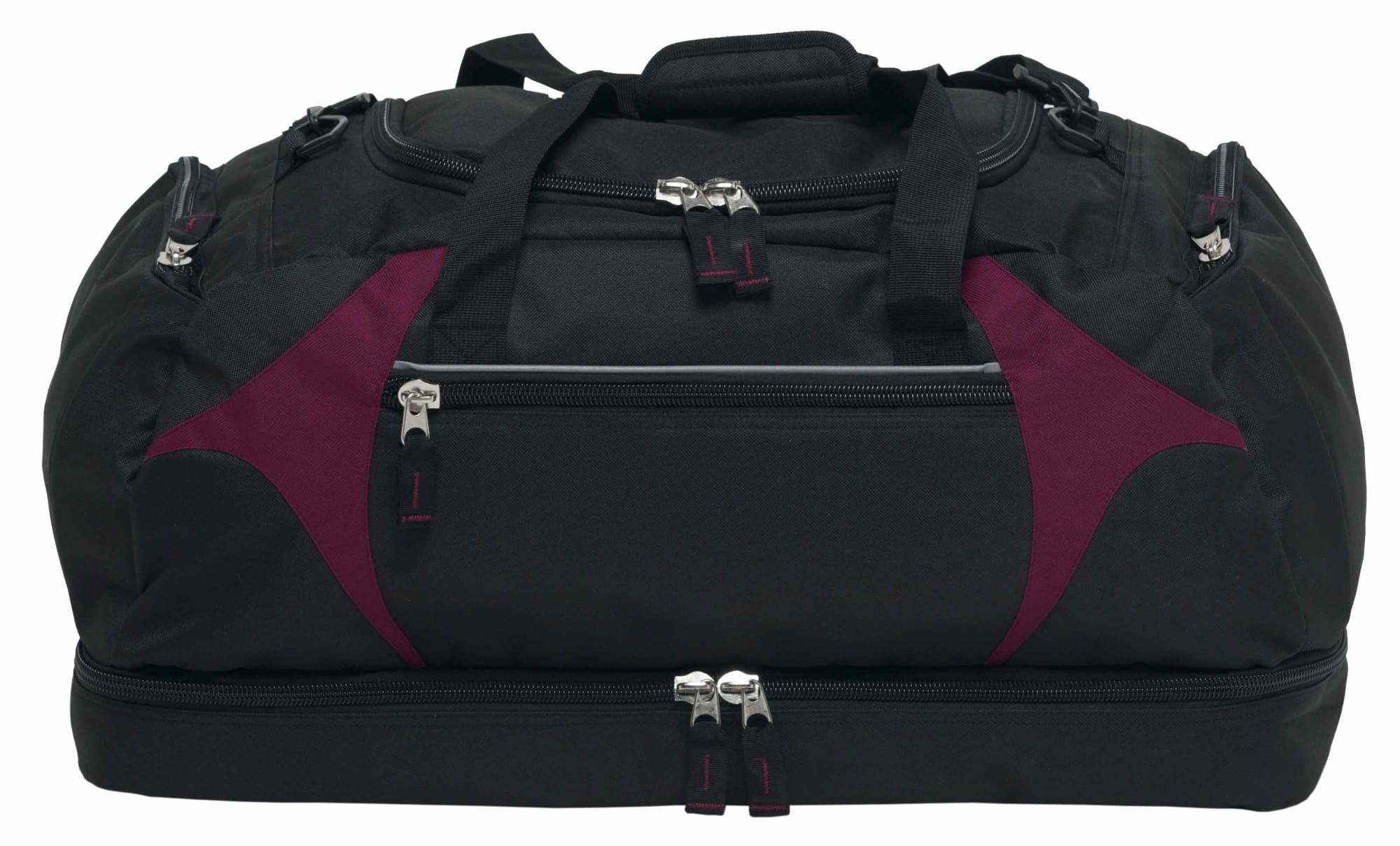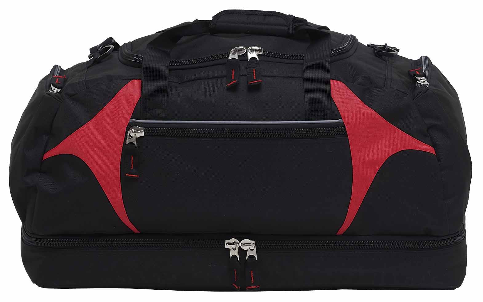 600D polyester with latex rubber backing|Huge main compartment with U-shaped zippered opening|Quick stash zippered front pocket with reflective piping|Two zippered end compartments|Drop bottom zippered compartment|Detachable/adjustable padded shoulder strap|Velcro wrap carry handle for comfortable grip|Heavy duty zippers and accessories|Rubber feet for added protection|Capacity: 55 Litres
