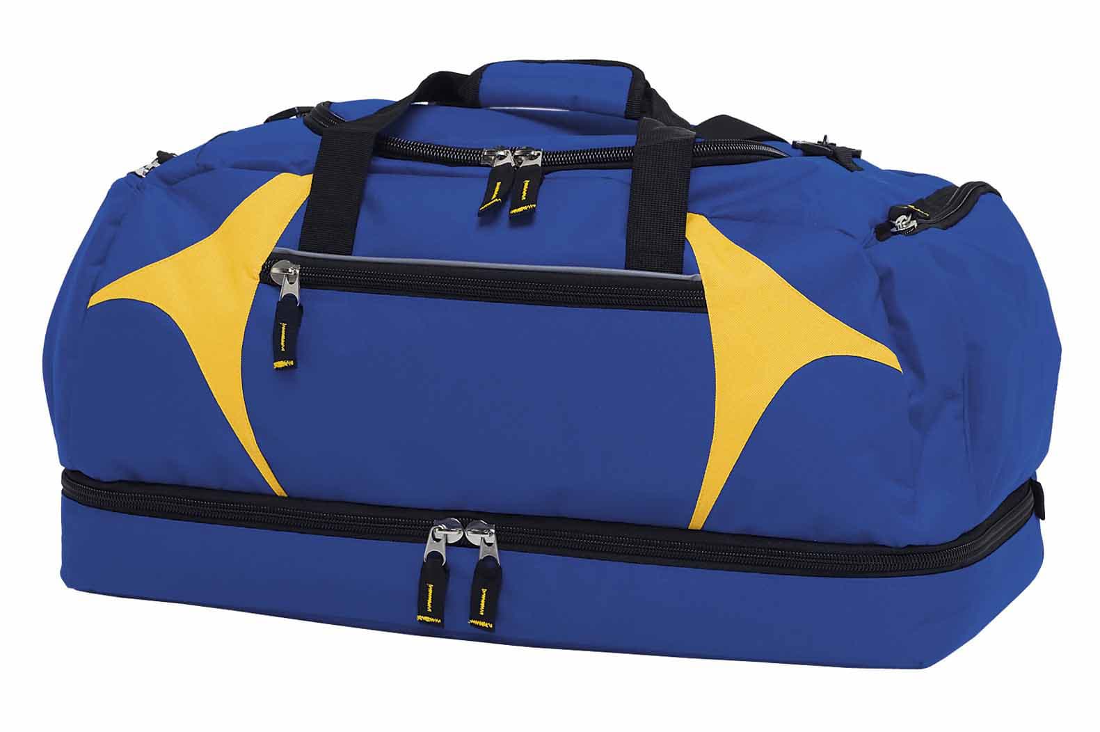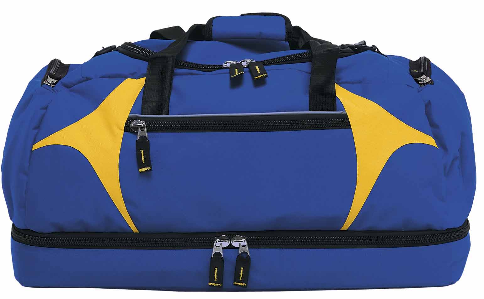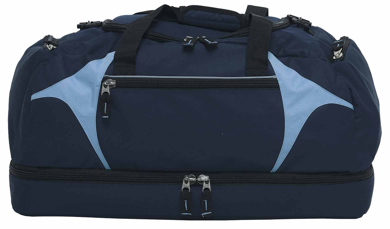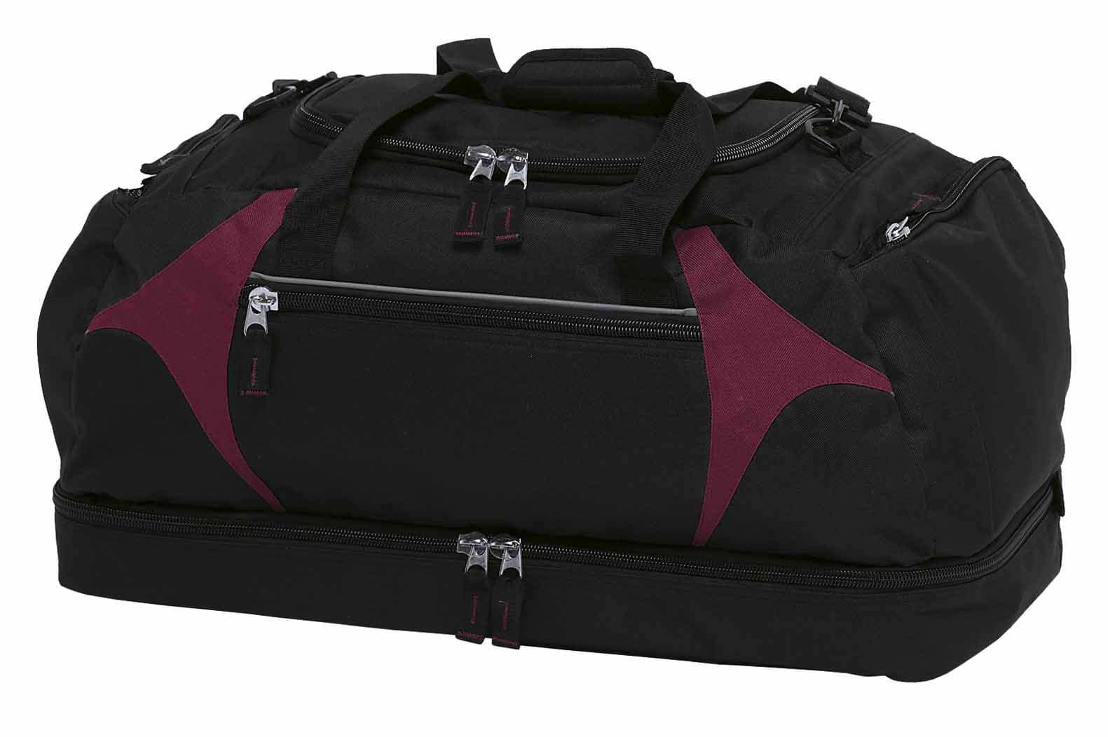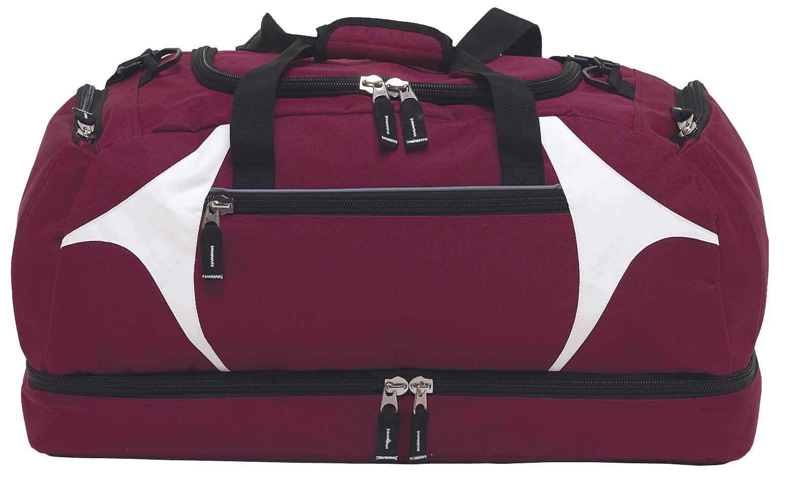 600D polyester with latex rubber backing|Huge main compartment with U-shaped zippered opening|Quick stash zippered front pocket with reflective piping|Two zippered end compartments|Drop bottom zippered compartment|Detachable/adjustable padded shoulder strap|Velcro wrap carry handle for comfortable grip|Heavy duty zippers and accessories|Rubber feet for added protection|Capacity: 55 Litres